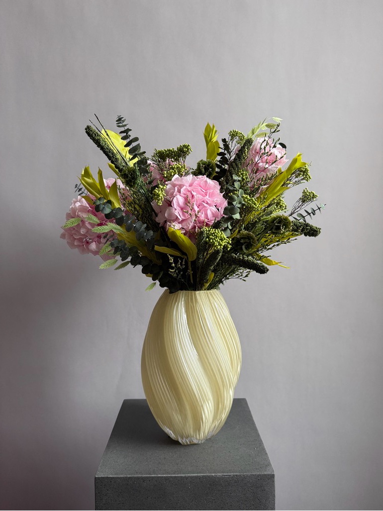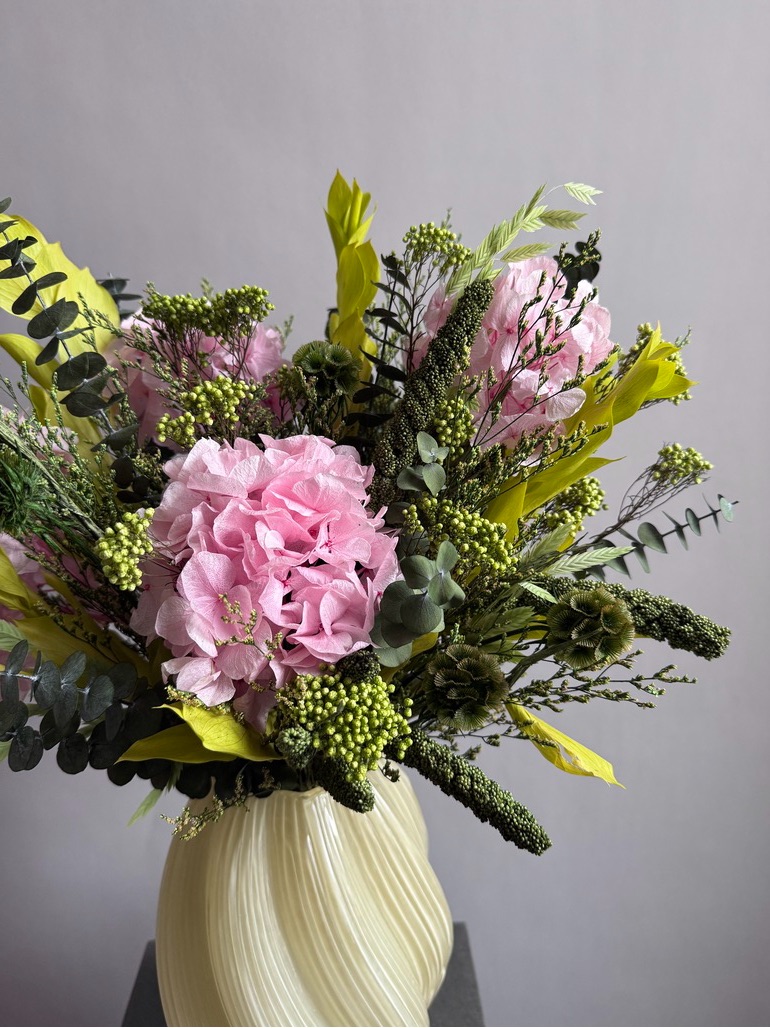 Состав: гортензия стабилизированная, эвкалипт Бейби Блю, озотамнус, сетария, хасмантиум, рускус, кермек, скабиоза