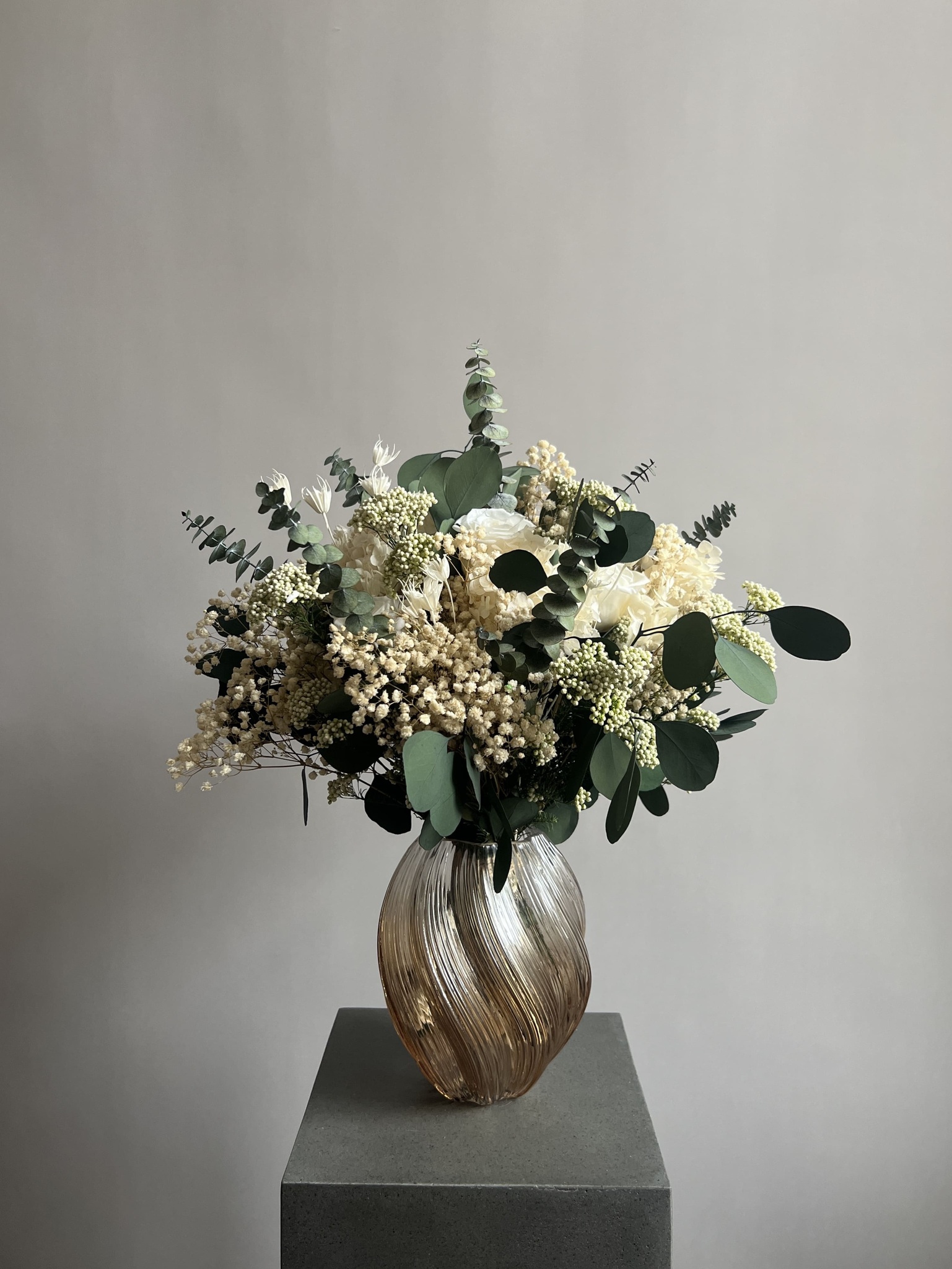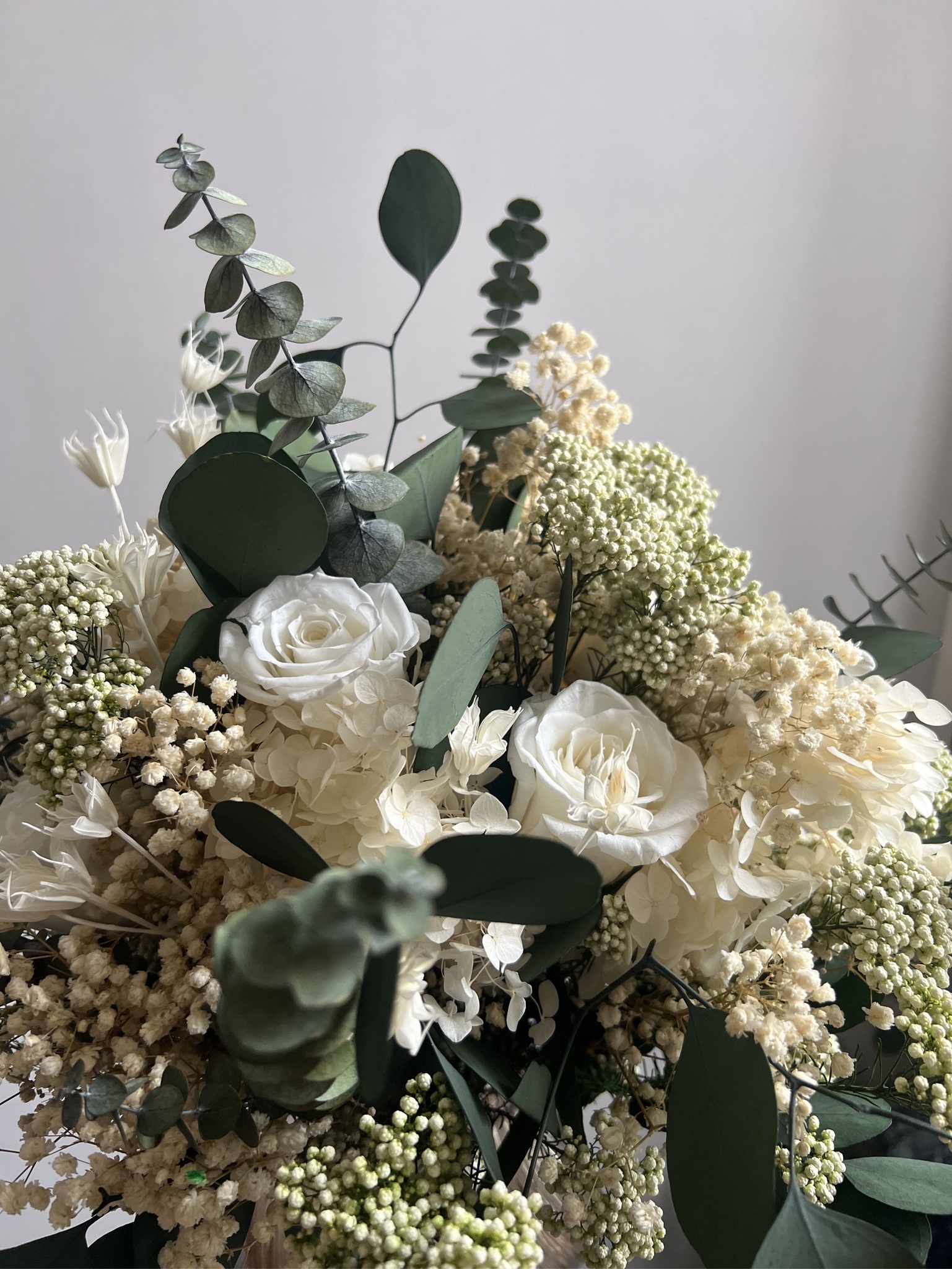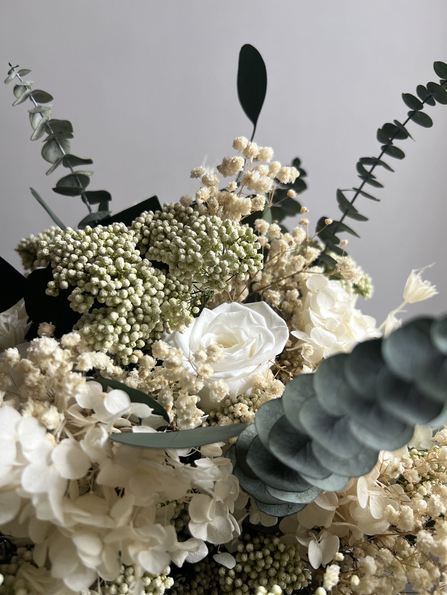 Состав: розы стабилизированные 5 шт, гортензия, озотамнус, эвкалипт стабилизированный, нигелла, гипсофила