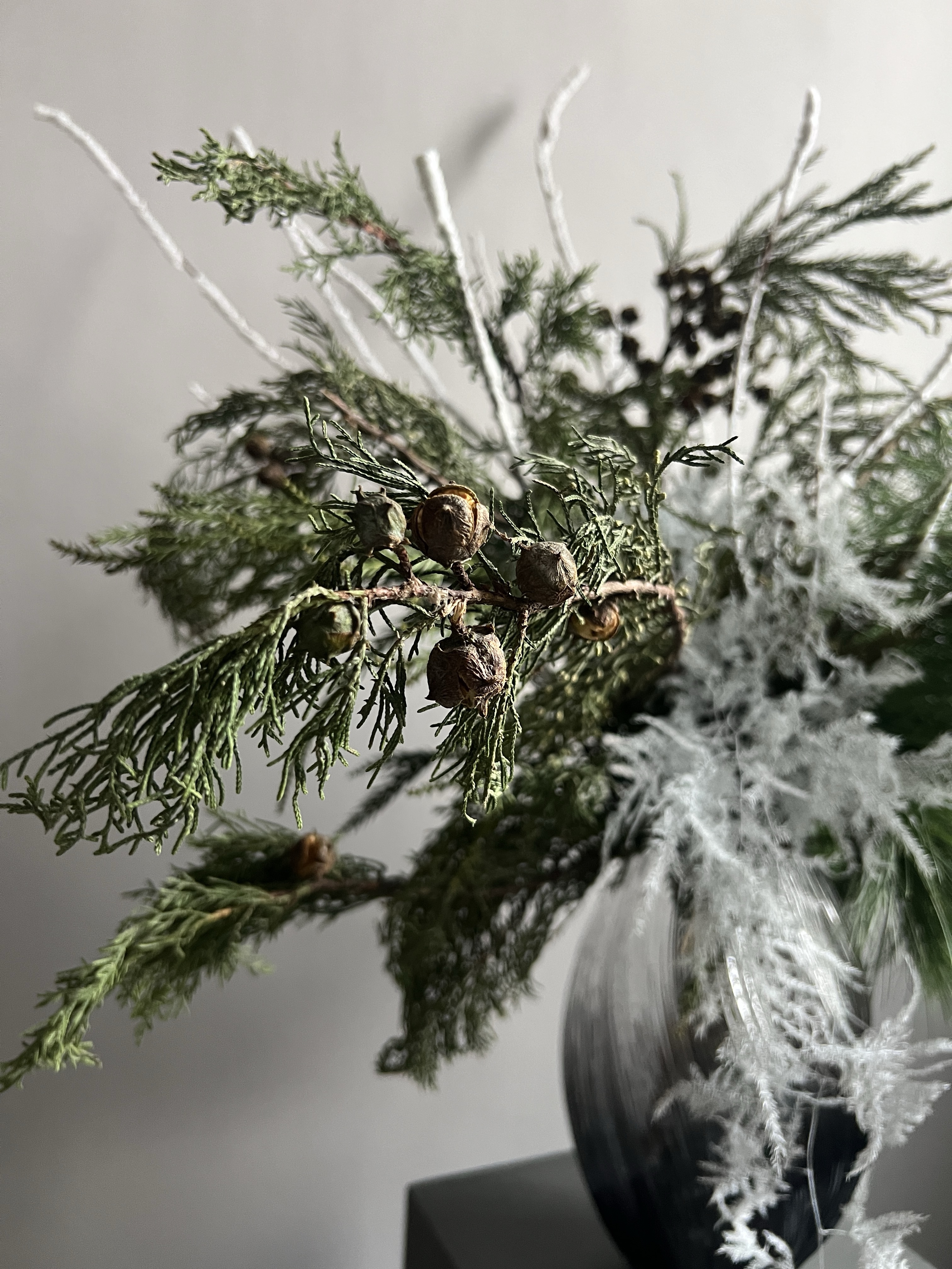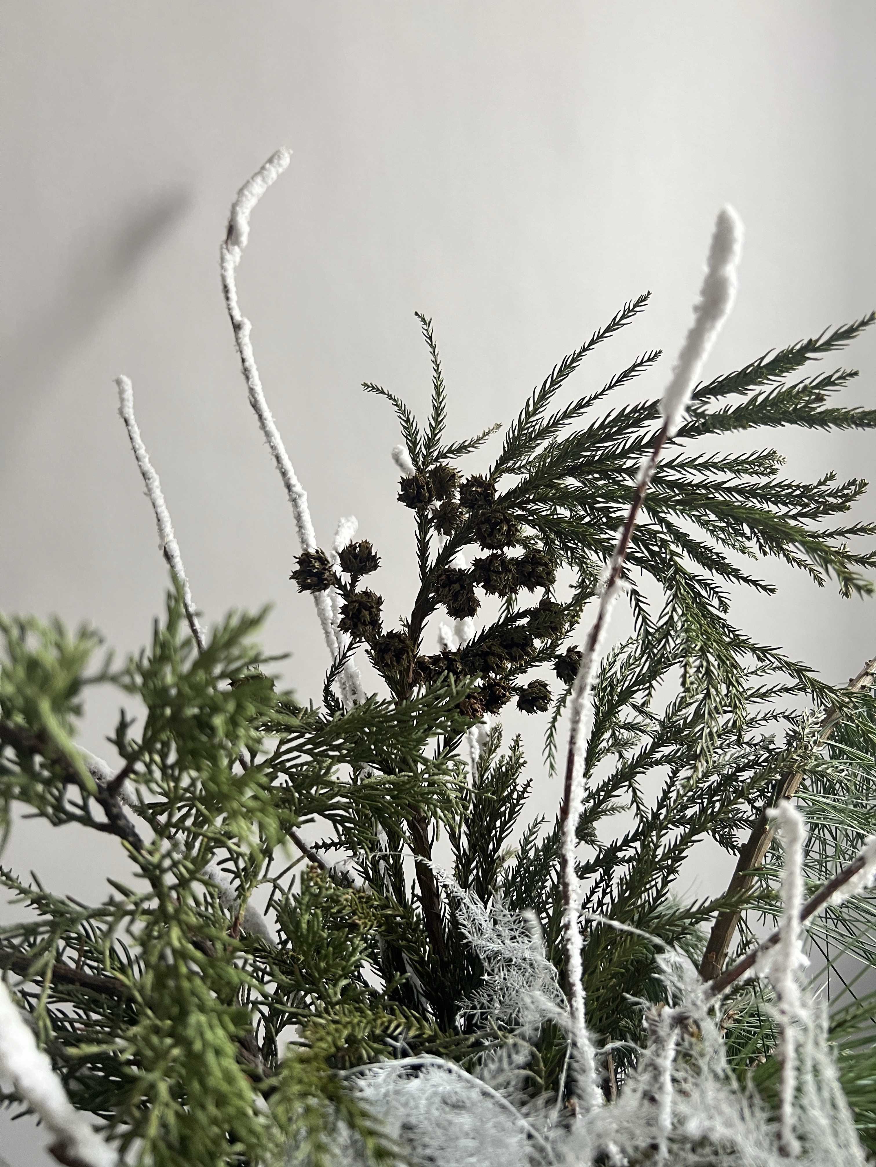 Состав: Сосна пинус, кипарис с плодами, мережка, аспарагус Veren белый, ветка снежная Berk Snow