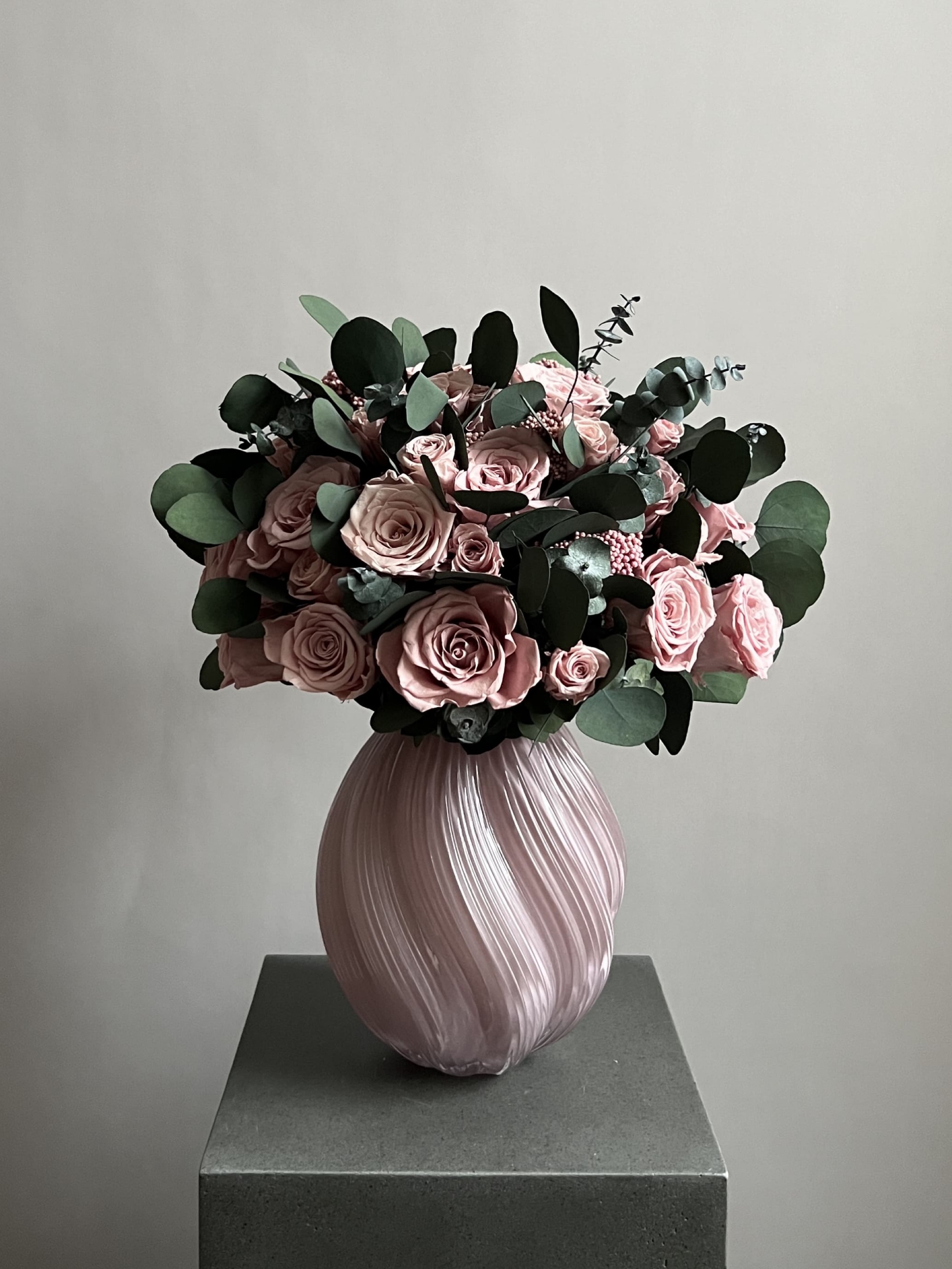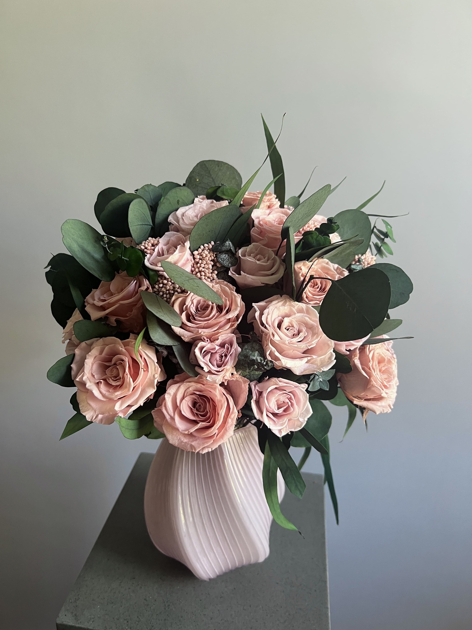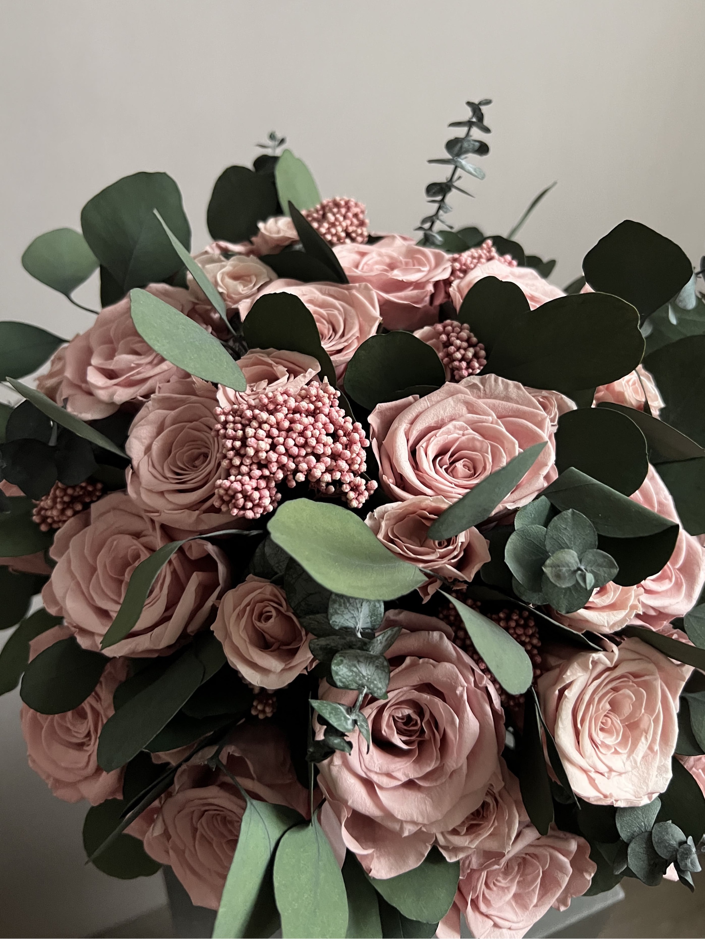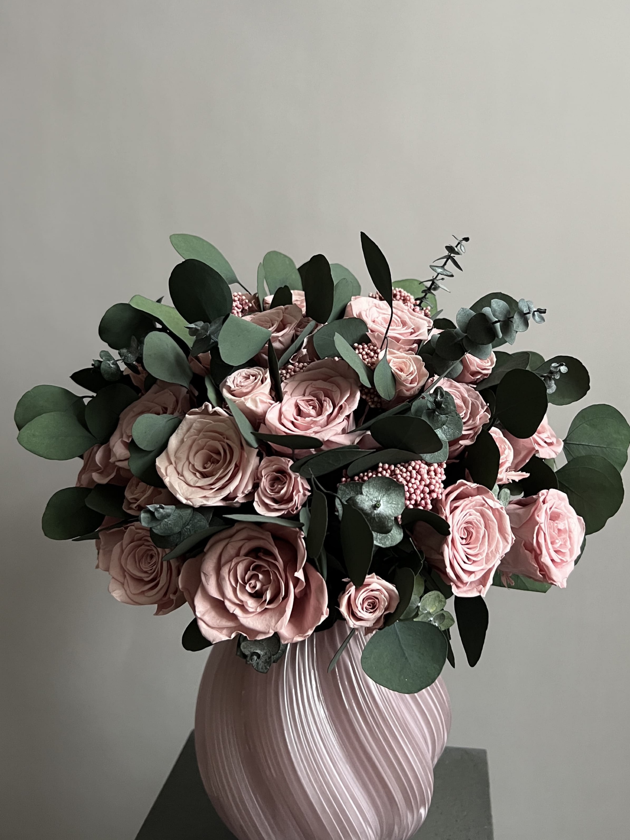 Состав: розы стабилизированные классические в 3х размерах - 47 шт, эвкалипт Популс, Николи Бейби, озотамнус