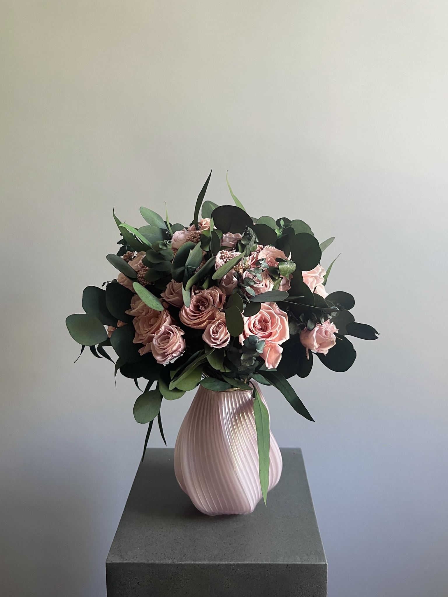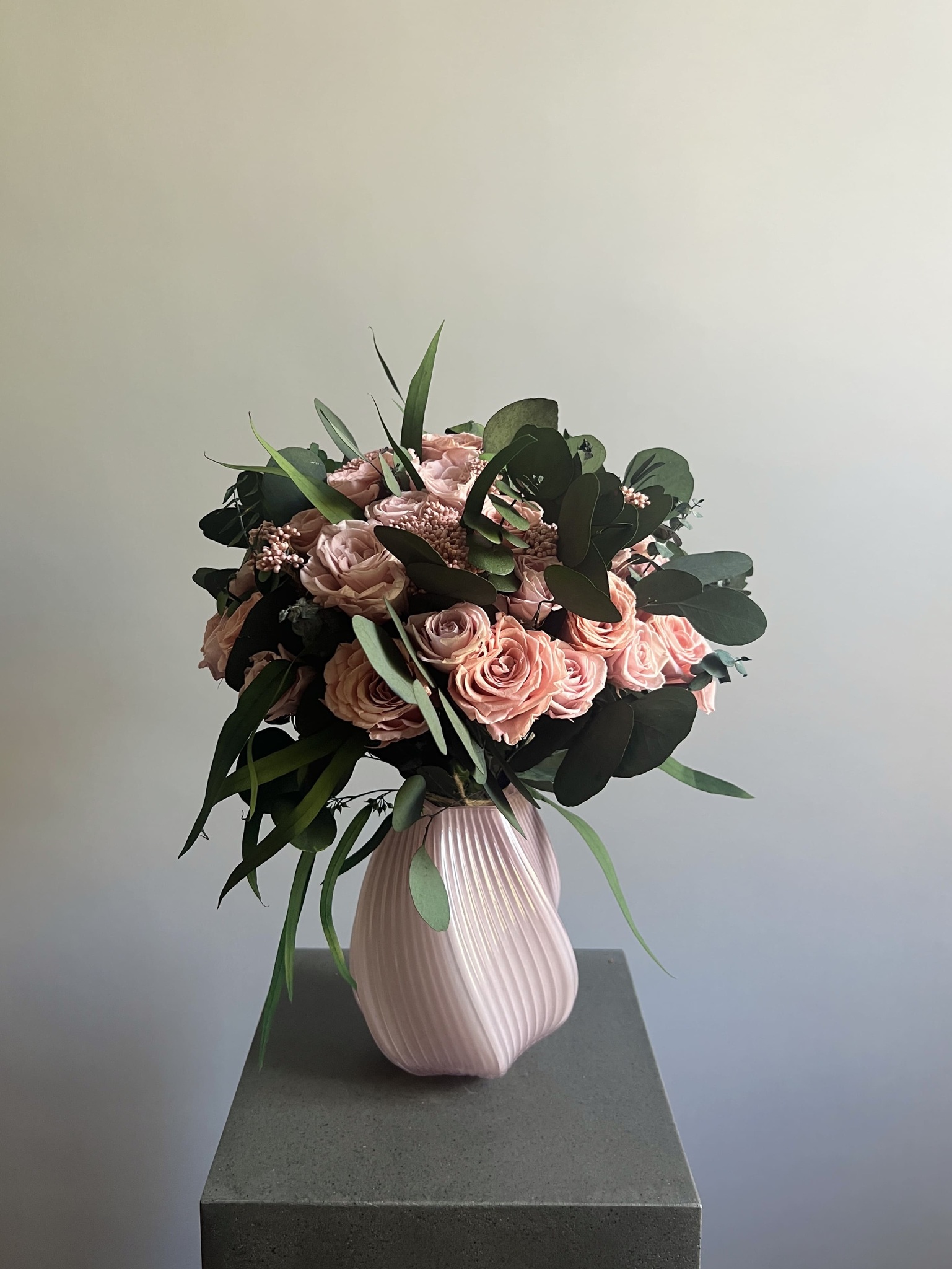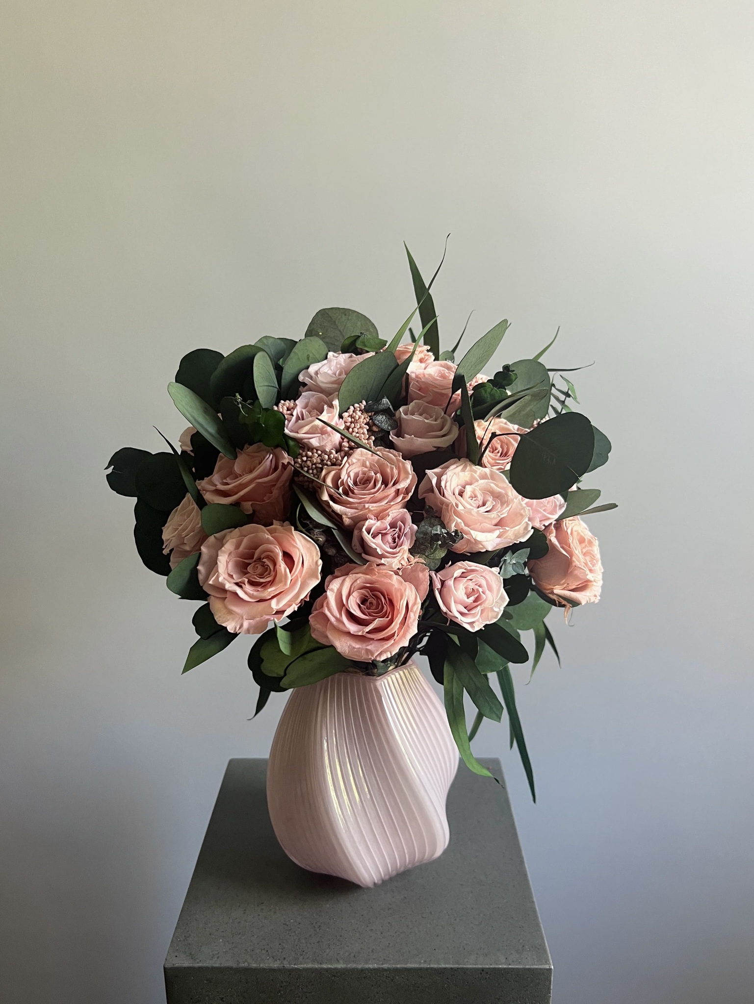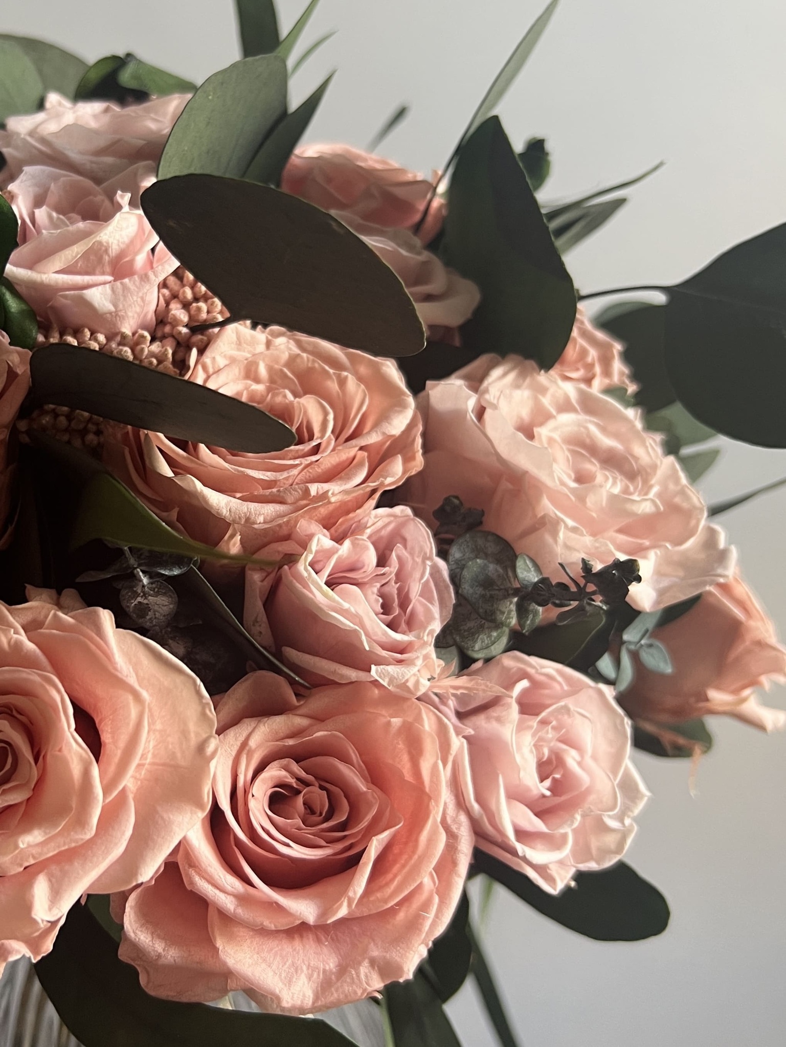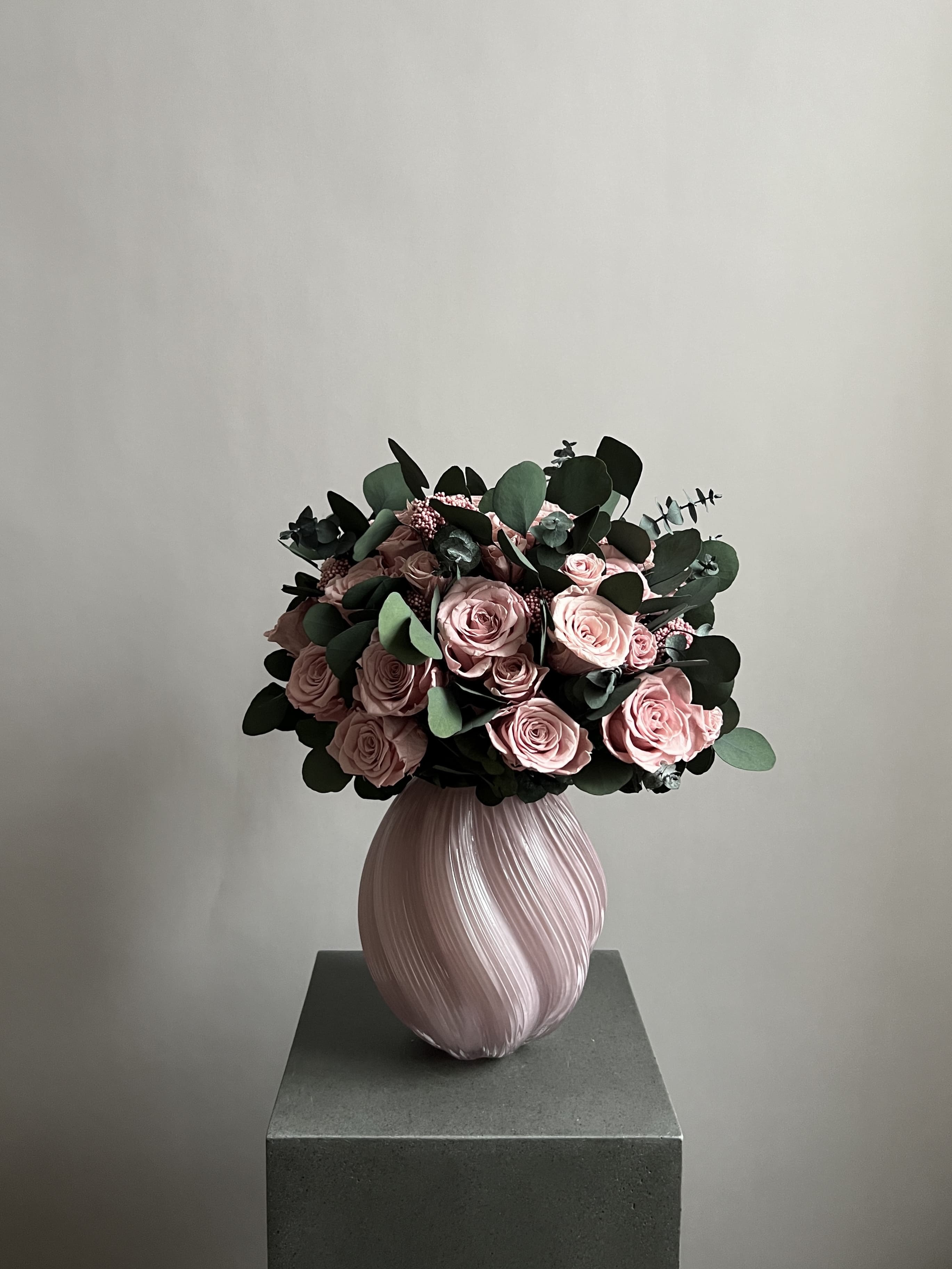 Состав: розы стабилизированные классические в 3х размерах - 47 шт, эвкалипт Популс, Николи Бейби, озотамнус