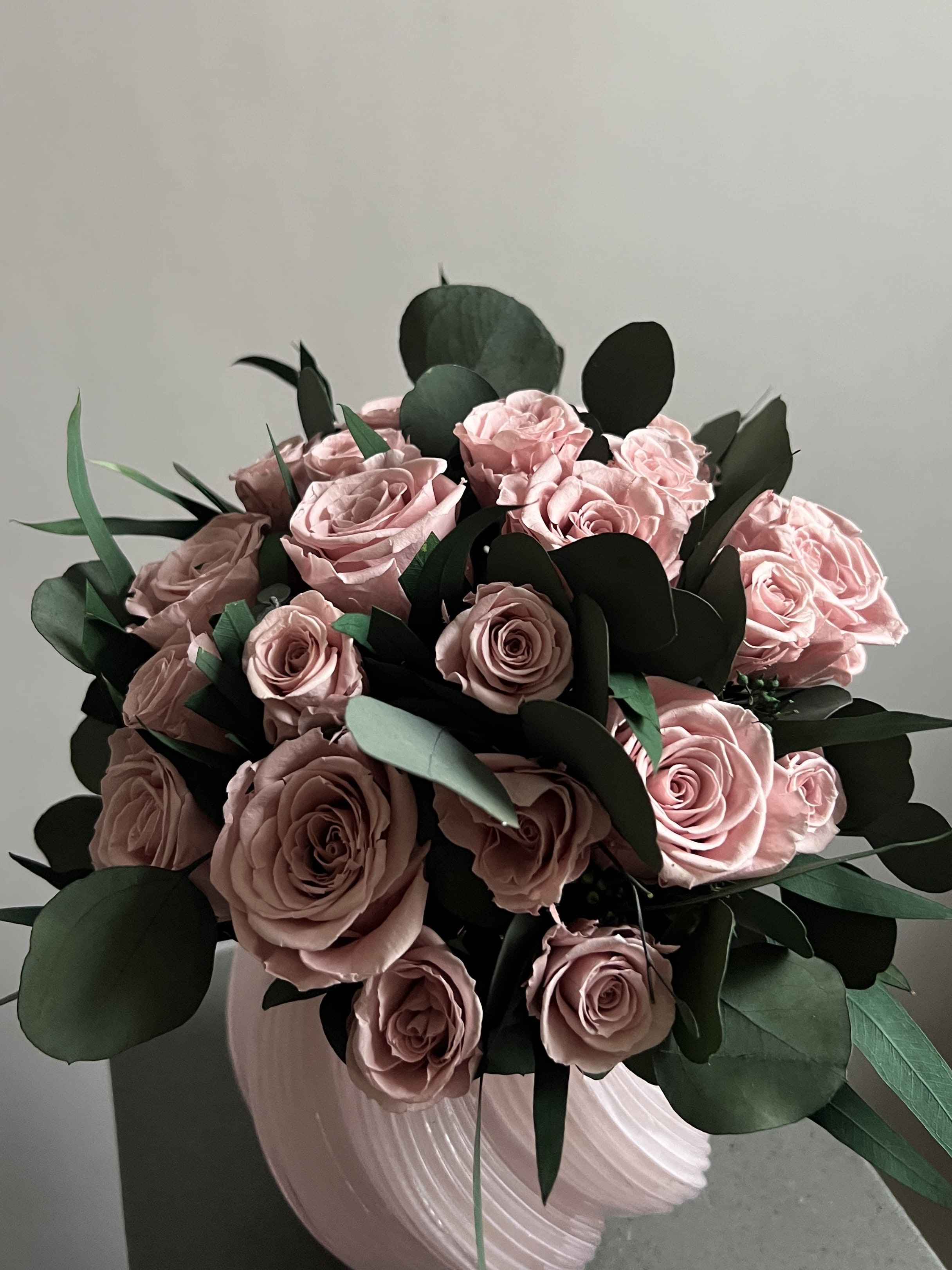 Состав: розы стабилизированные классические в 2х размерах - 31 шт, эвкалипт Популс, Николи Бейби.