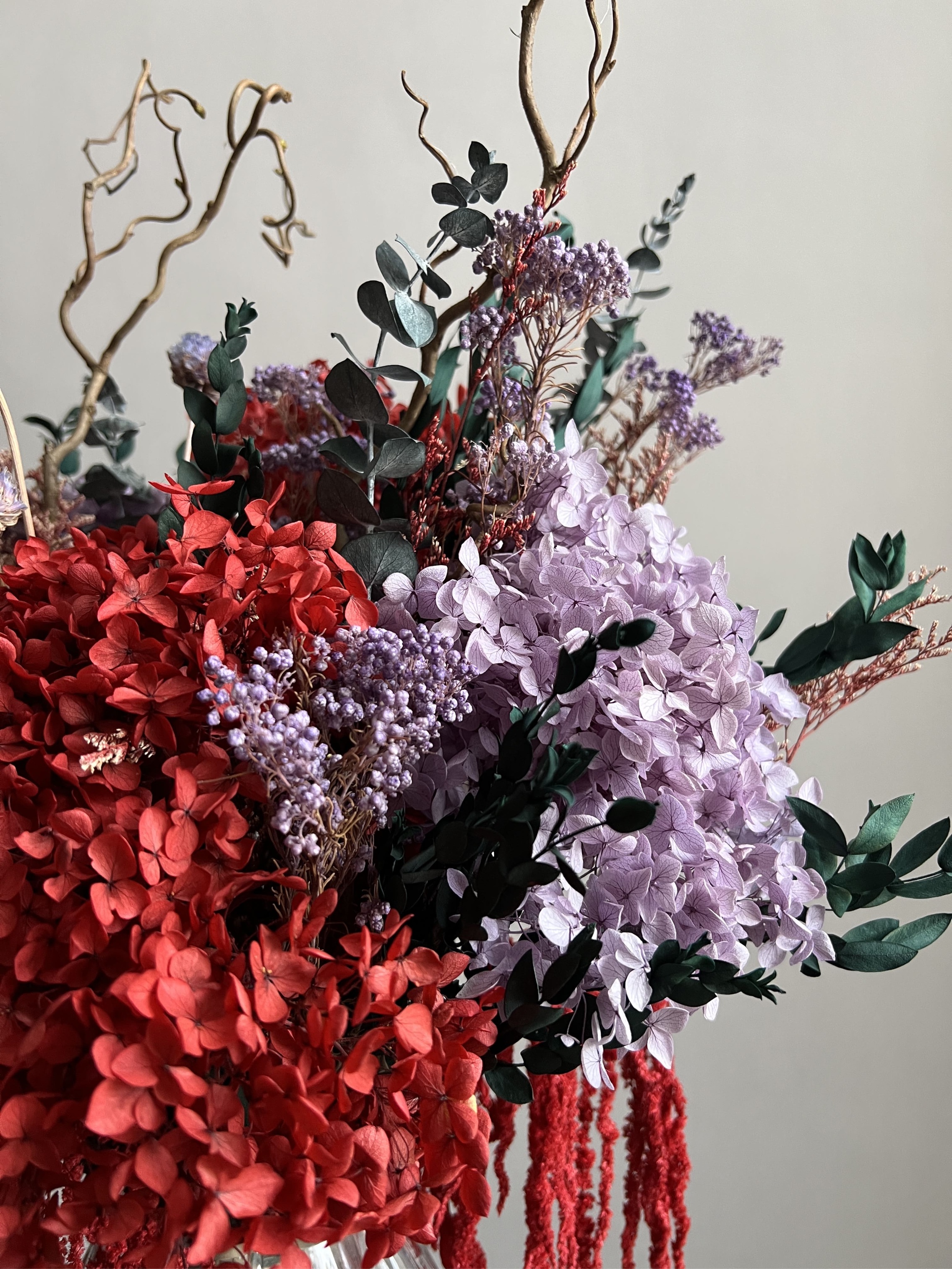 Состав: гортензия стабилизированная, эвкалипт парвифолия, эвкалипт бейби блю, корилус, скабиоза кустовая, озотамнус, амарант, кермек