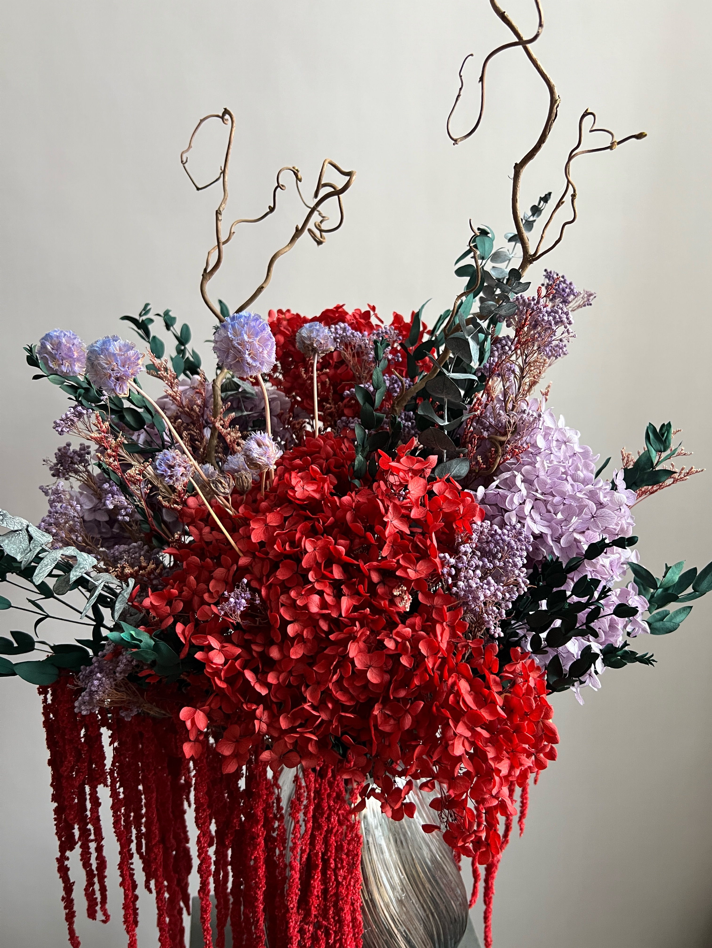 Состав: гортензия стабилизированная, эвкалипт парвифолия, эвкалипт бейби блю, корилус, скабиоза кустовая, озотамнус, амарант, кермек