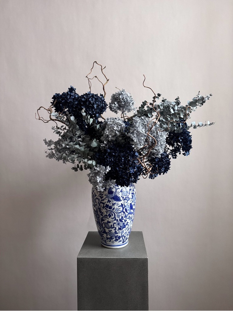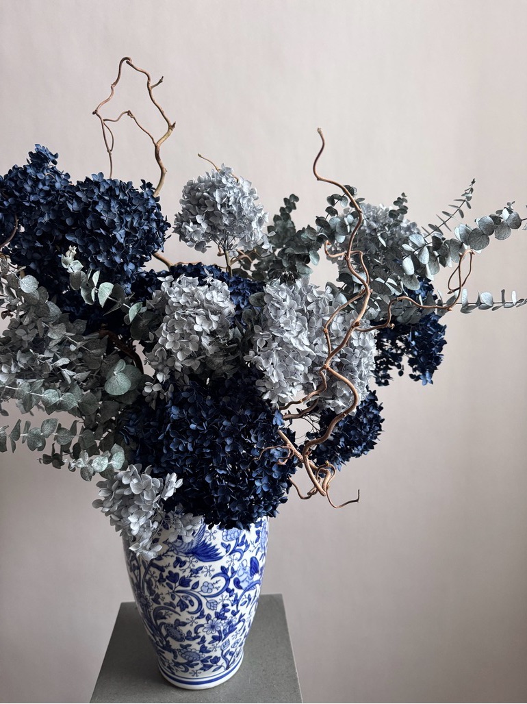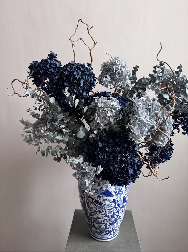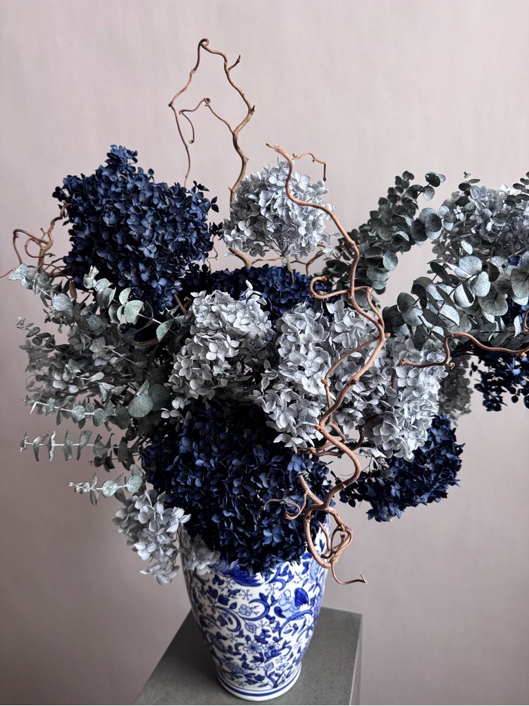 Состав: гортензия стабилизированная синяя, гортензия стабилизированная серая, эвкалипт стабилизированный, ветки корилуса