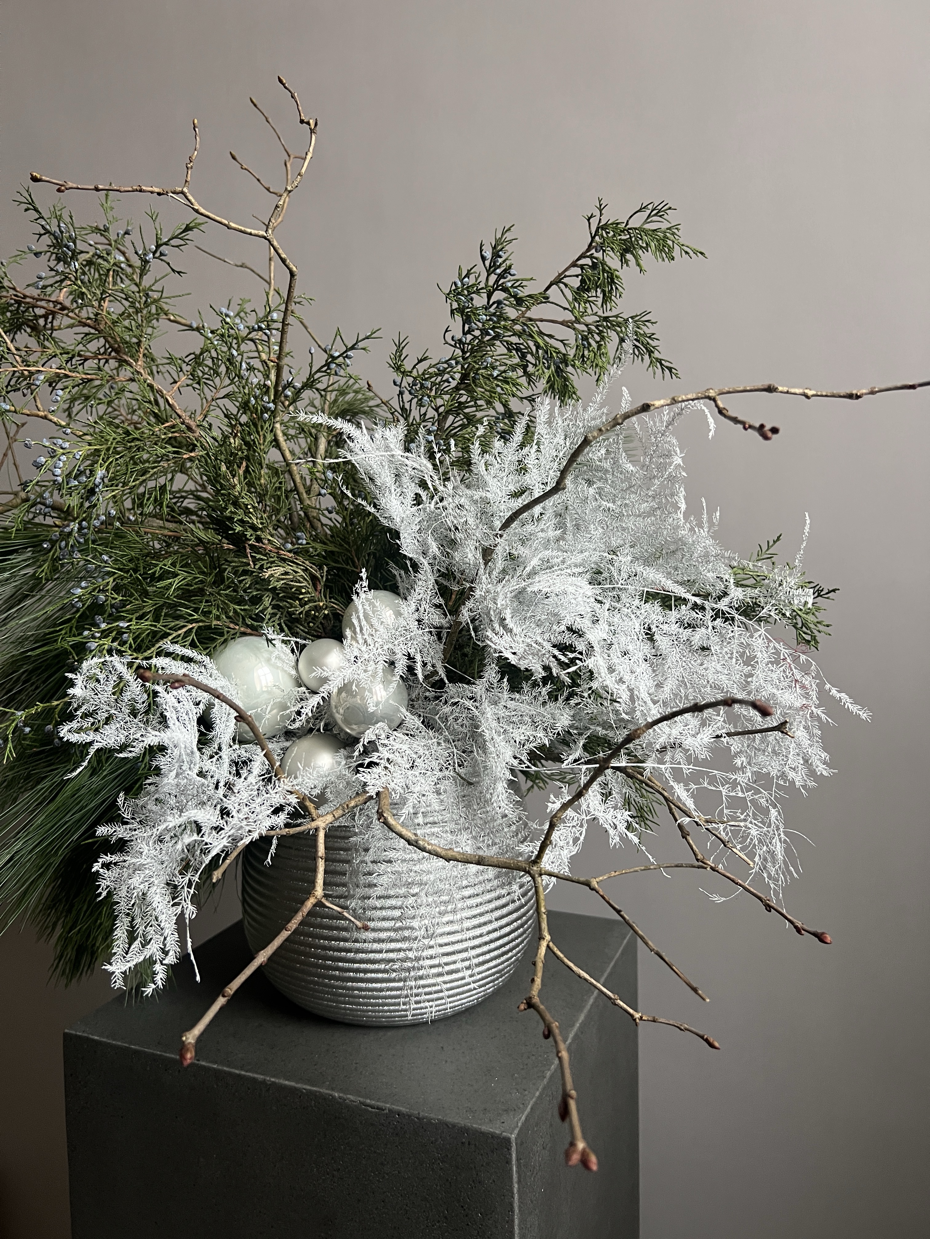 Состав: Сосна пинус, можжевельник, аспарагус Veren white, елочные игрушки шары, ветки сухоцвет, сосульки, керамическое кашпо