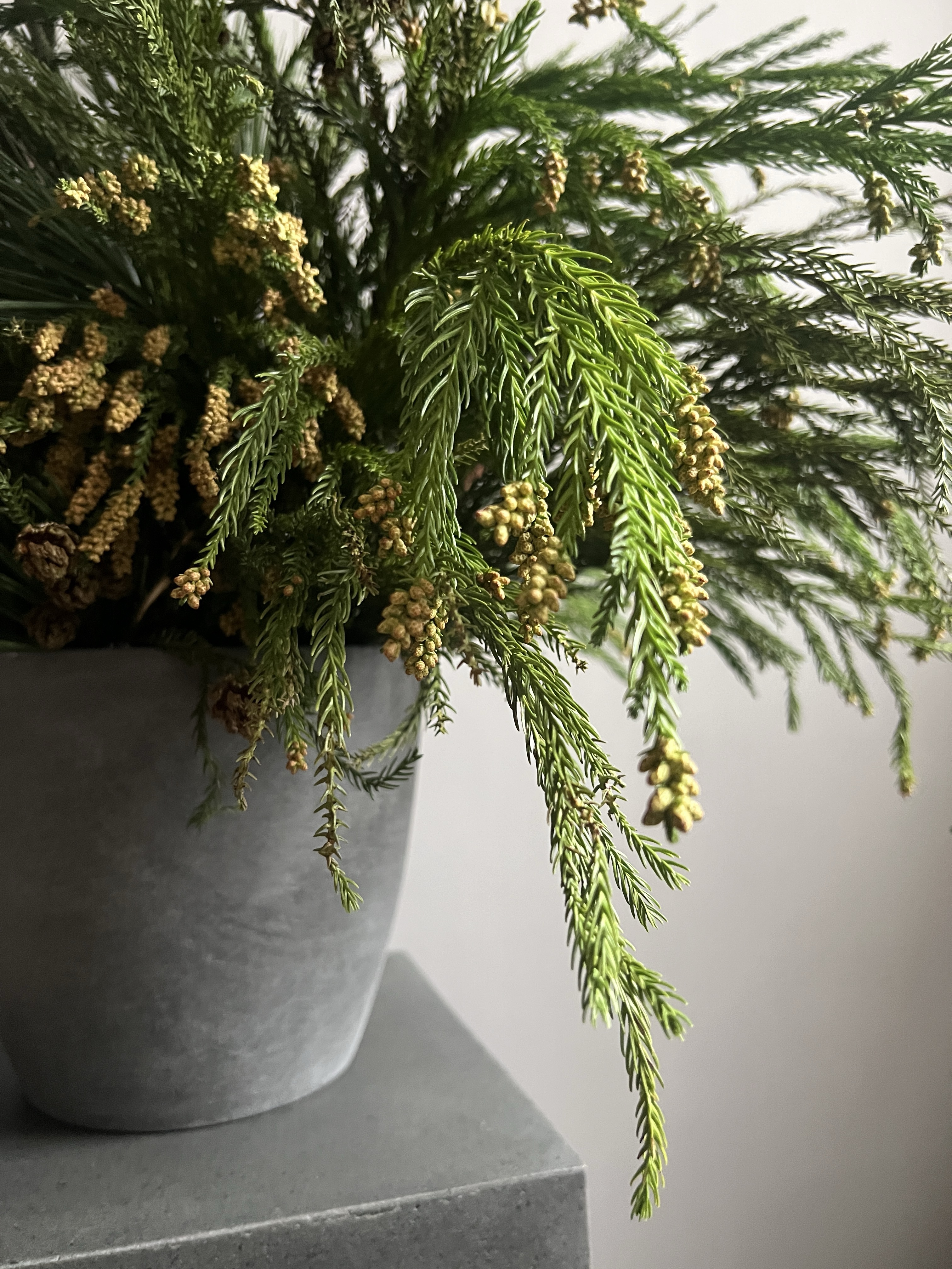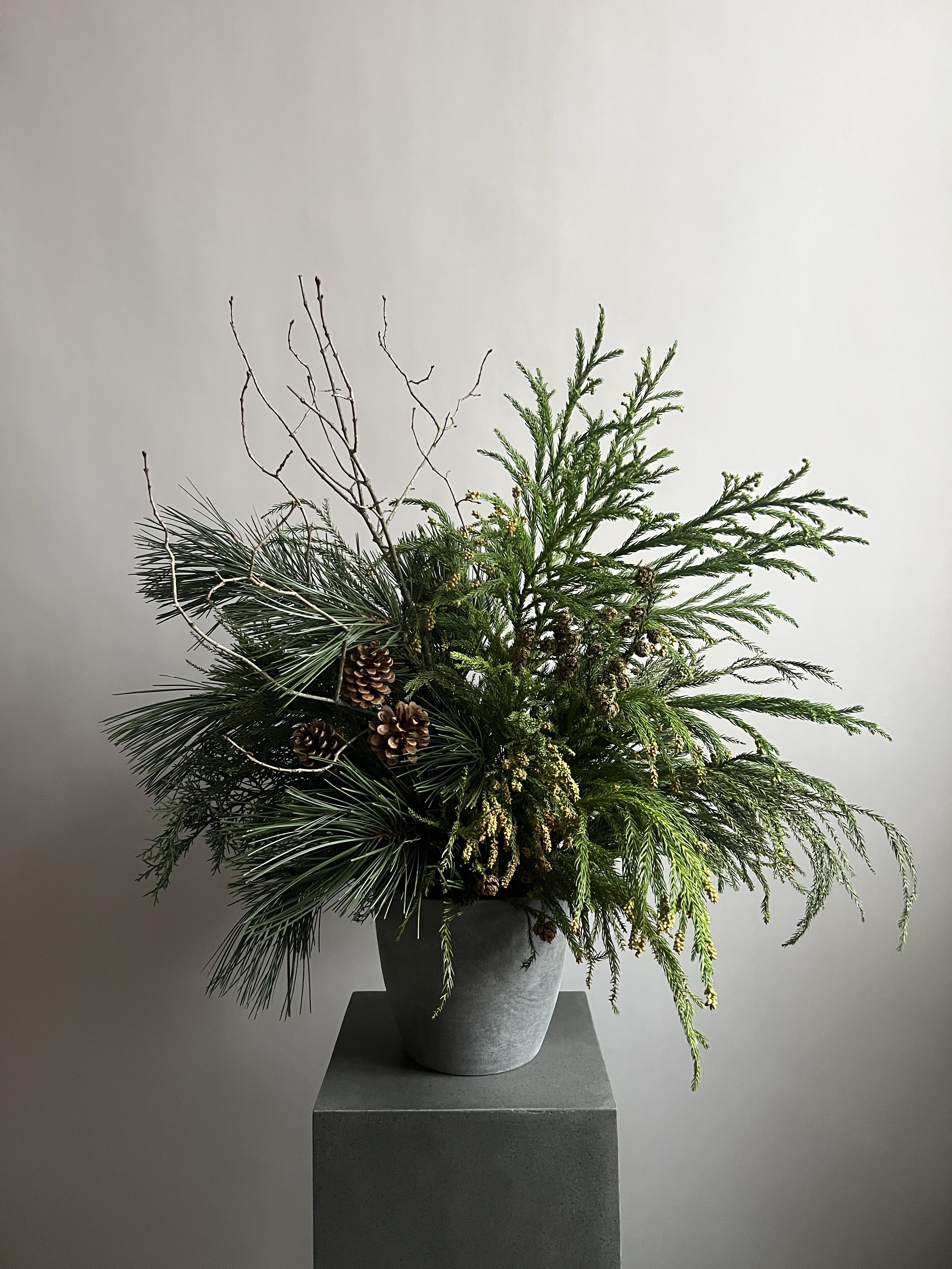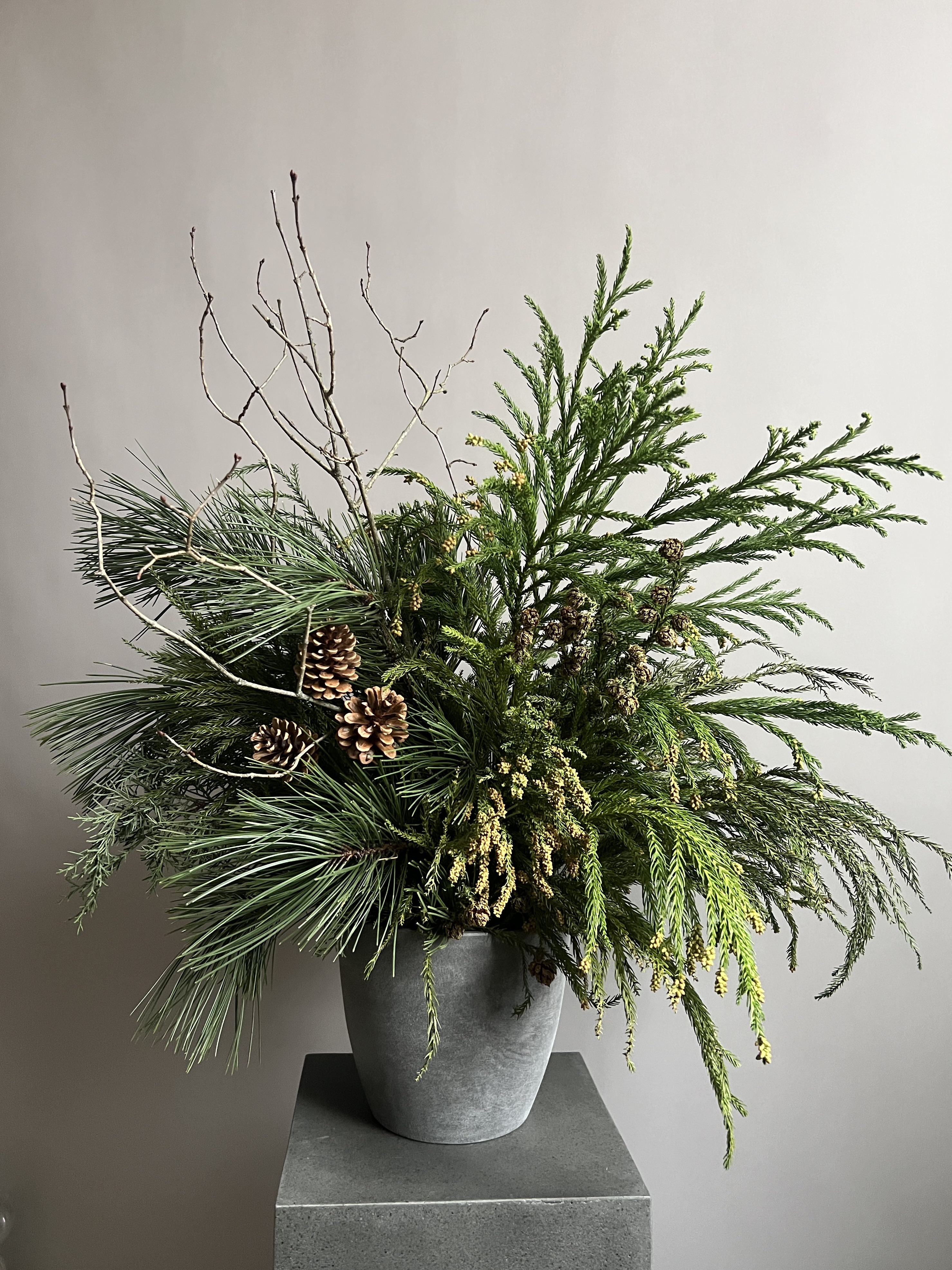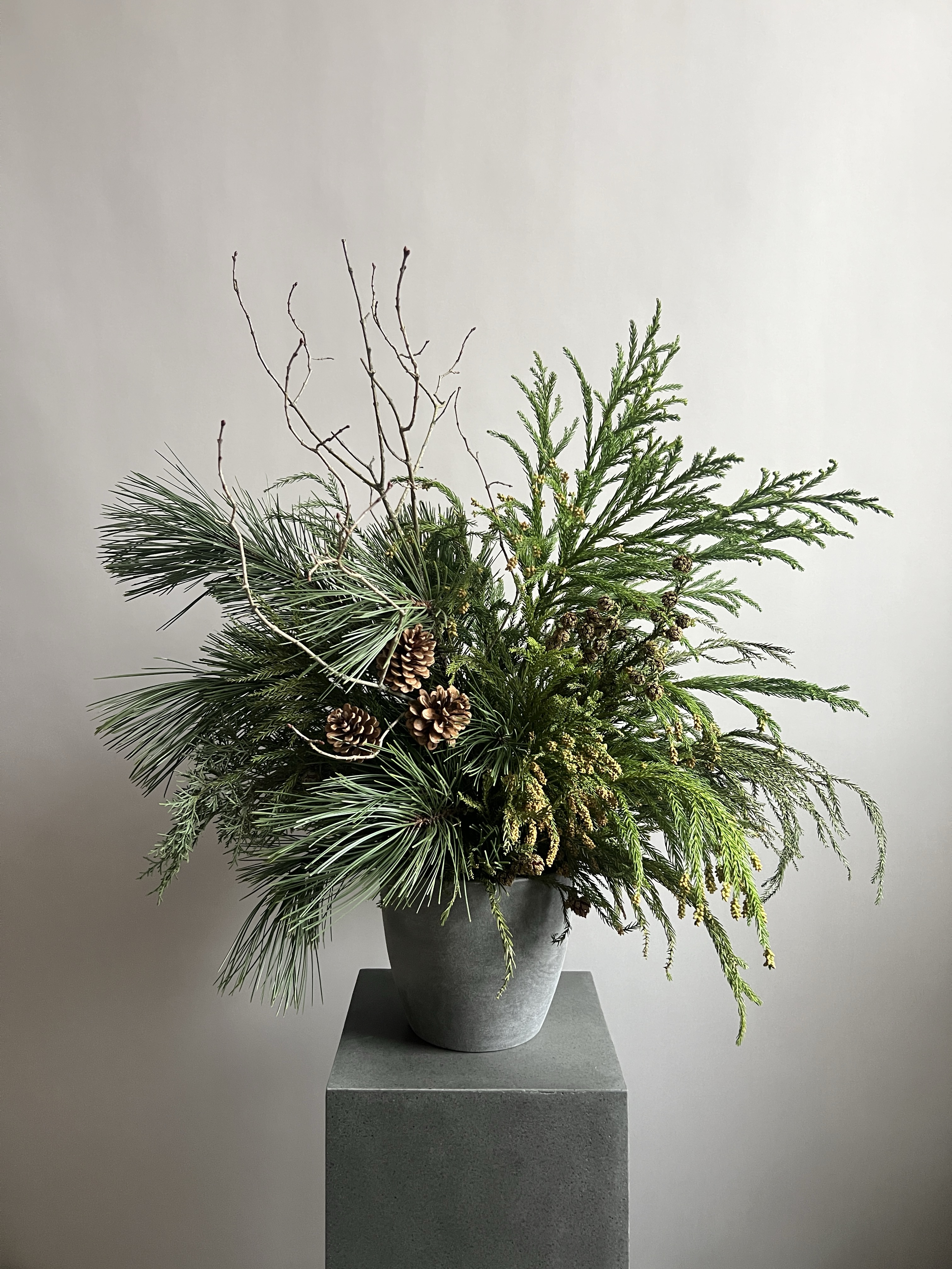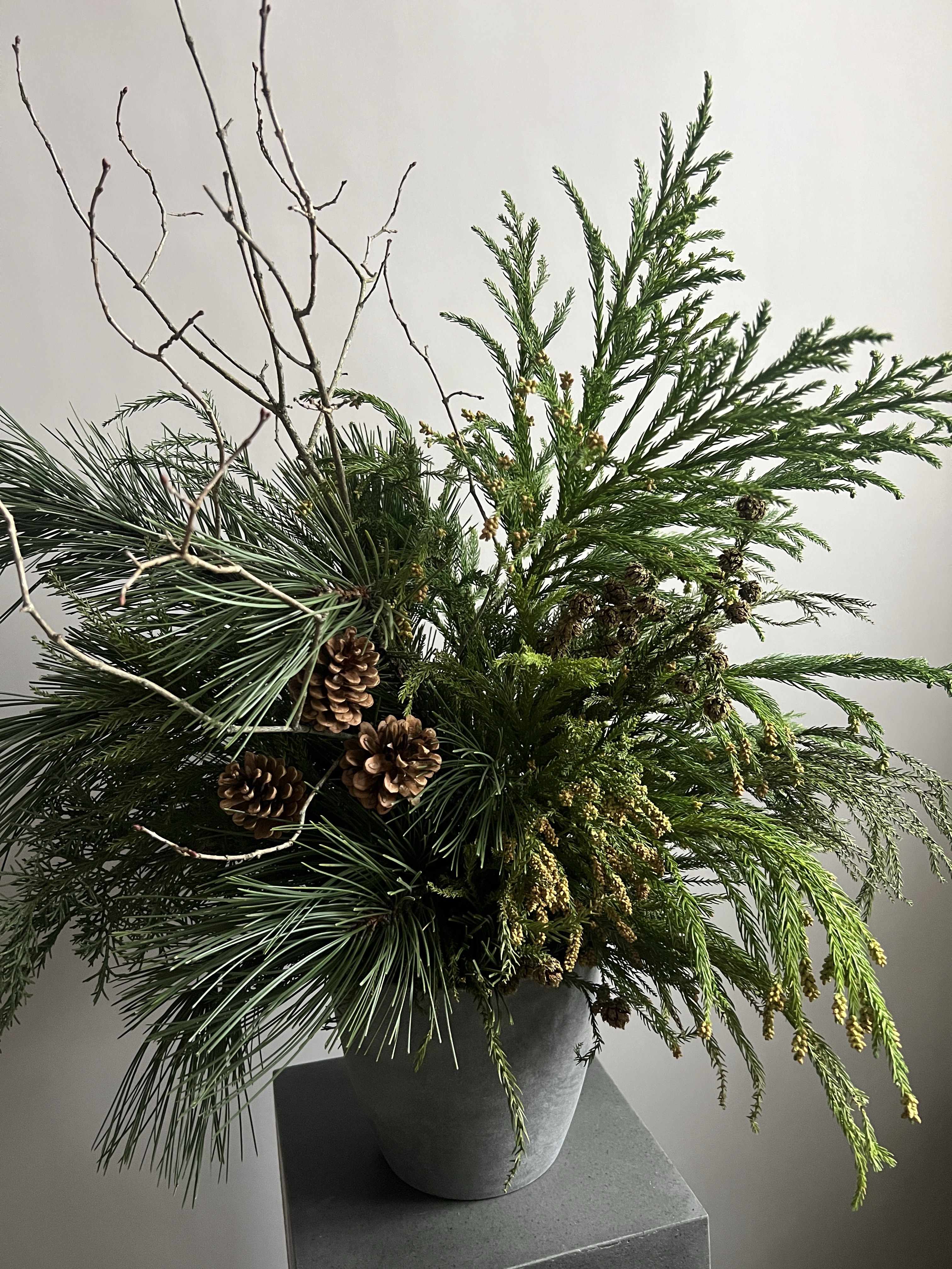 Состав: Сосна пинус, мережка, кипарис, ветки сухоцвет, шишки, керамическое кашпо