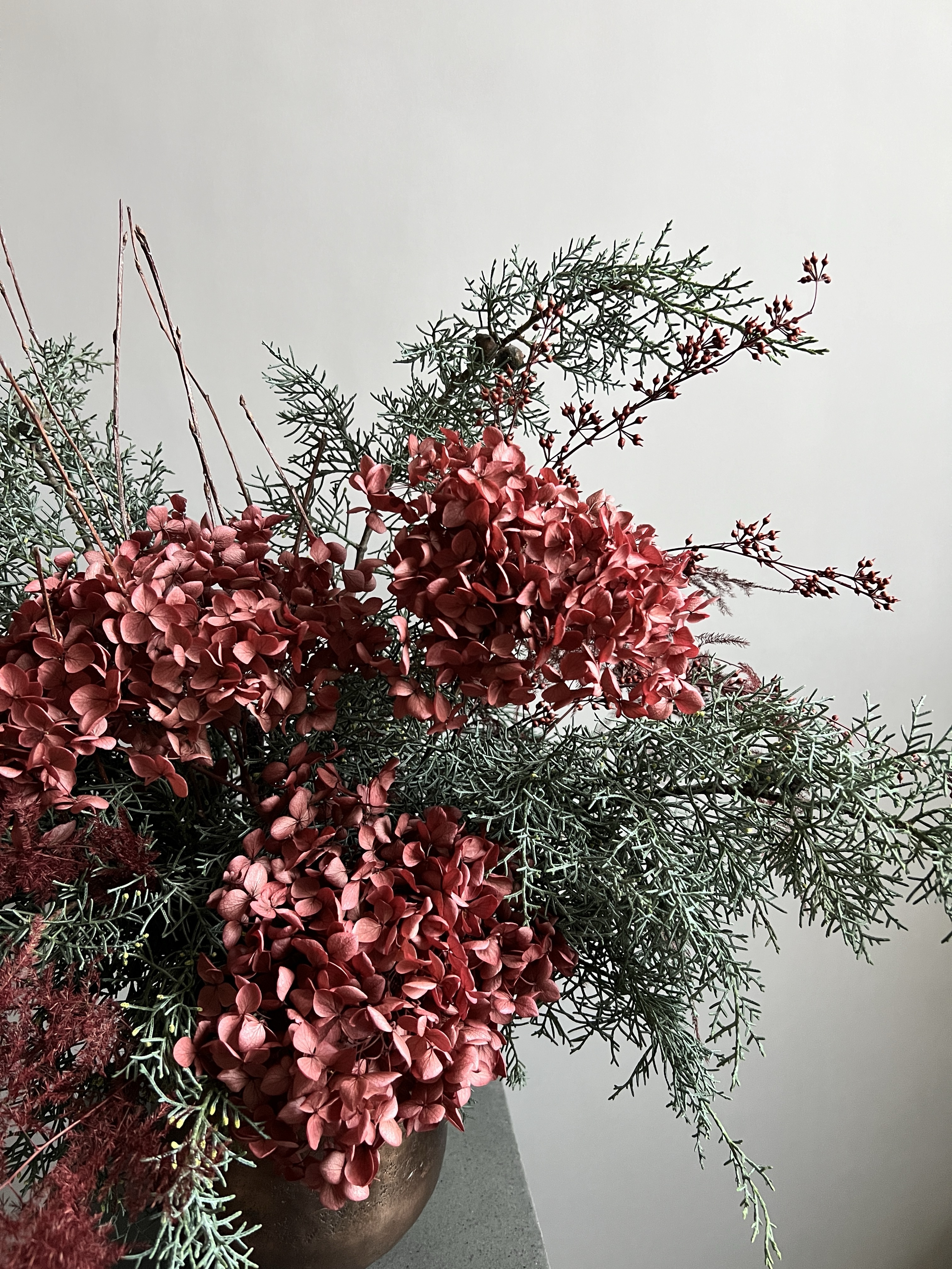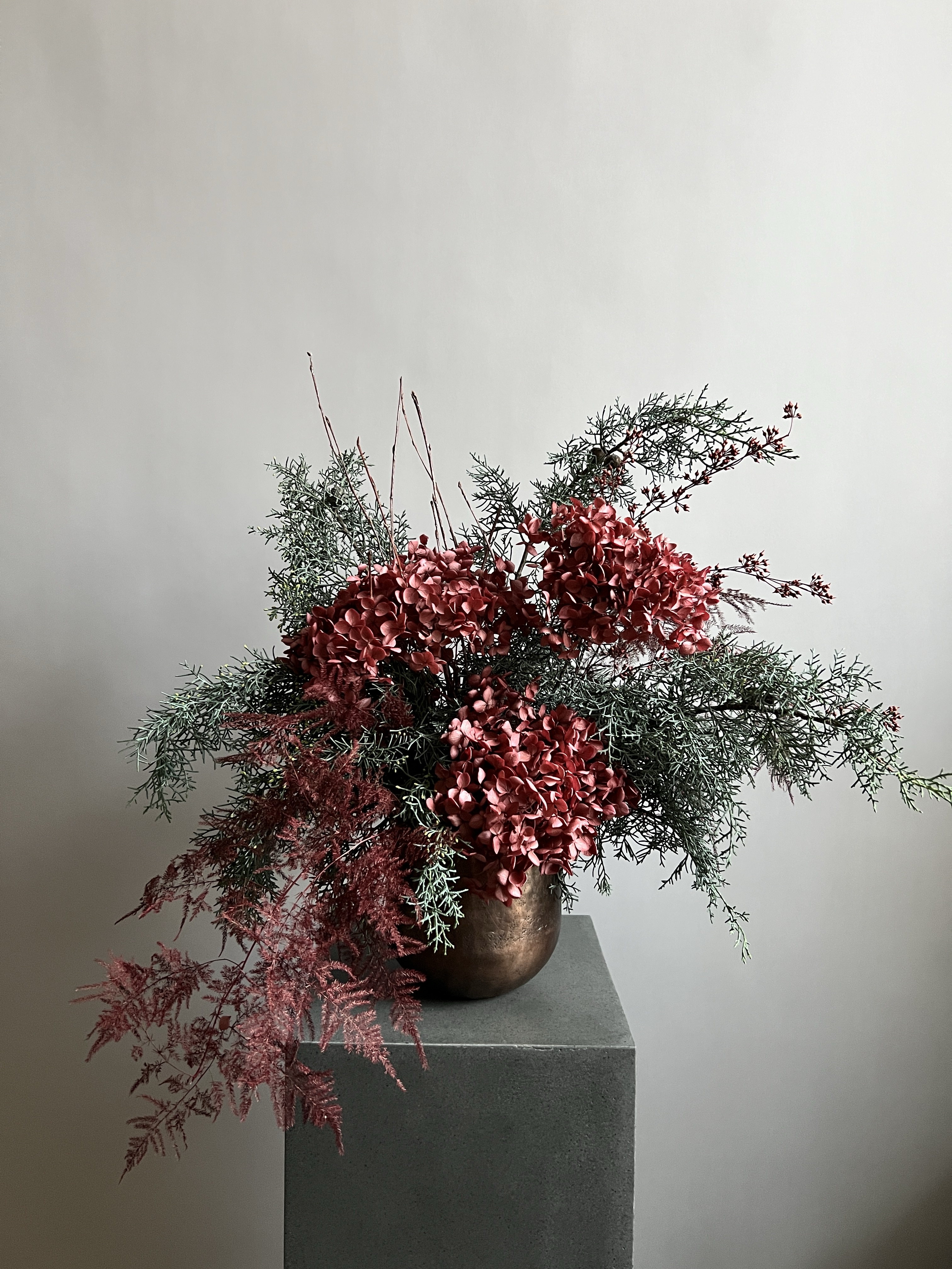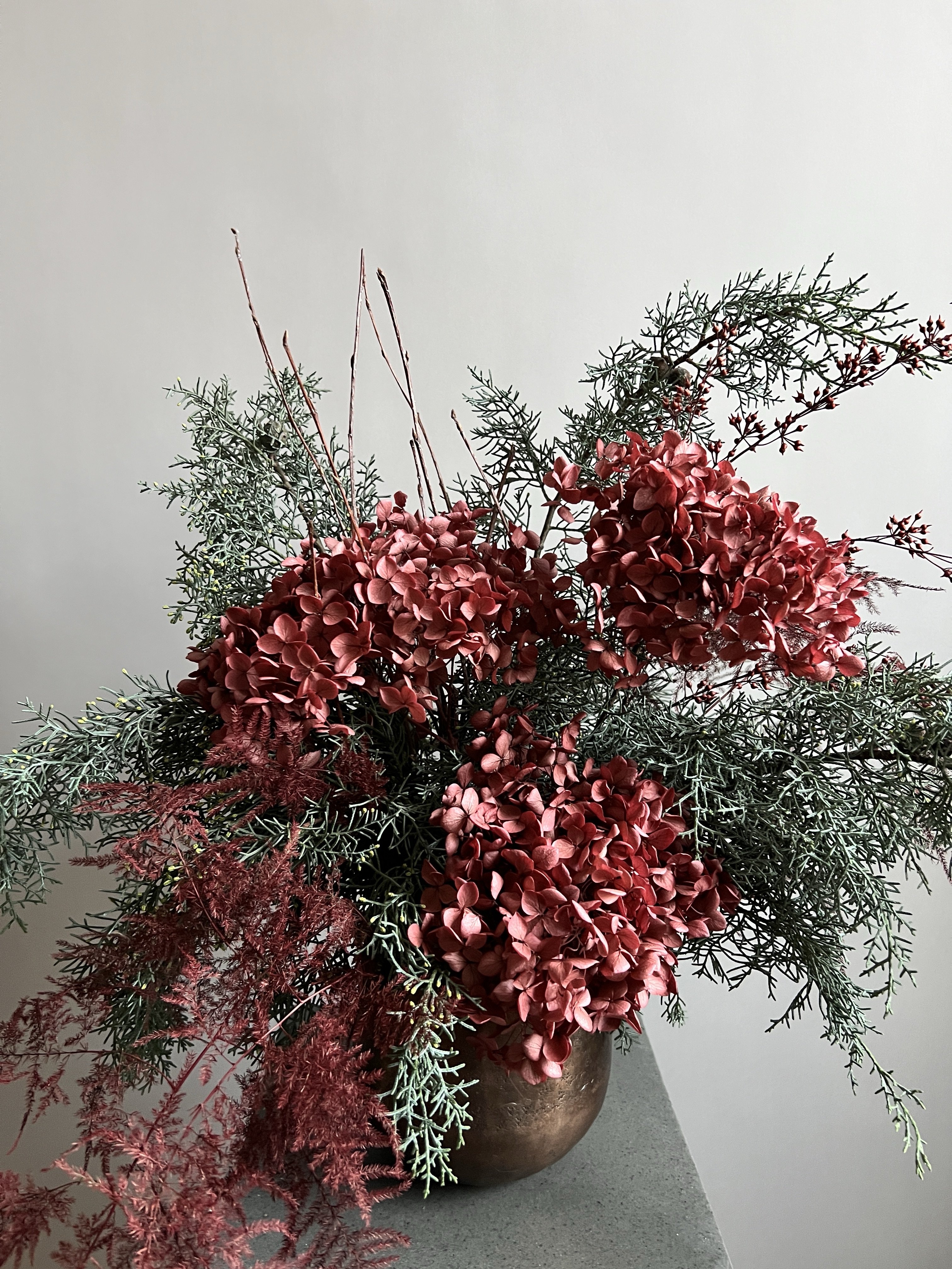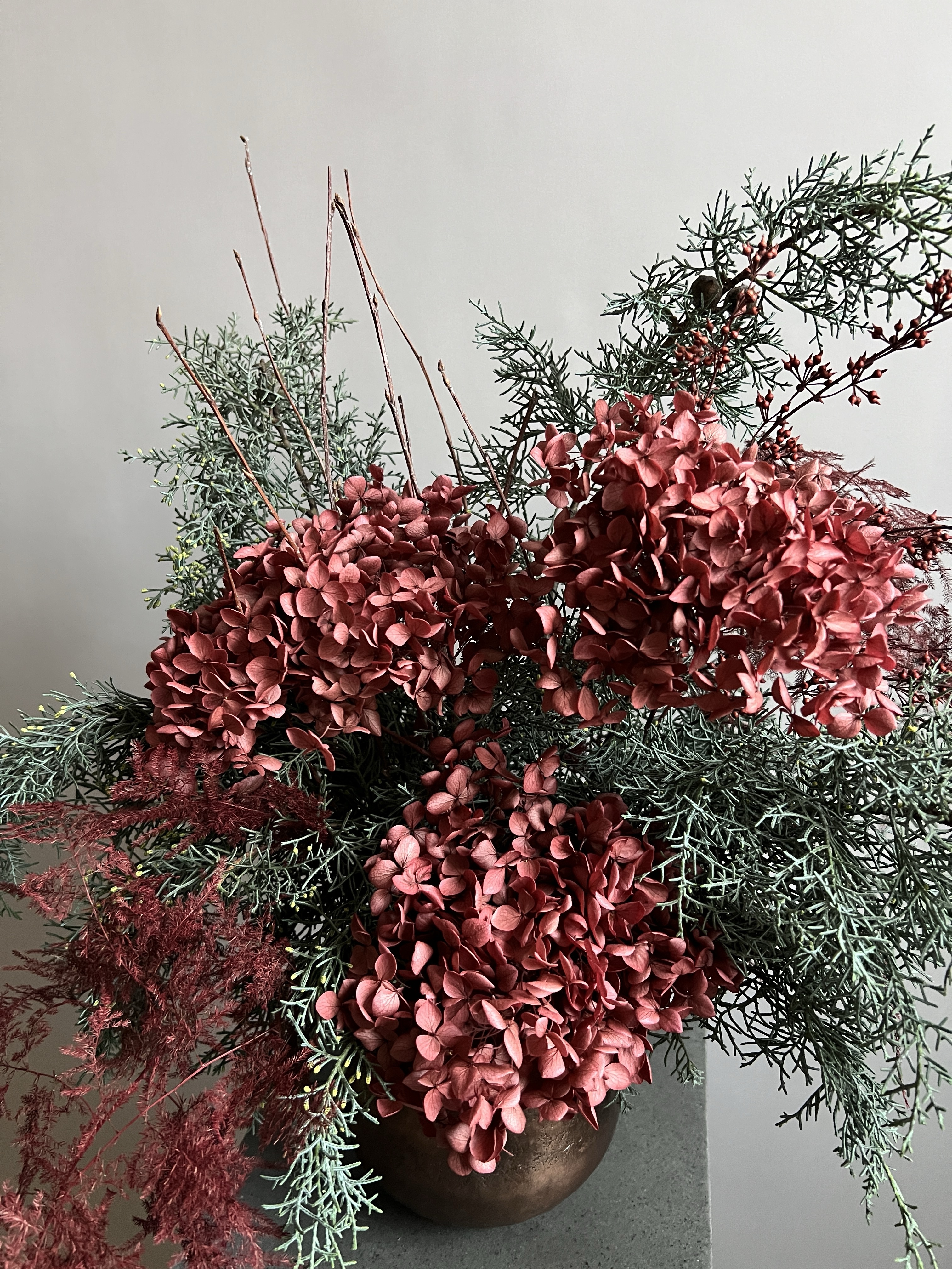 Состав: кипарис, аспарагус Veren, ветки сухоцвет, гортензия стабилизированная, плоды эвкалипта стабилизированные, кашпо металлическое