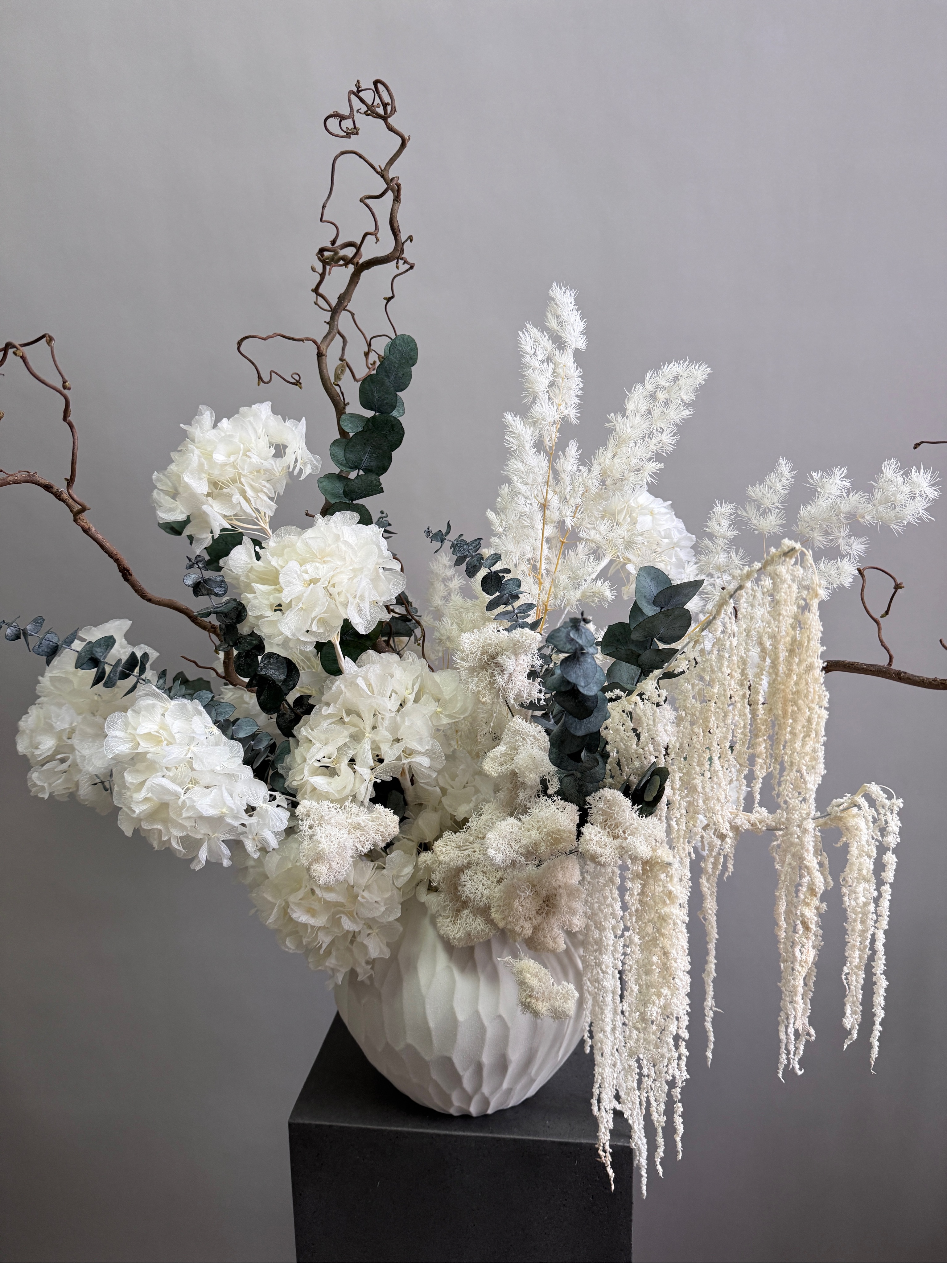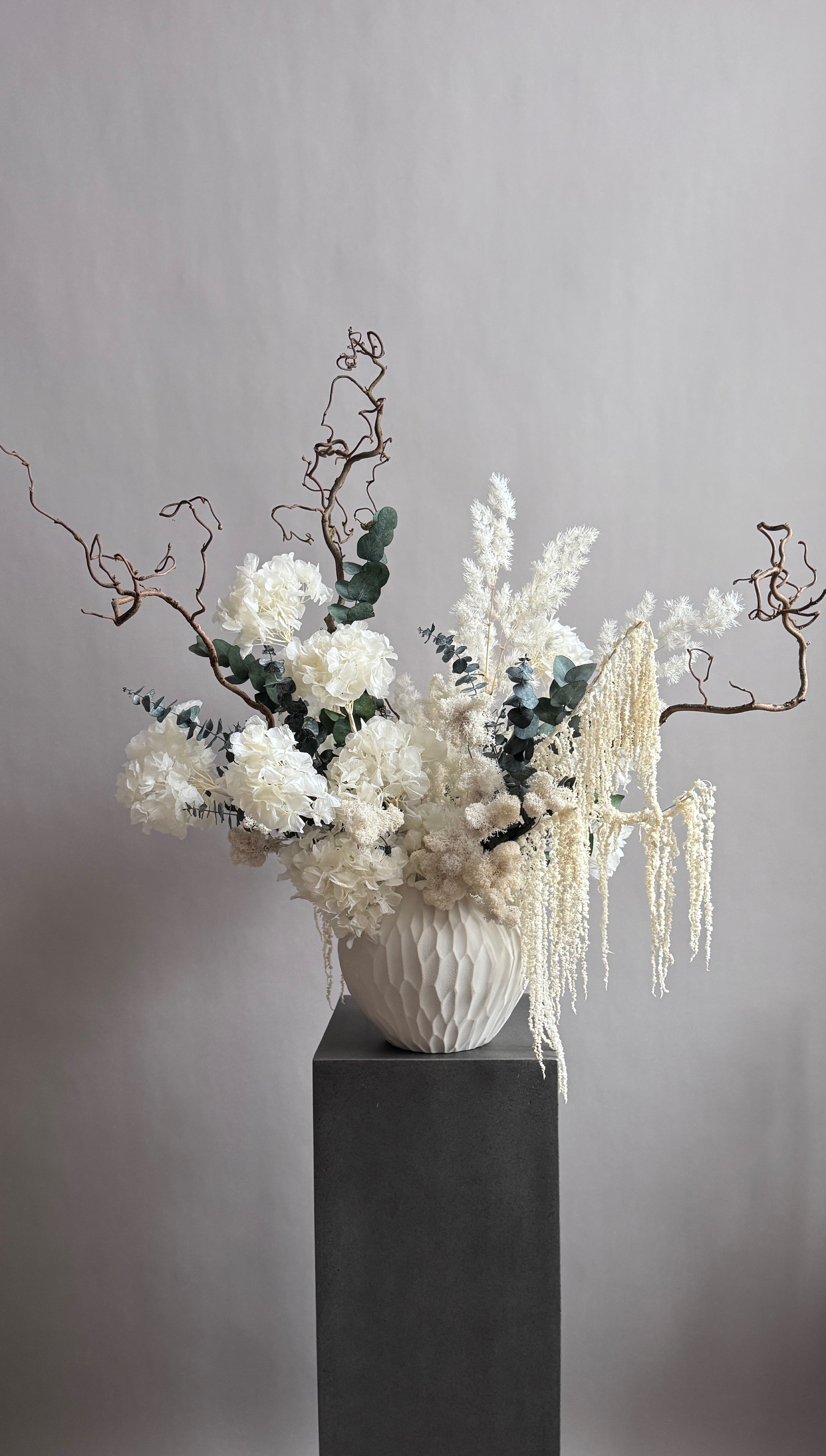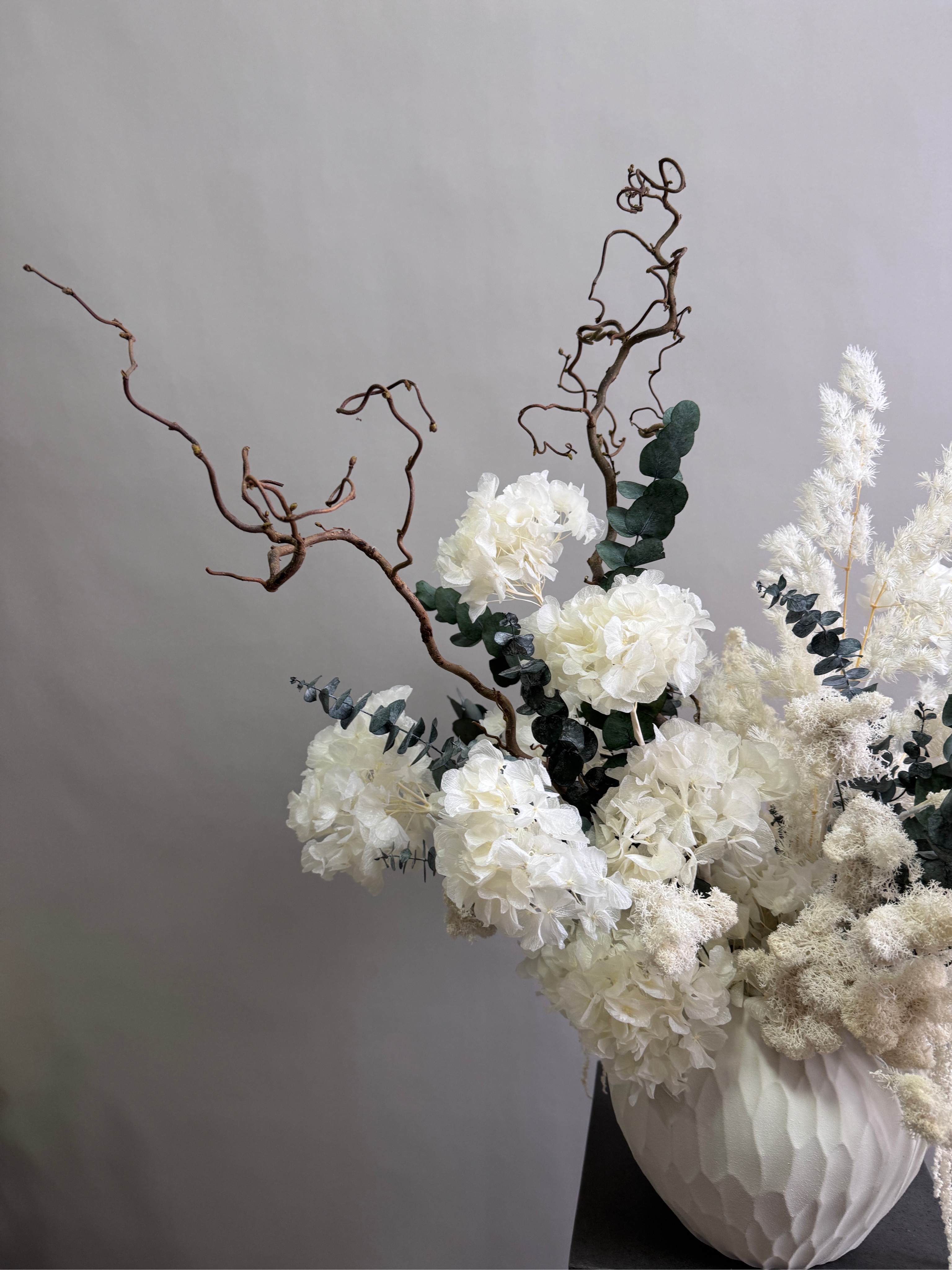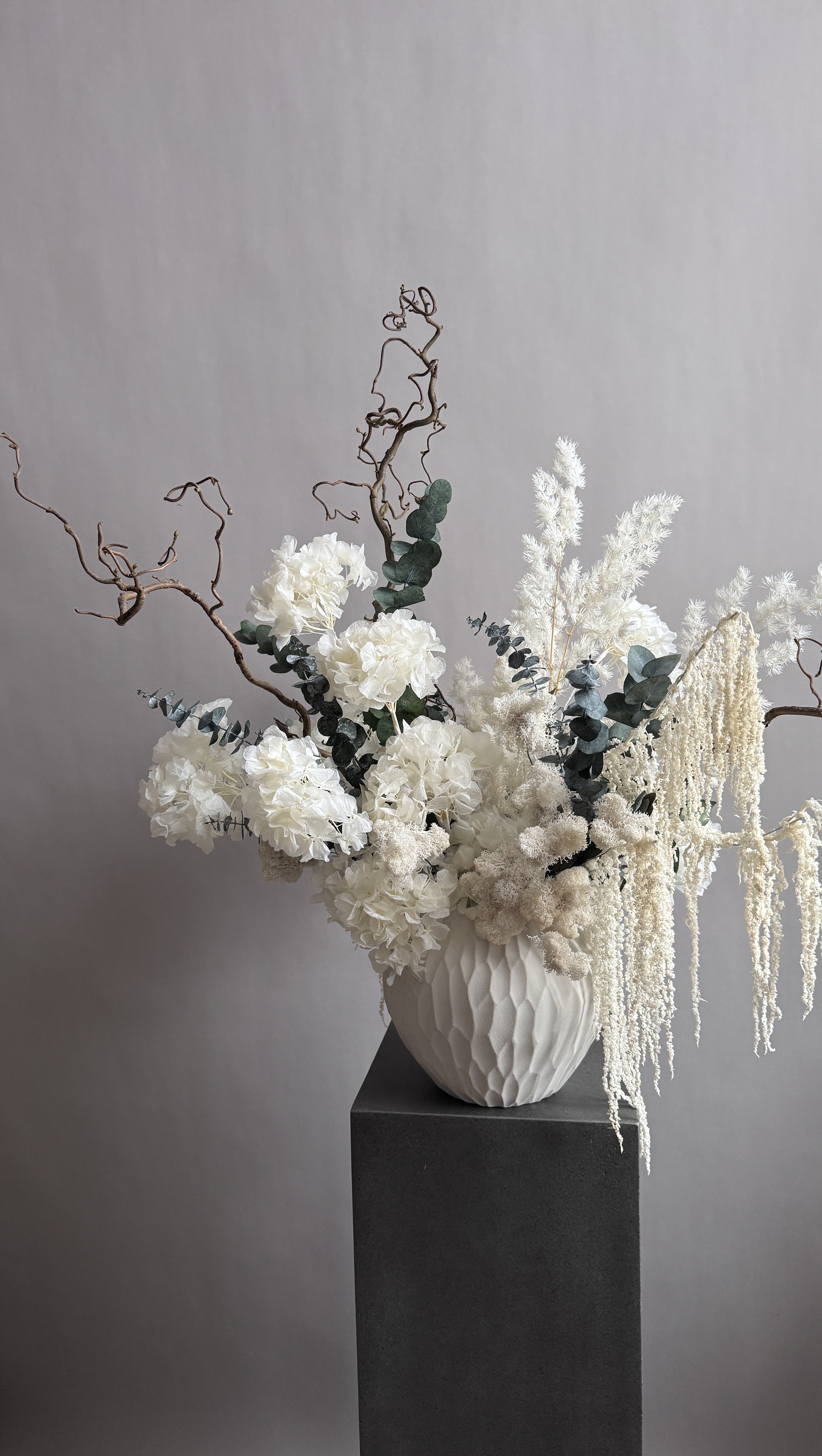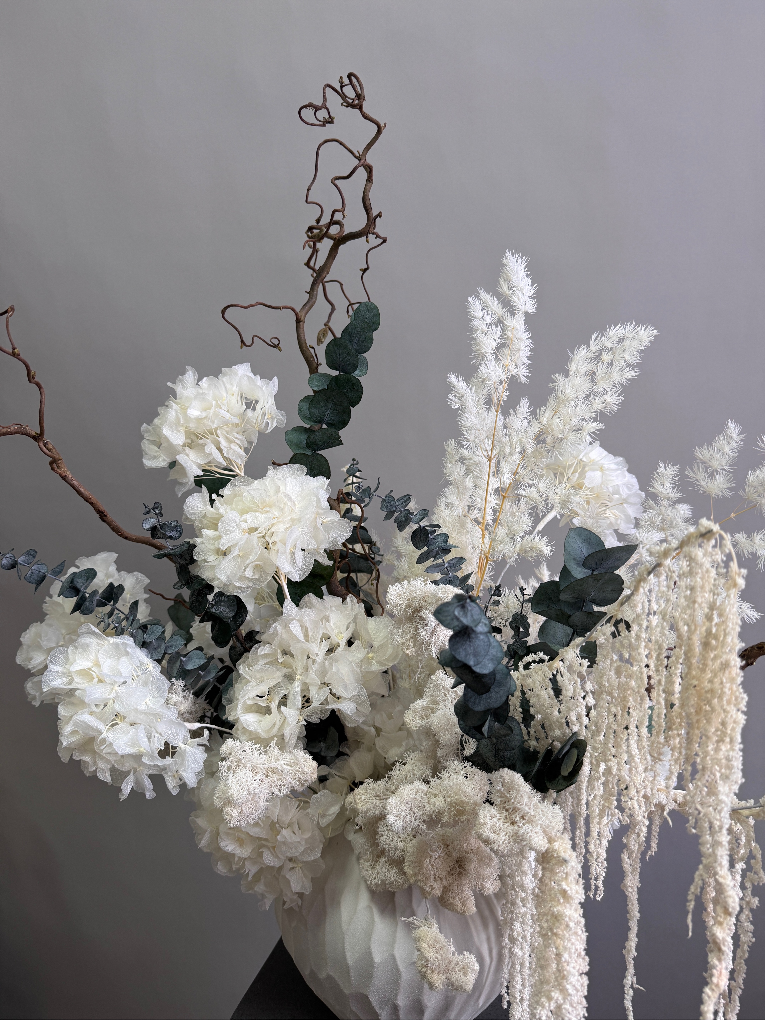Состав: гортензия стабилизированная, корилус, аспарагус, амарант стабилизированный, эвкалипт стабилизированный, мох, кашпо