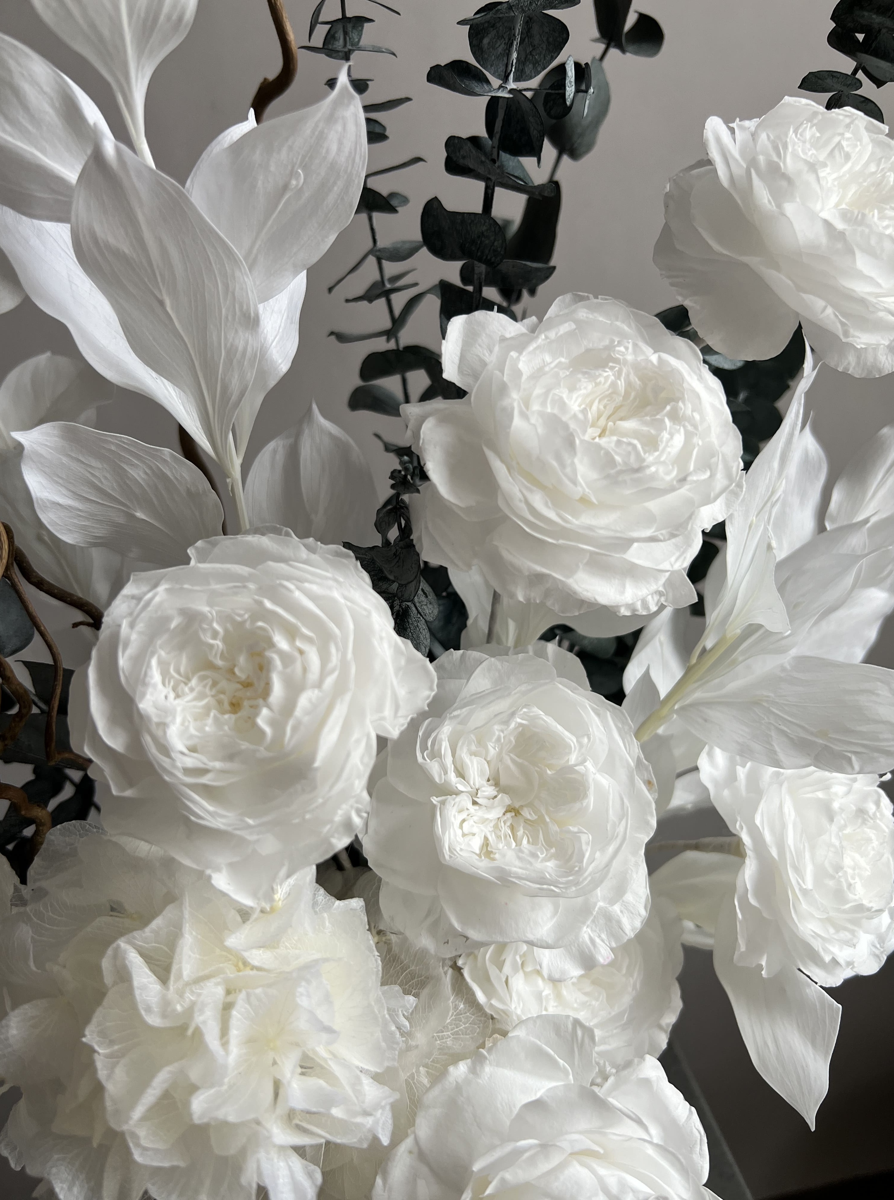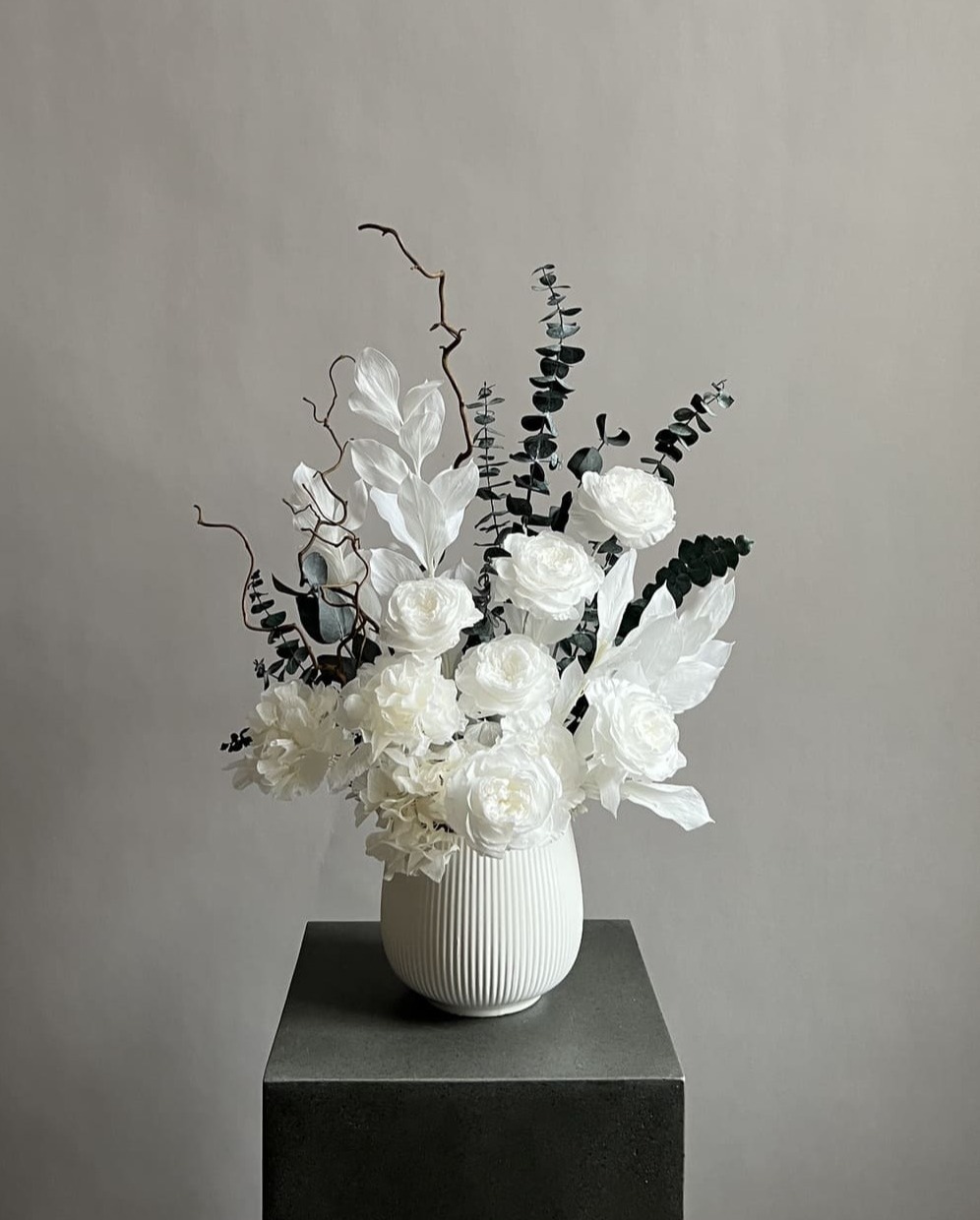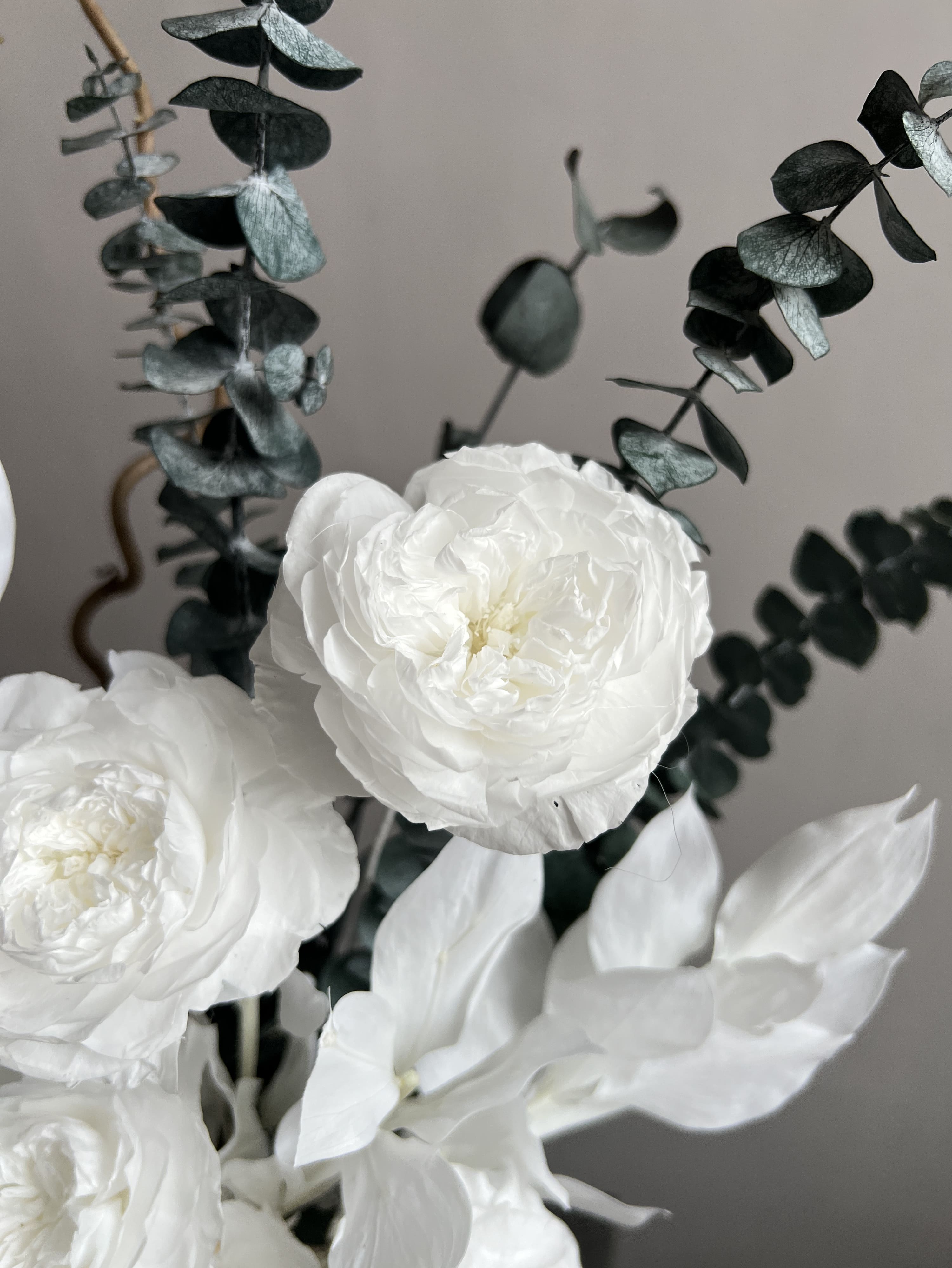 Состав: гортензия макрофила стабилированная, корилус, эвкалипт стабилированный, рускус садовый стабилизированный, мох стабилизированный, розы пионовидные стабилизированные, кашпо
