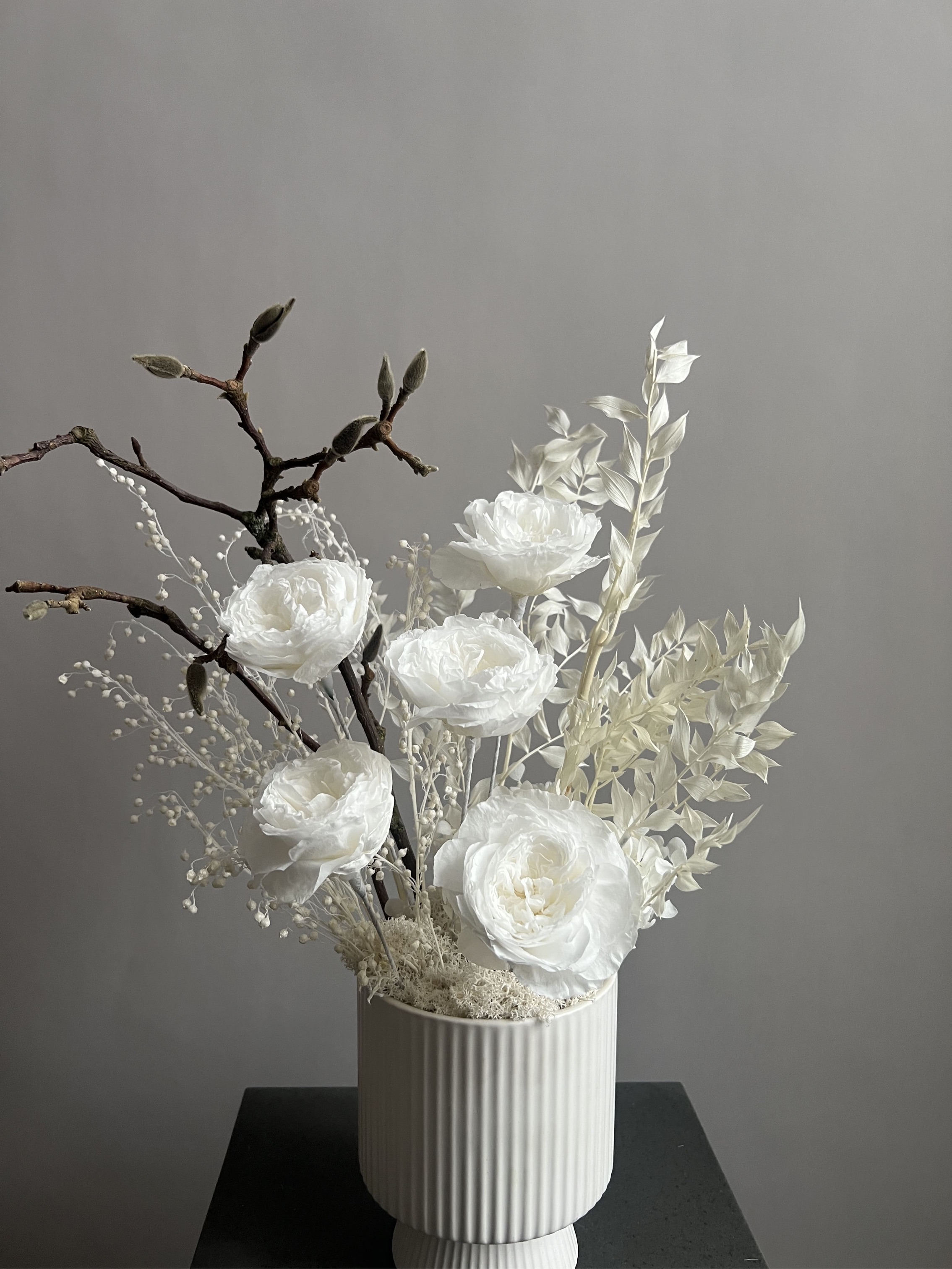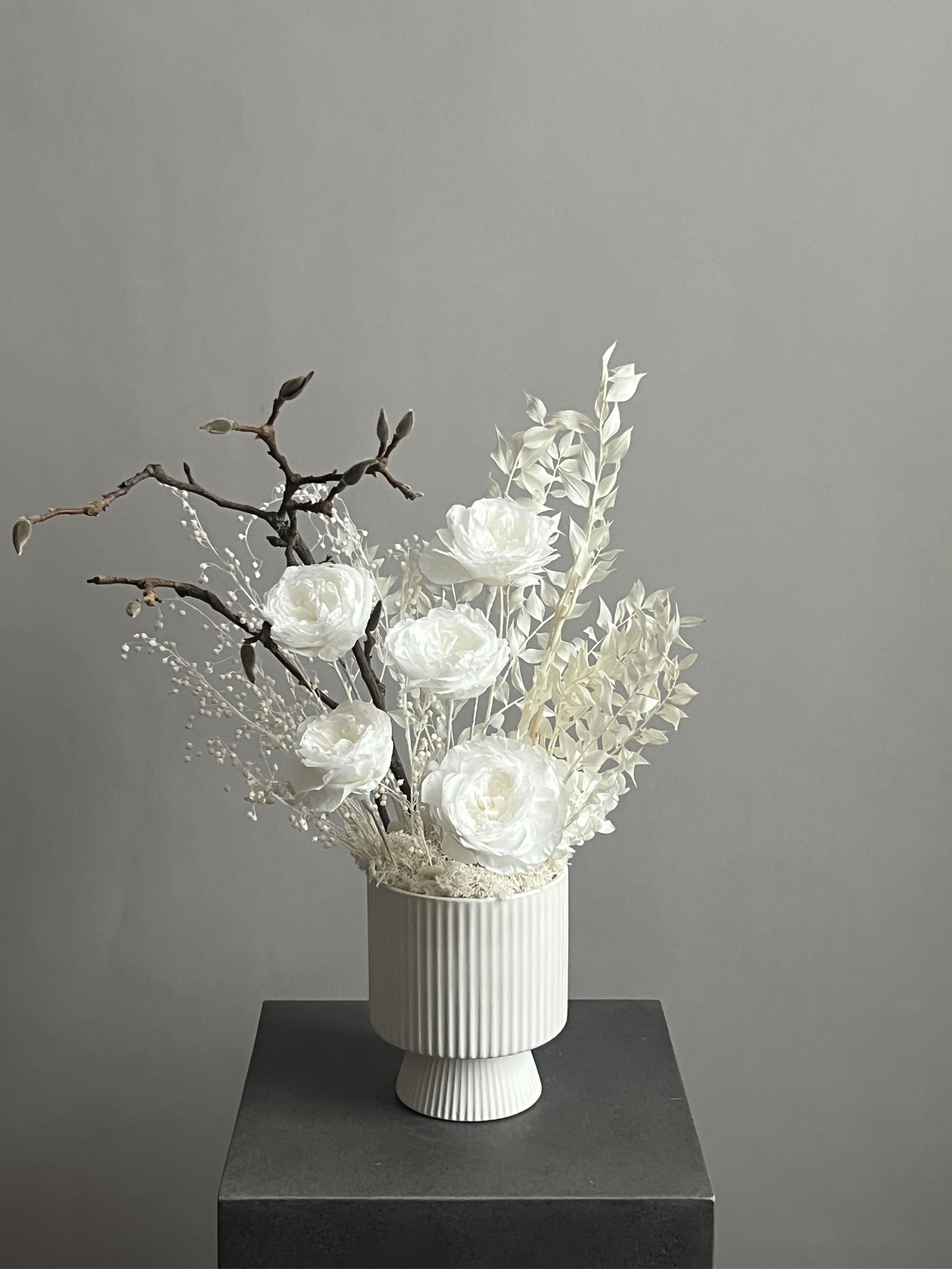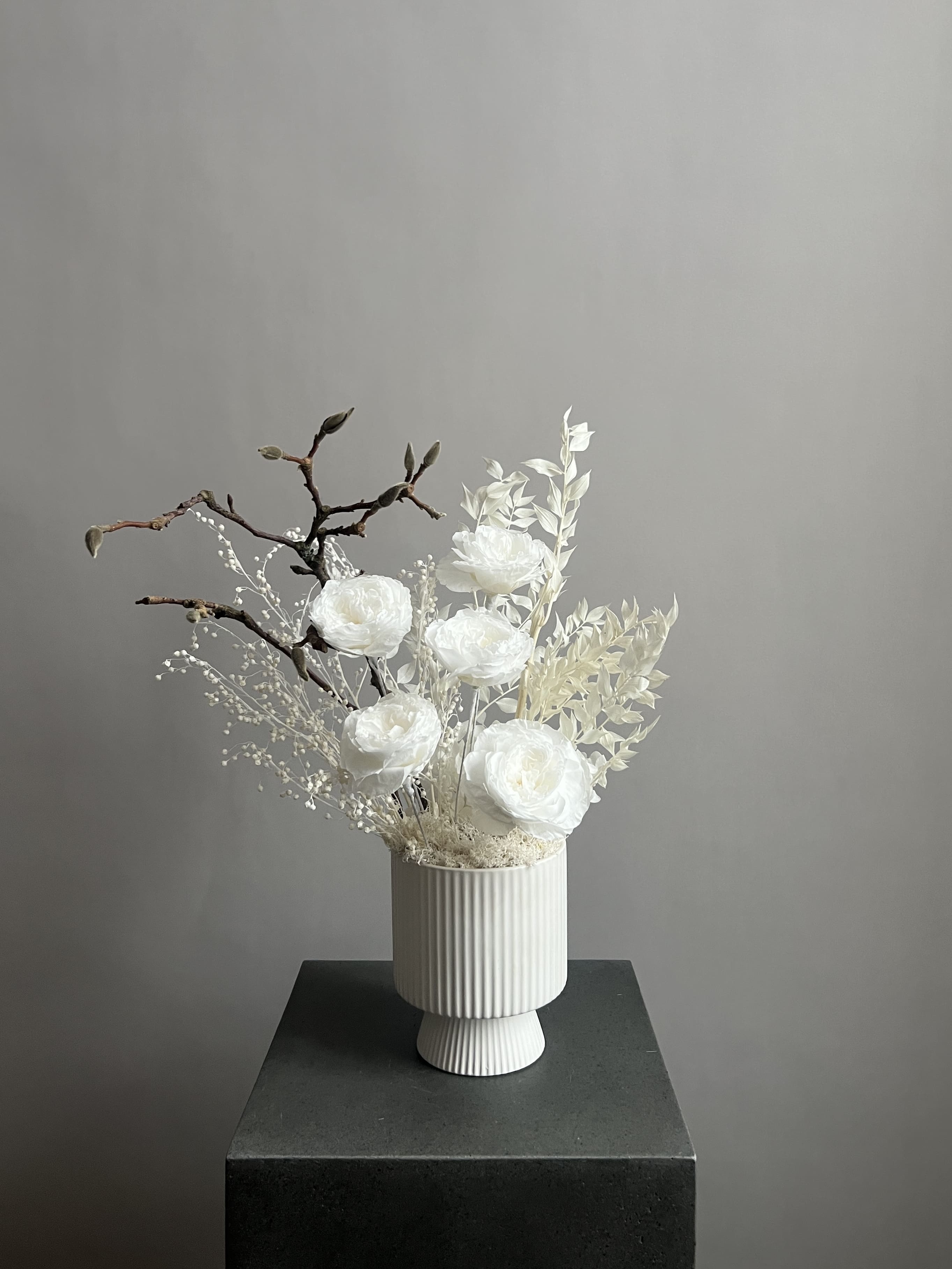 Композиция из сухоцветов и стабилизированных цветов в кашпо