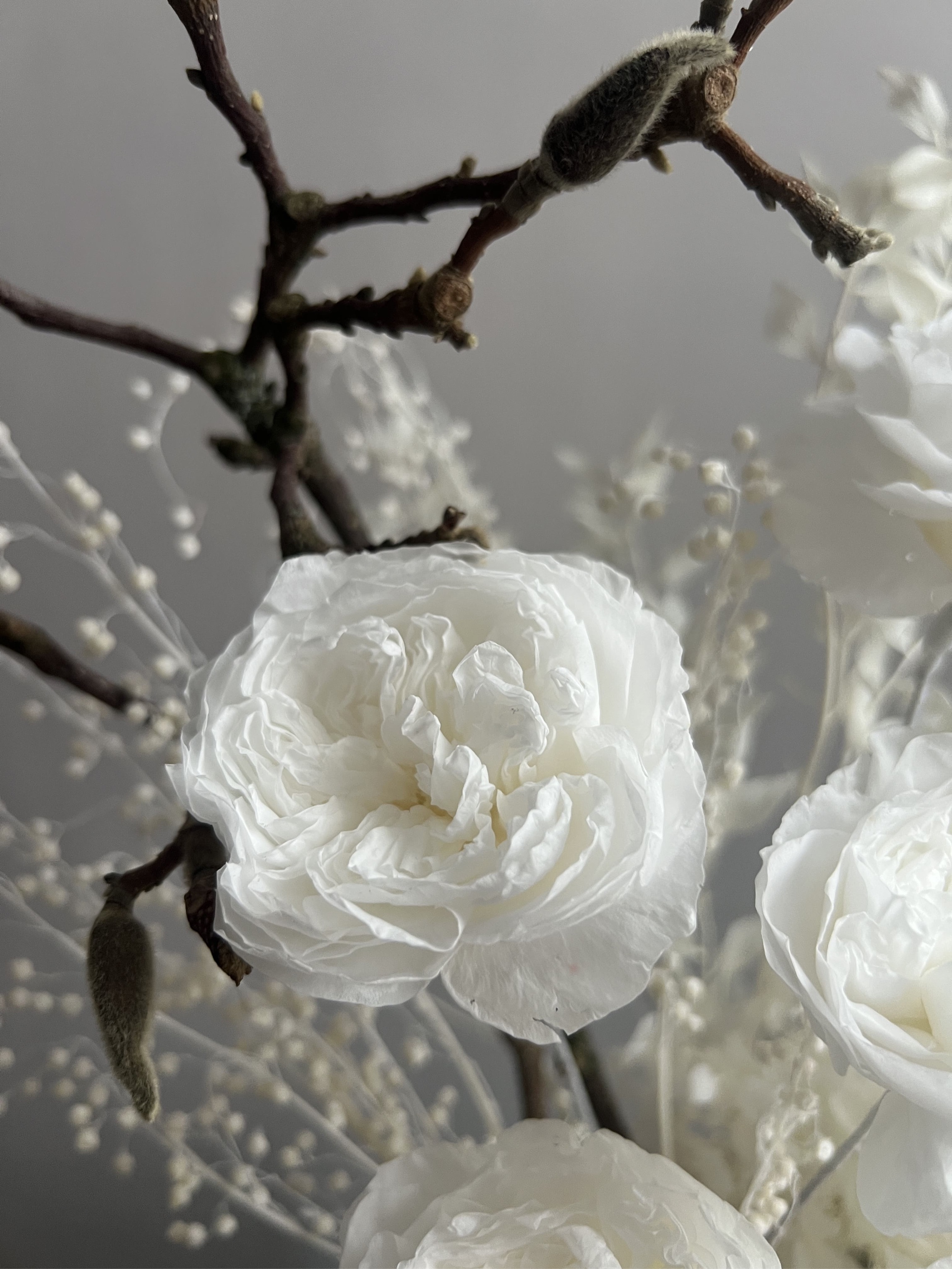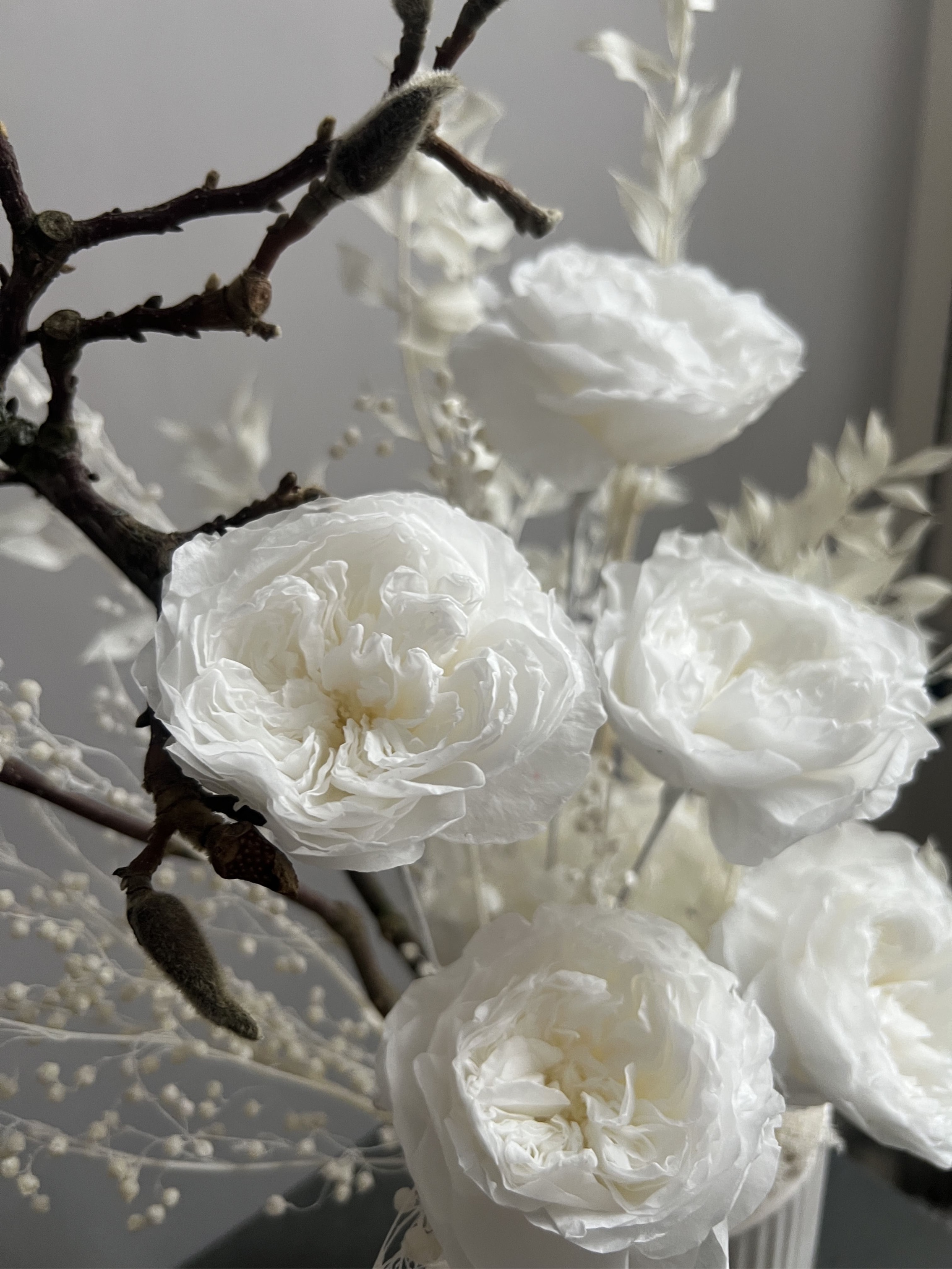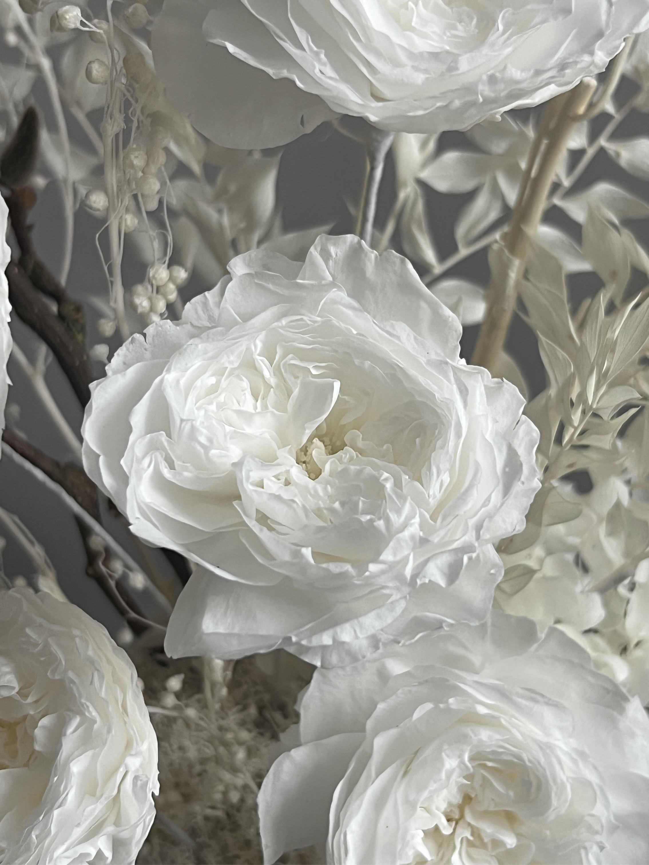 Композиция из сухоцветов и стабилизированных цветов в кашпо