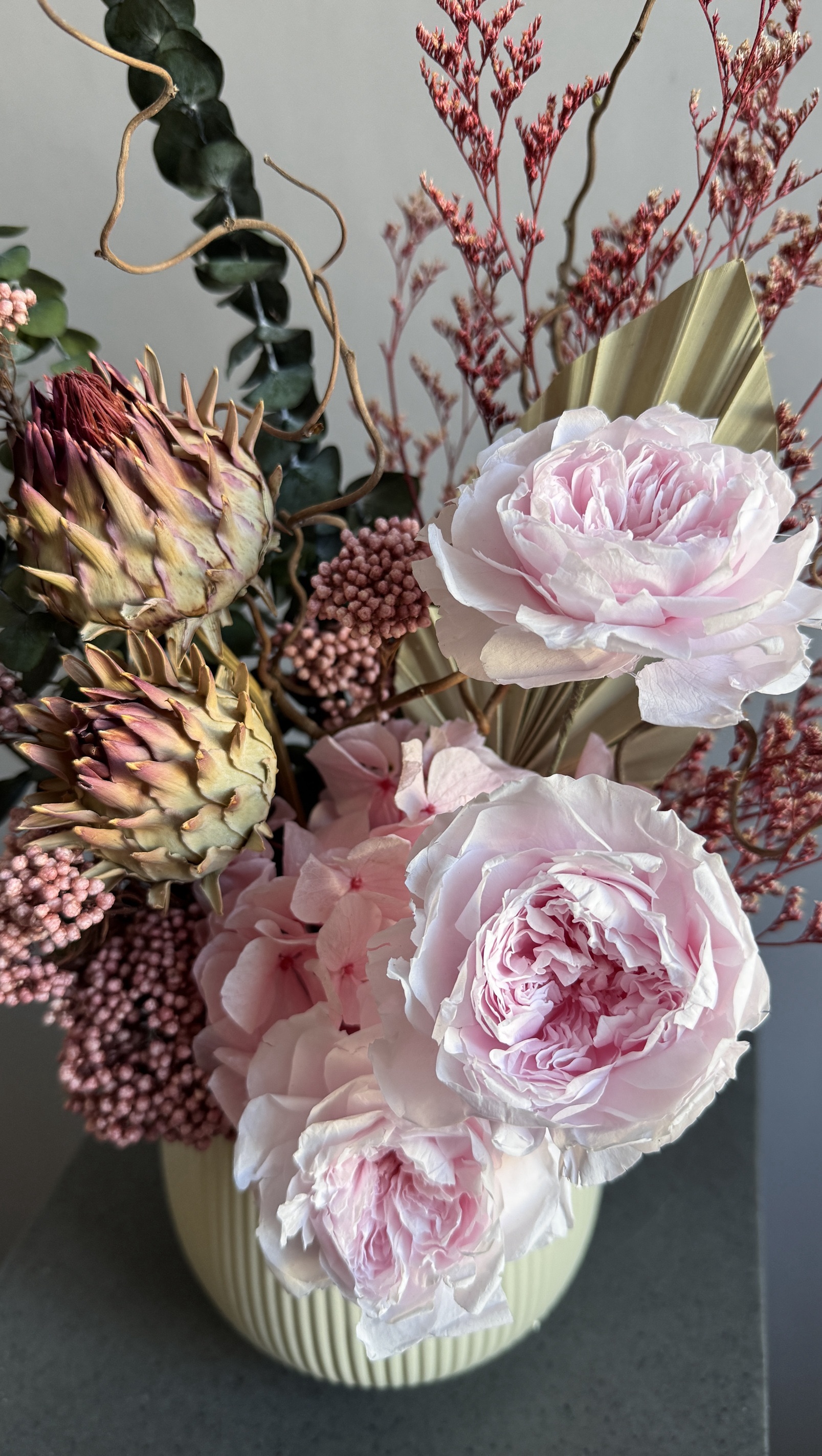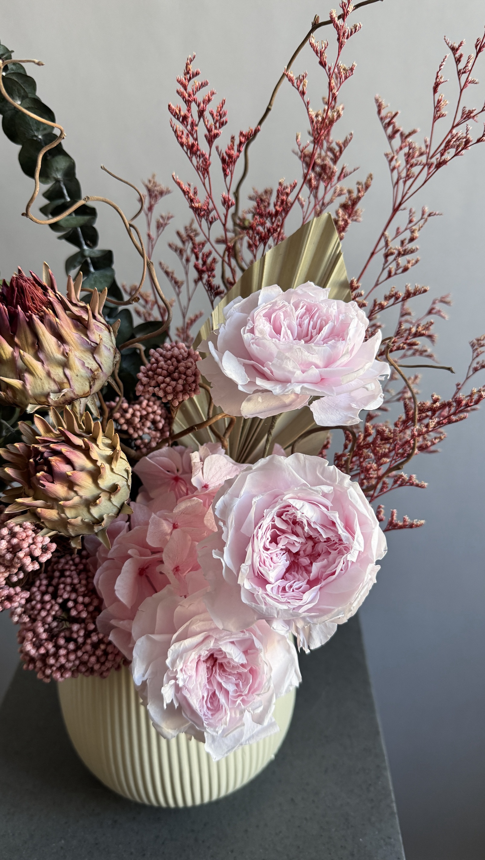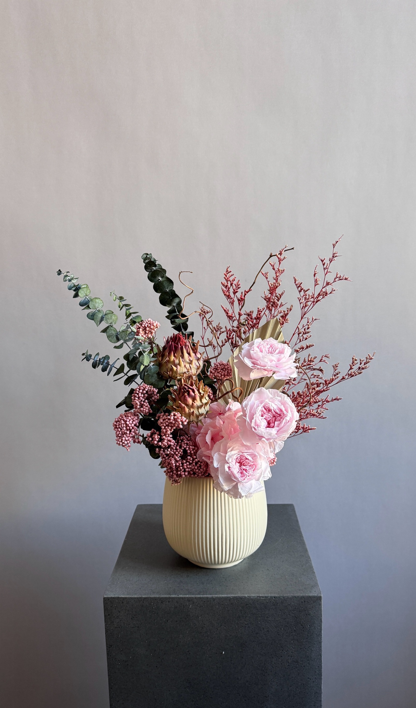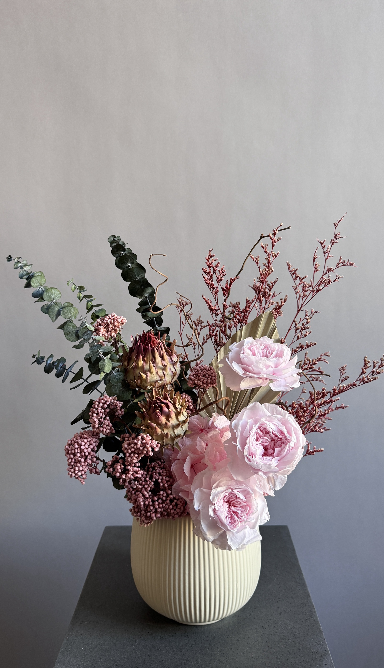 Состав: розы пионовидные стабилизированные розовые, эвкалипт Бейби Блю стабилизированный, кермек стабилизированный, озотамнус стабилизированный, гортензия стабилизированная, артишоки сухоцвет, пальмовый лист, корилус, флористическая губка, кашпо керамическое