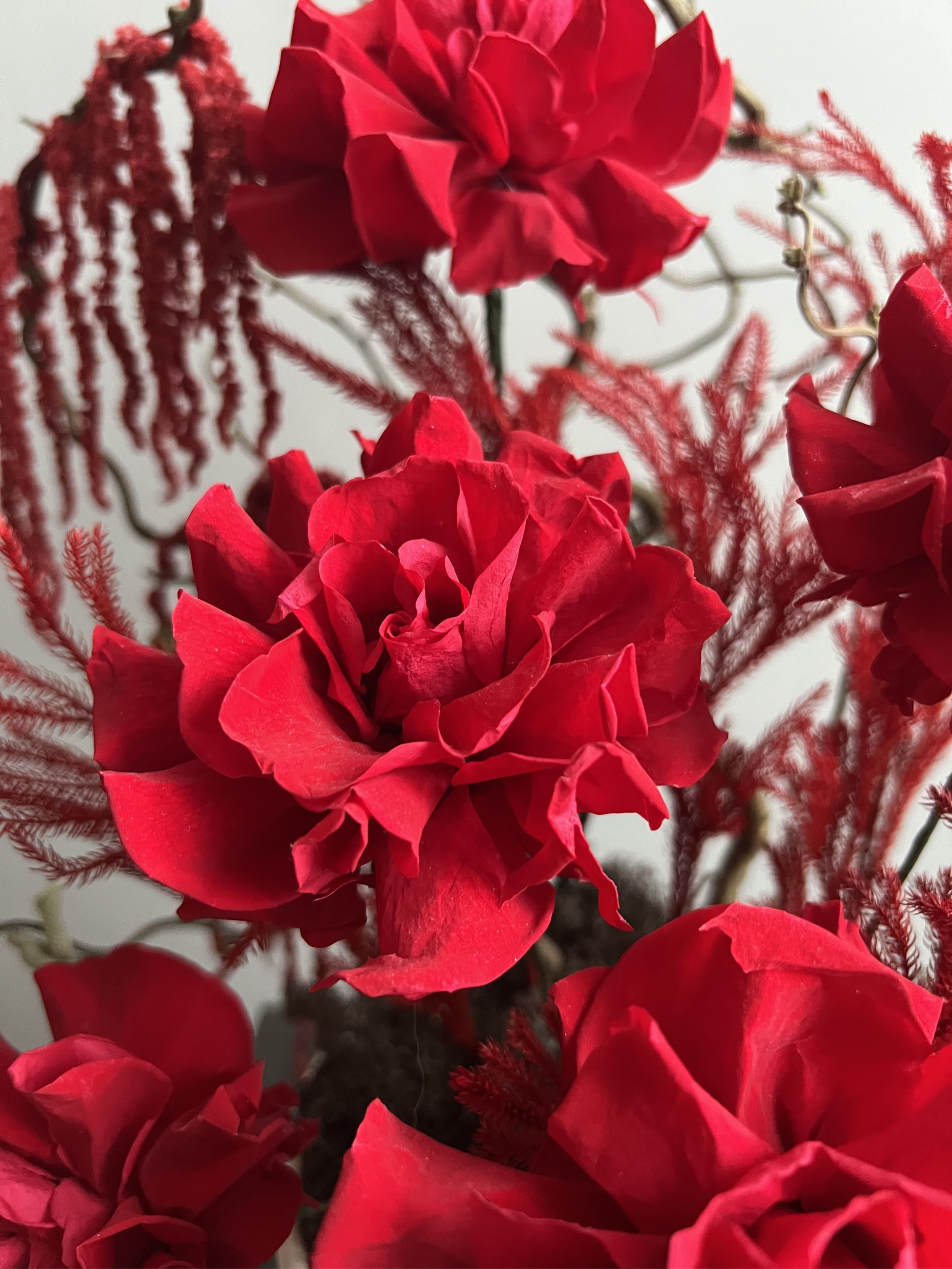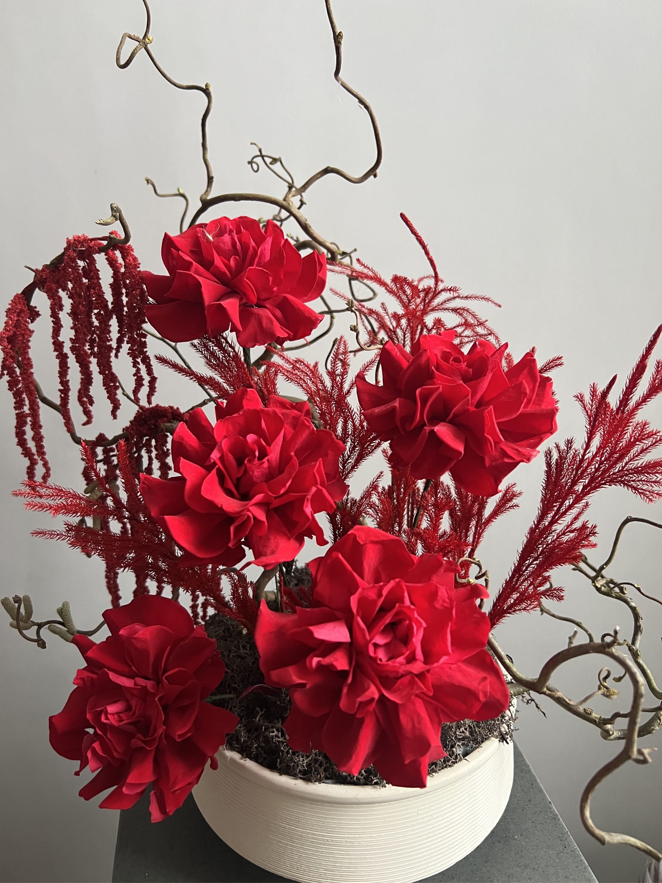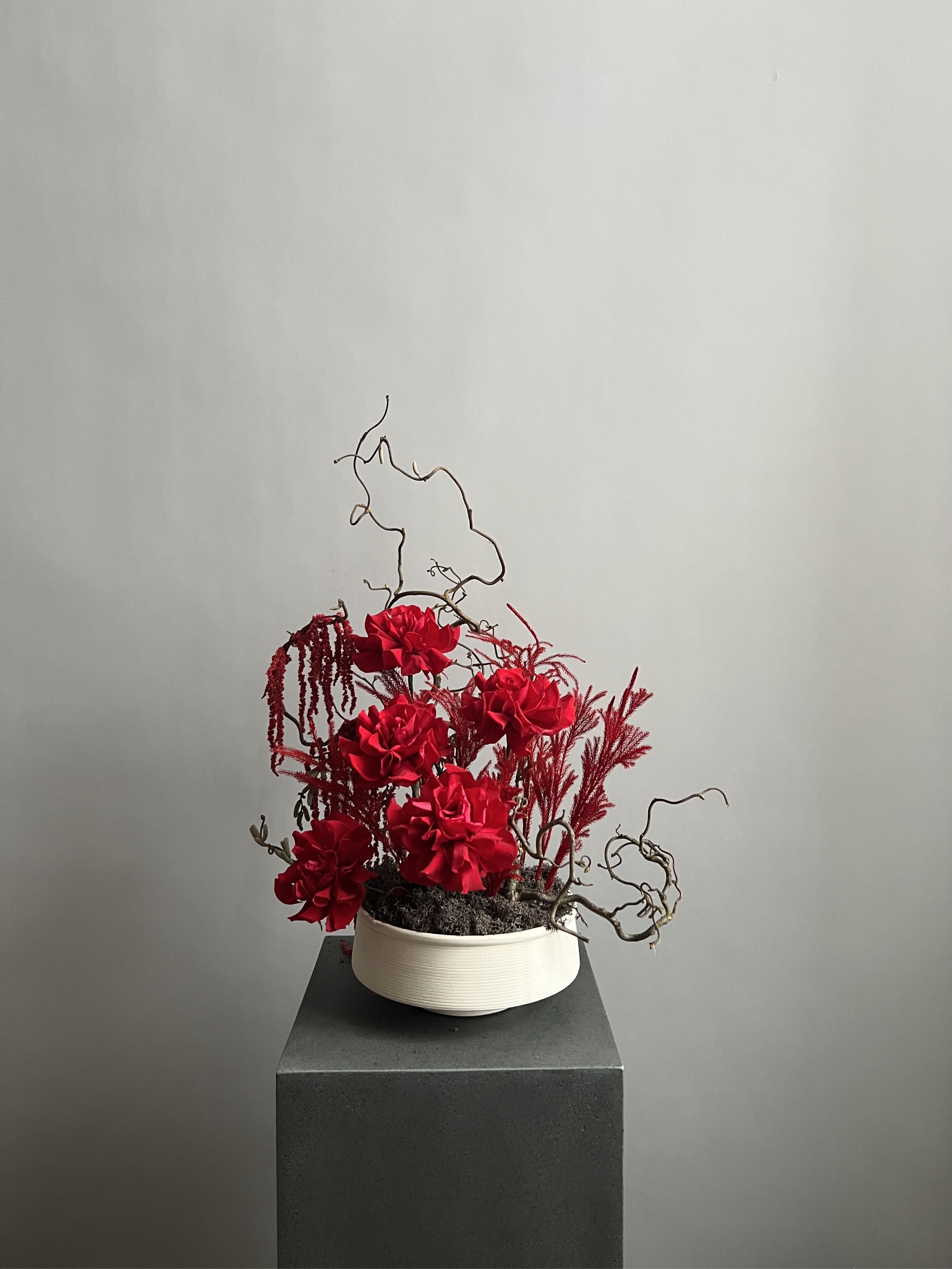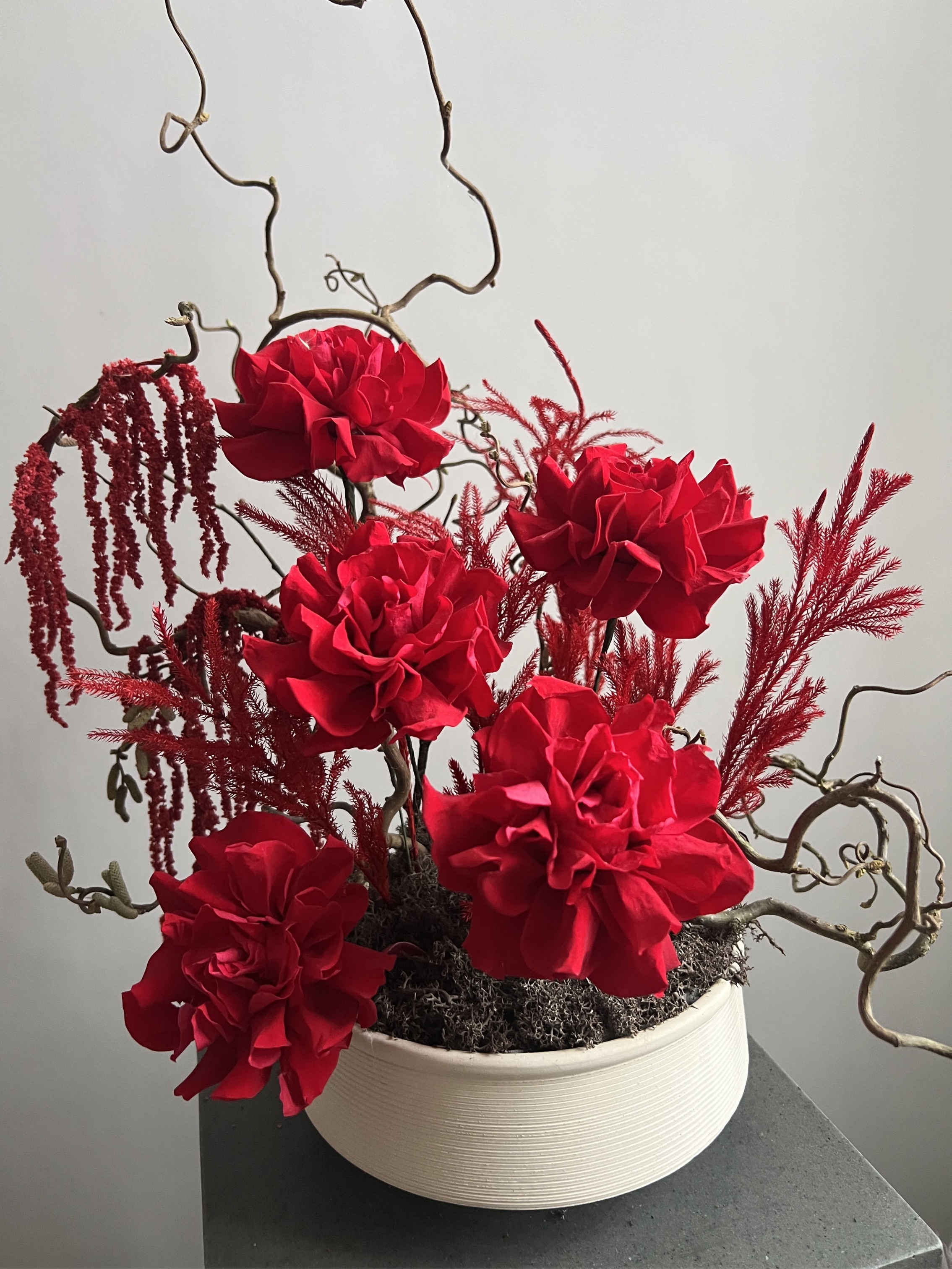 Состав: Розы стабилизированные, амарант, мох, корилус, можжевельник, губка, кашпо