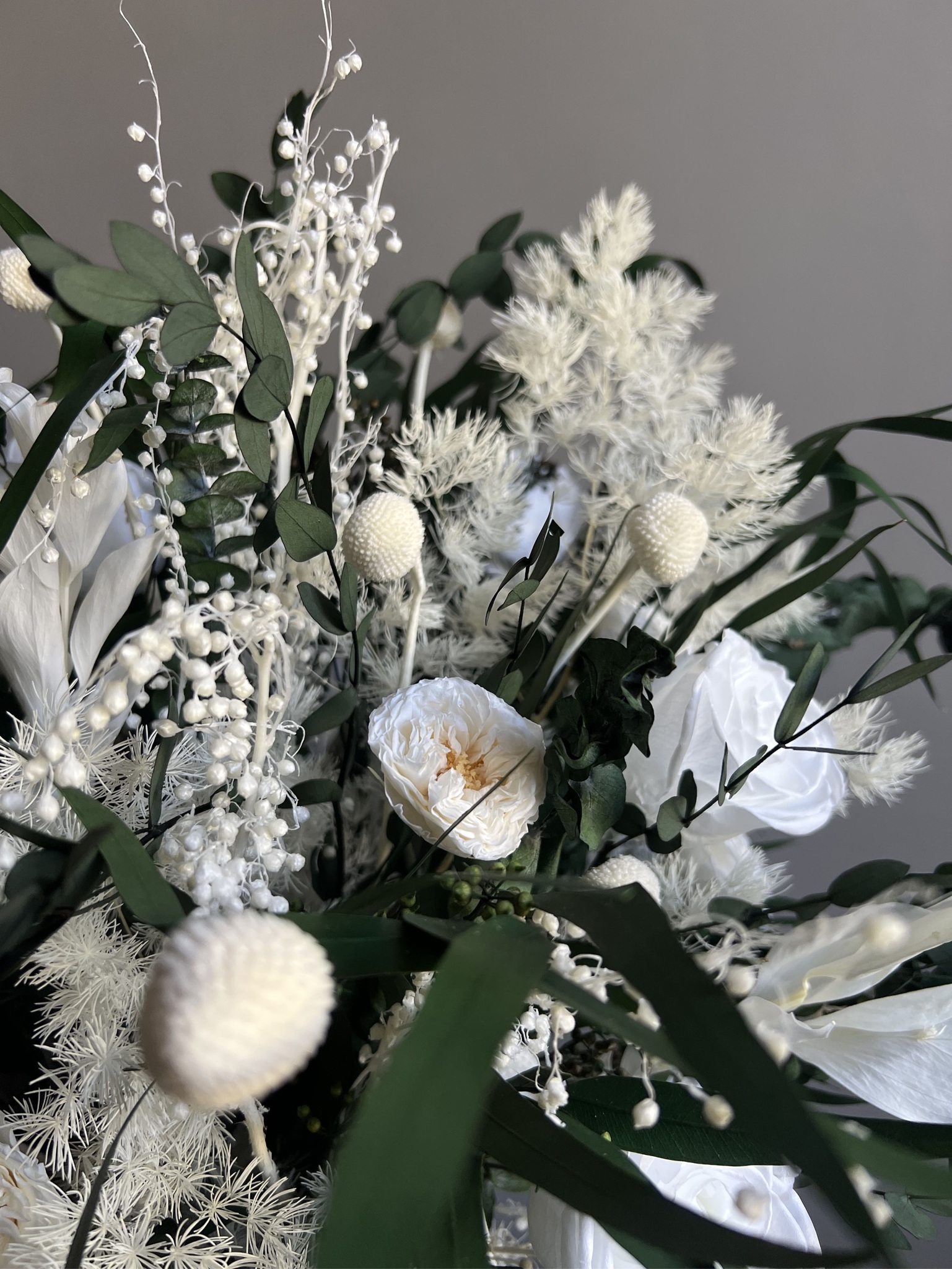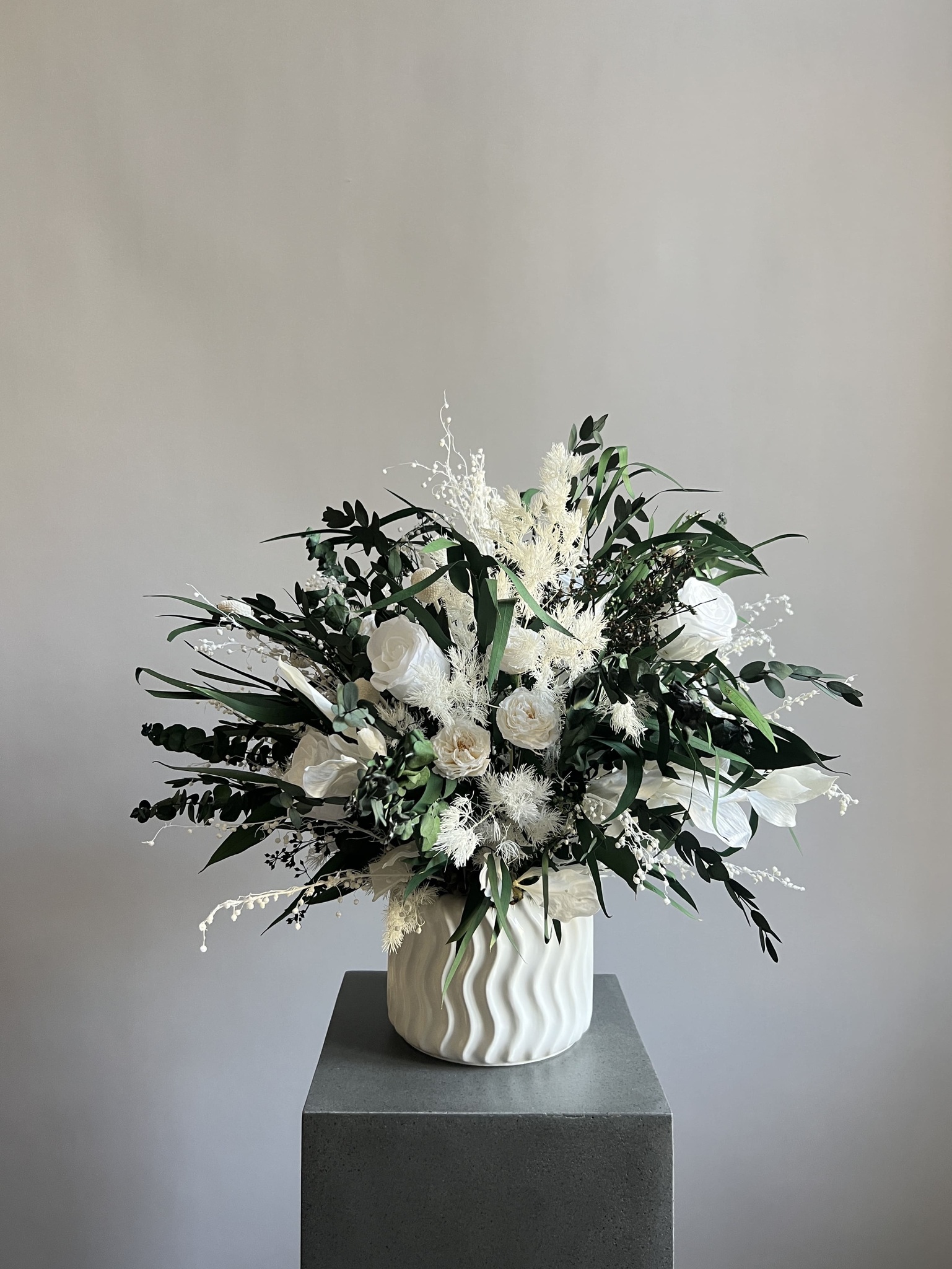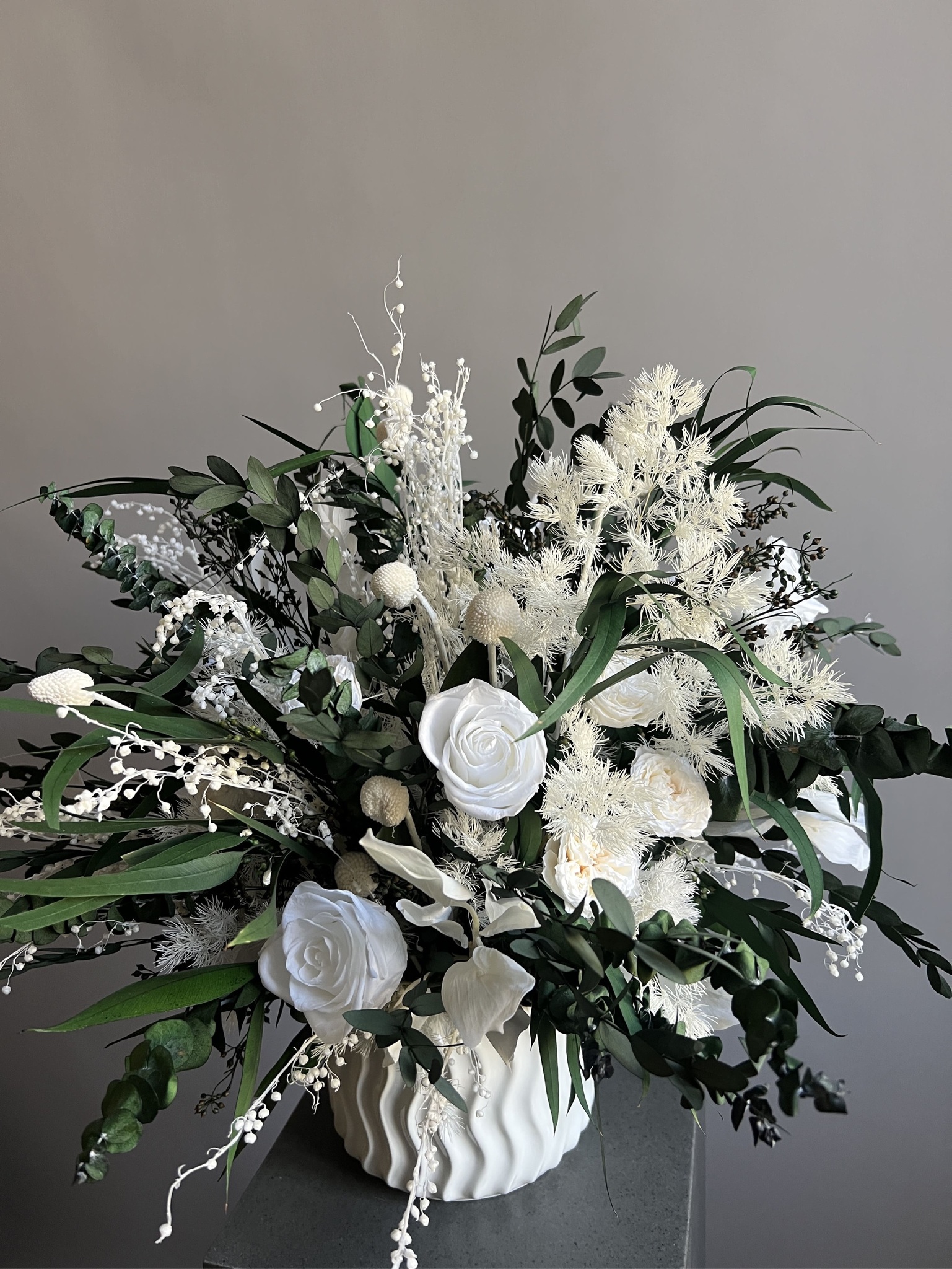 Композиция из сухоцветов и стабилизированных цветов в кашпо.