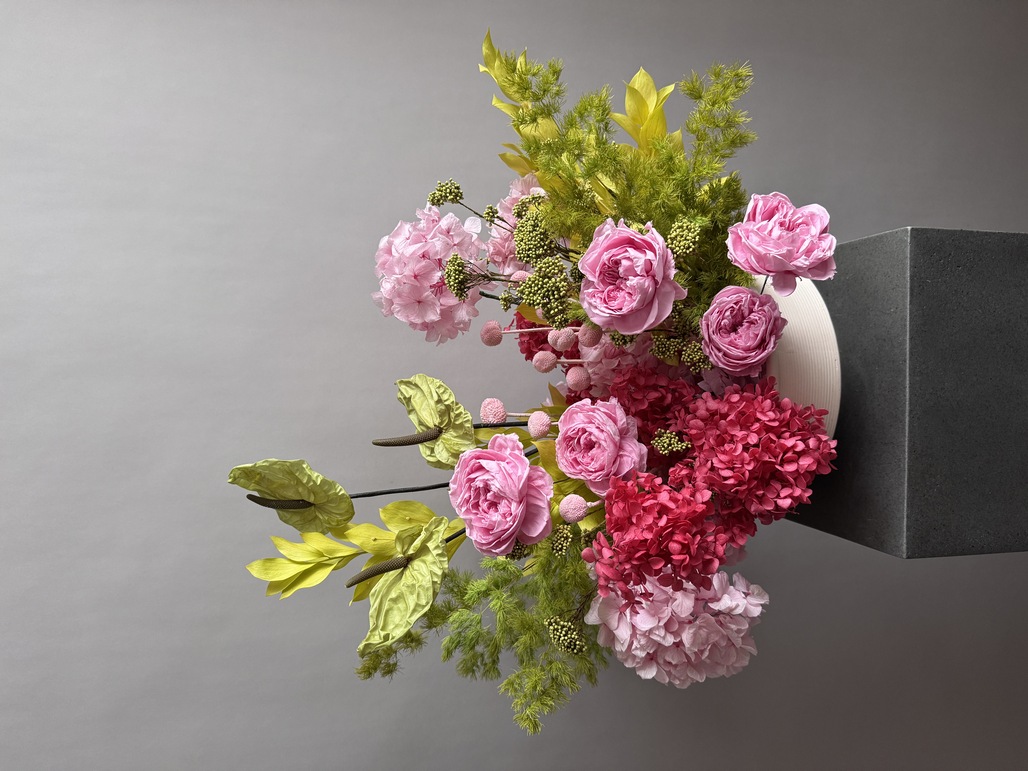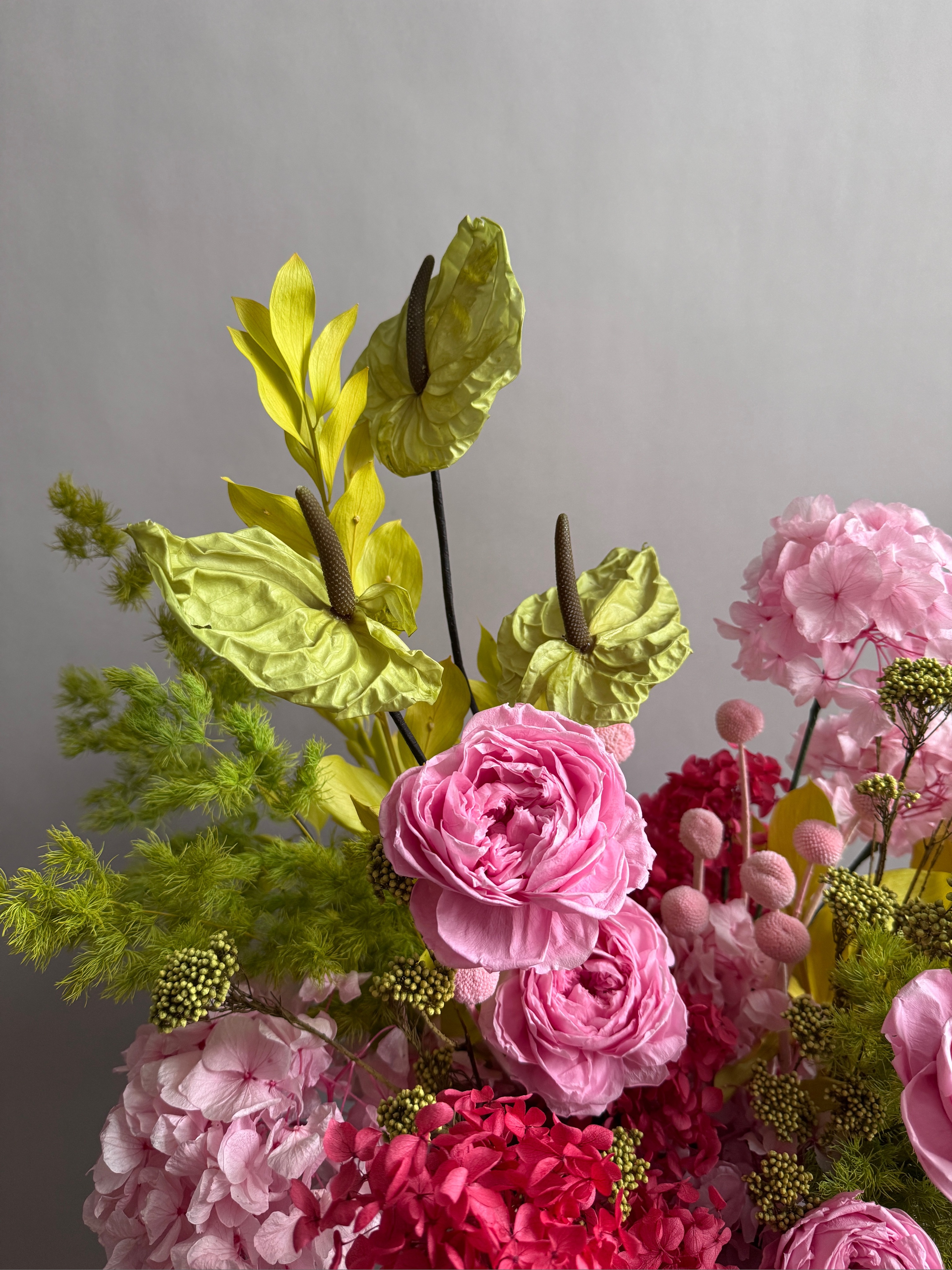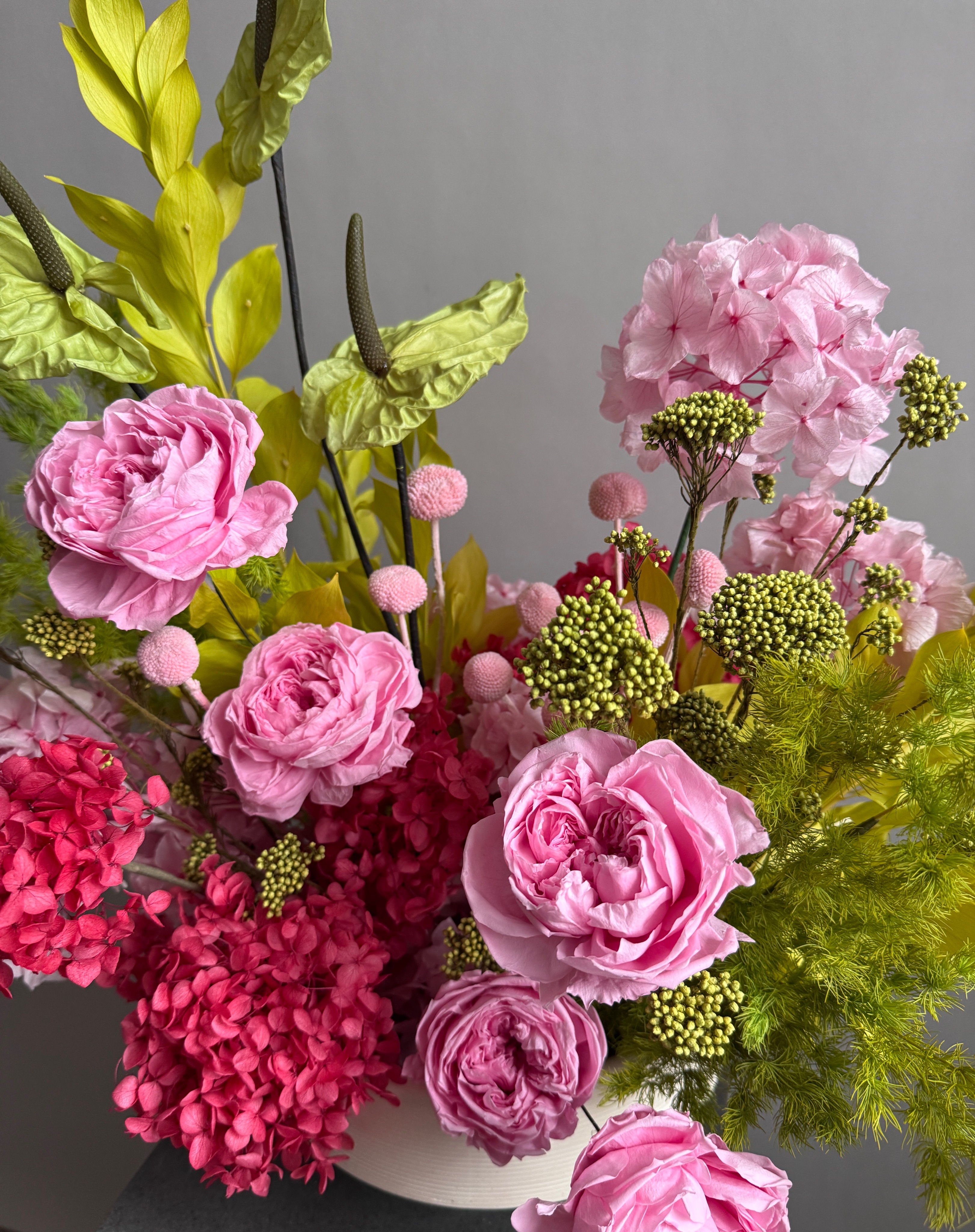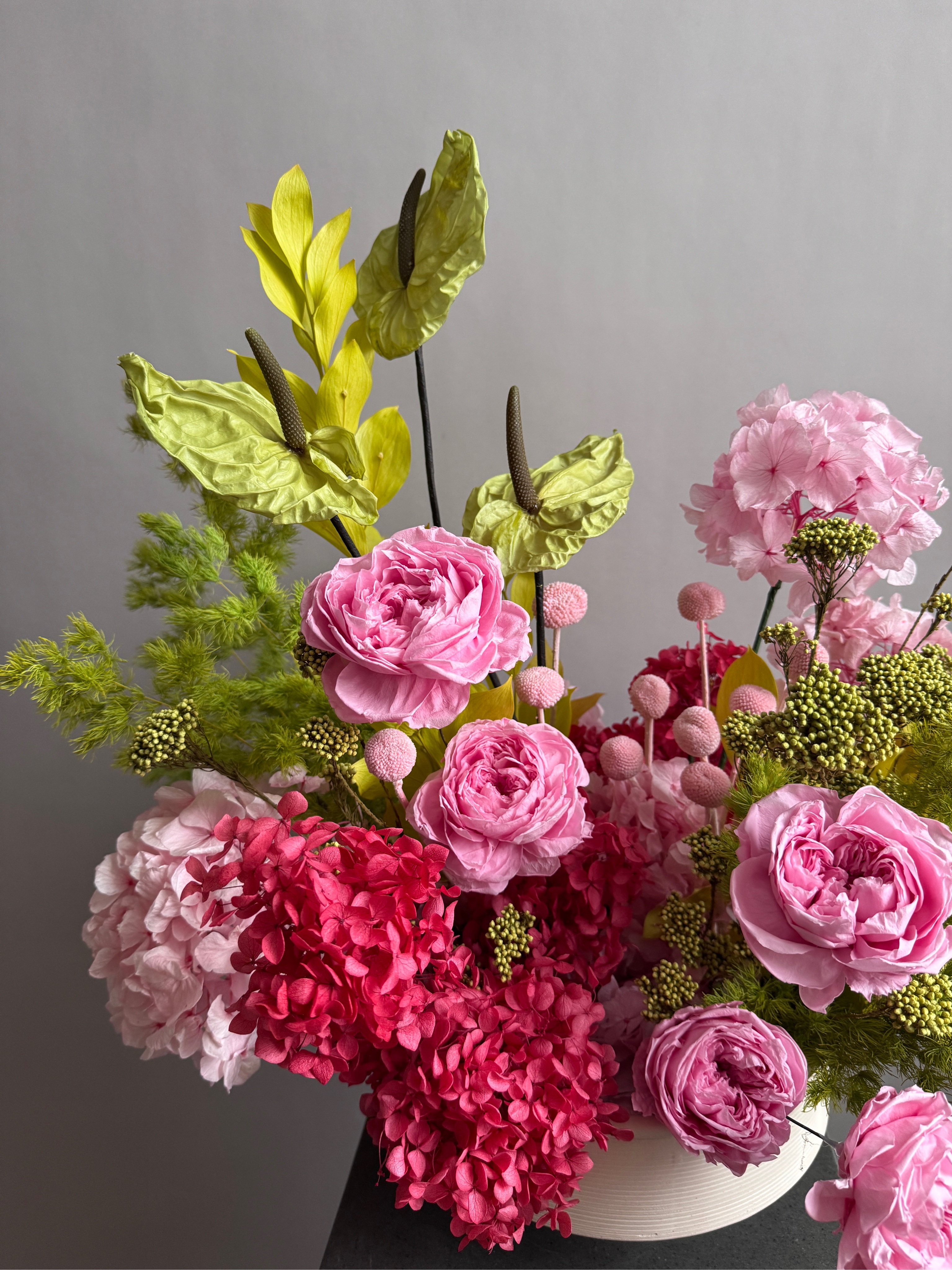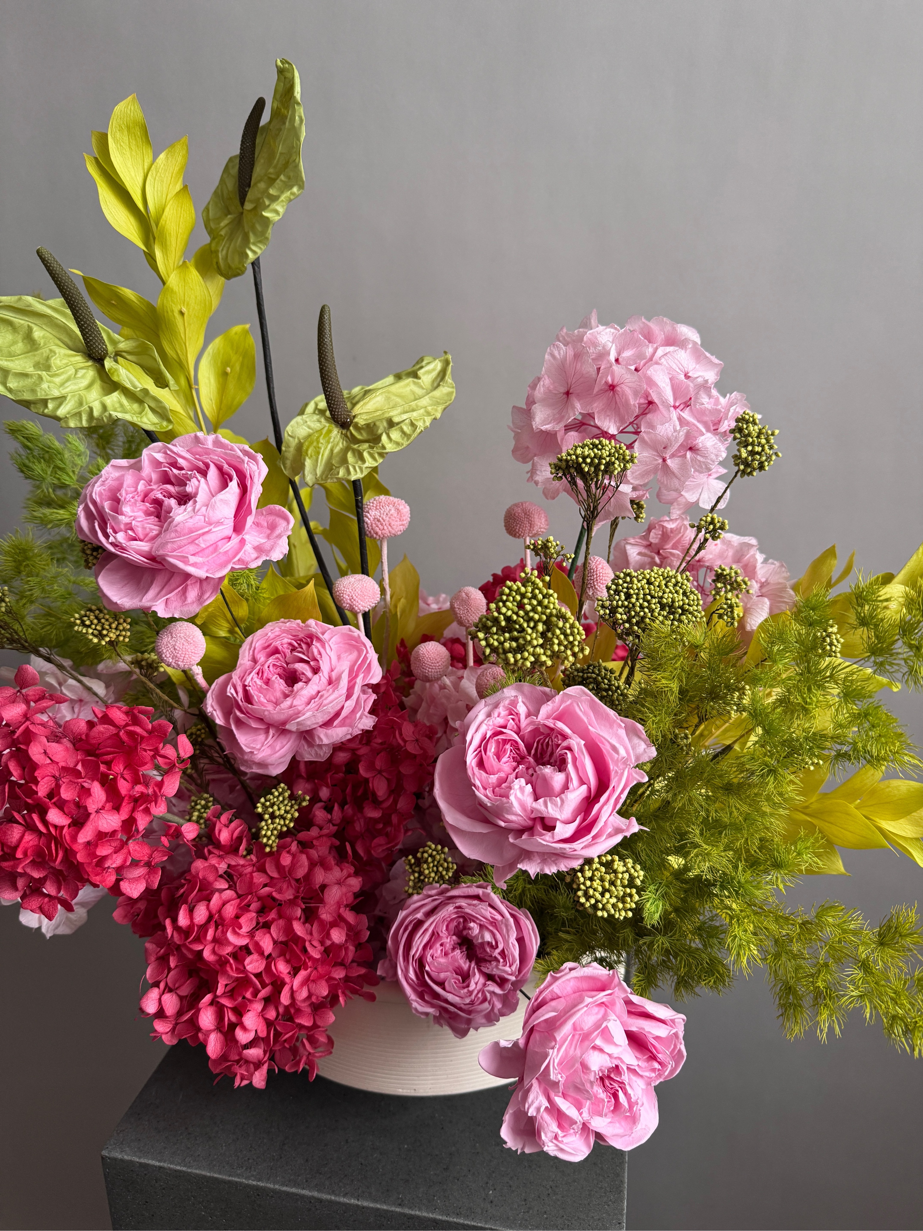 Состав: гортензия стабилизированная, аспарагус, краспедия, рускус садовый, антуриум стабилизированный, розы пионовидные стабилизированные, озотамнус стабилизированный, кашпо керамическое