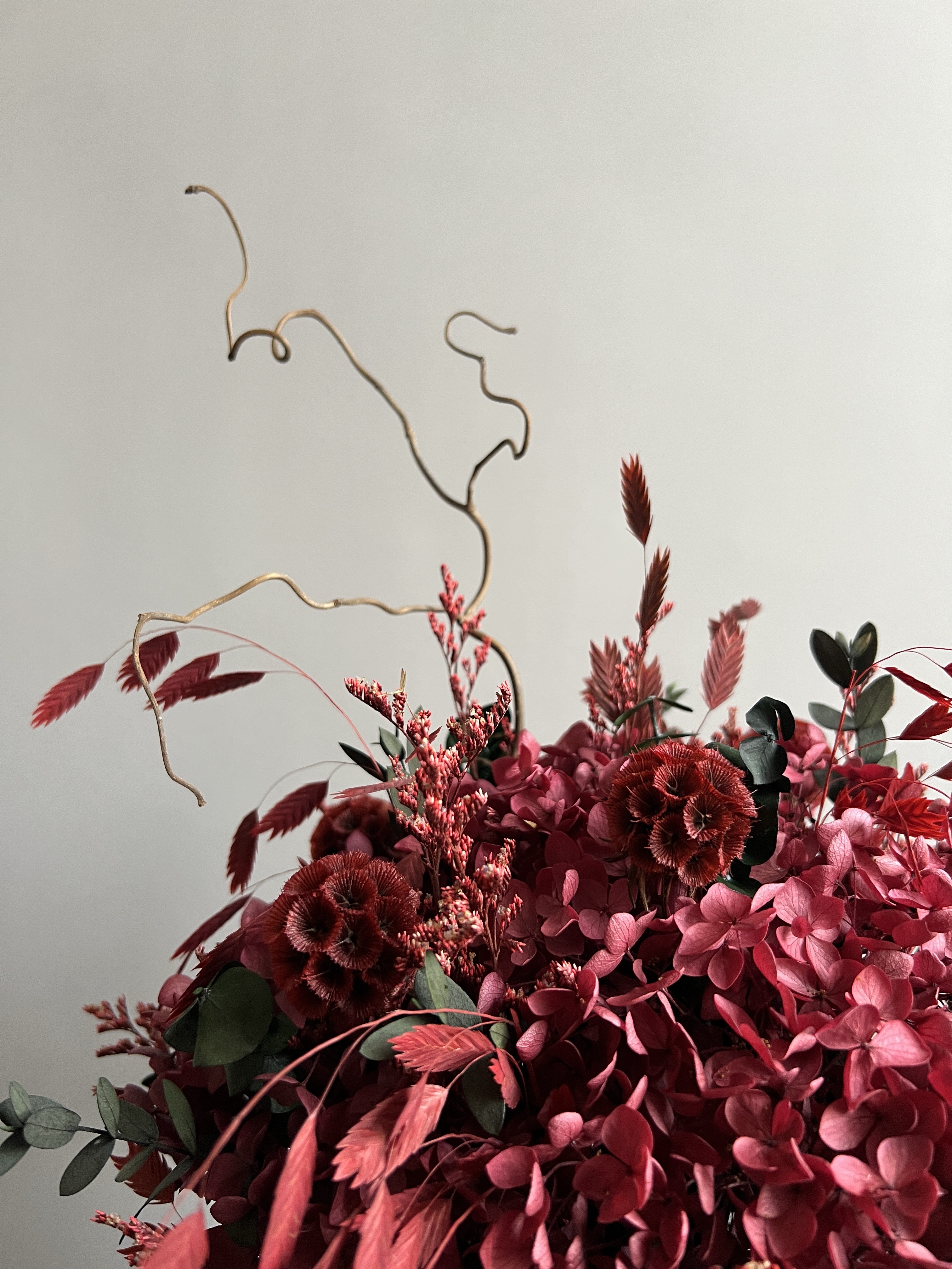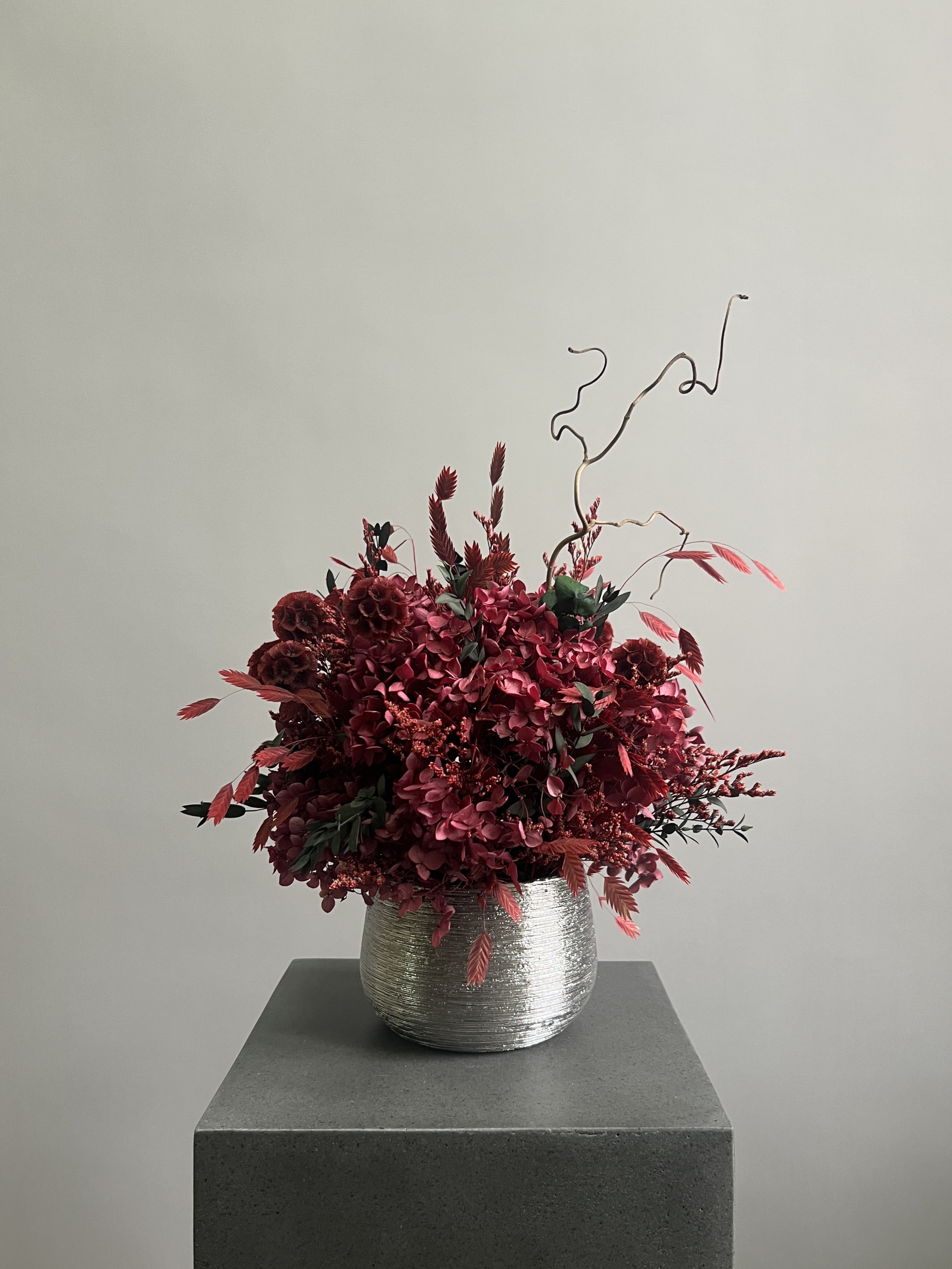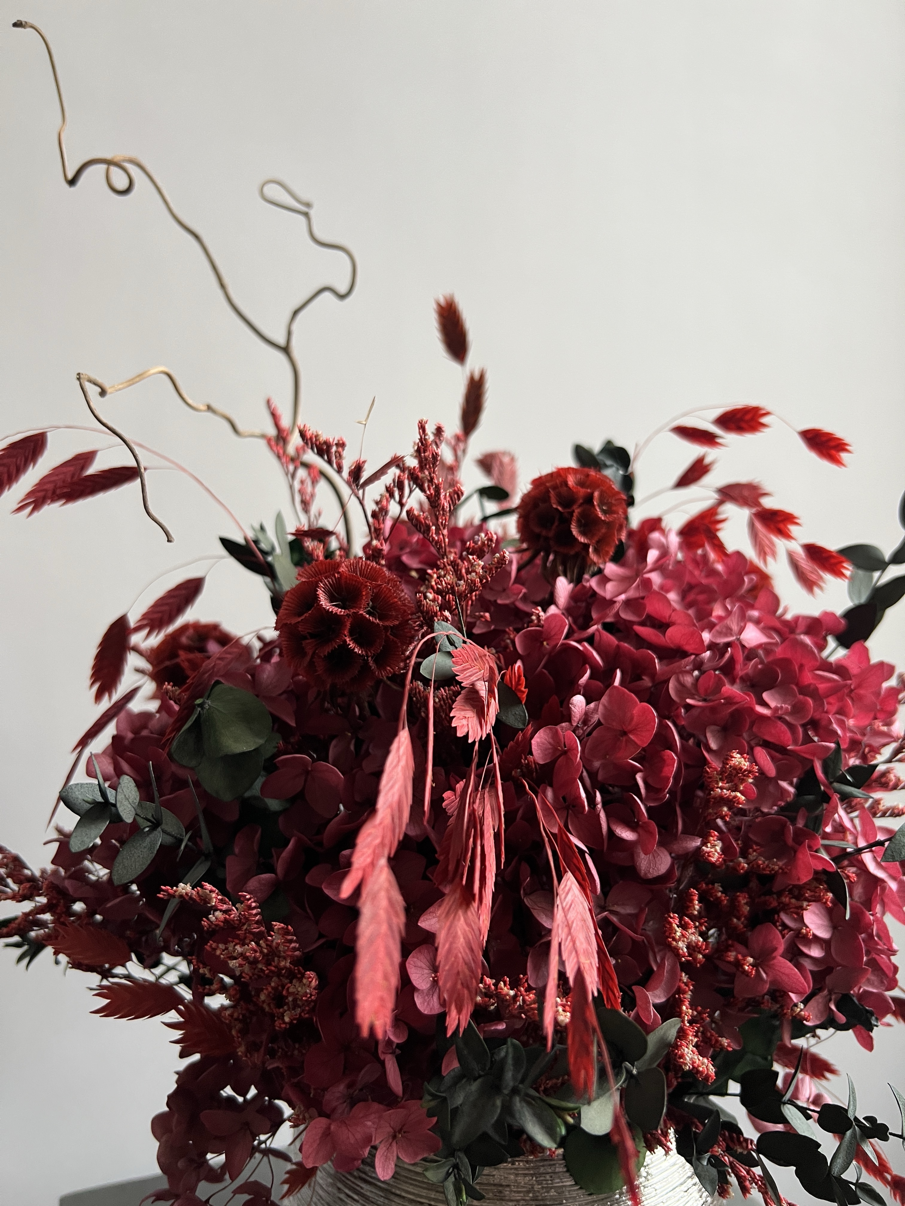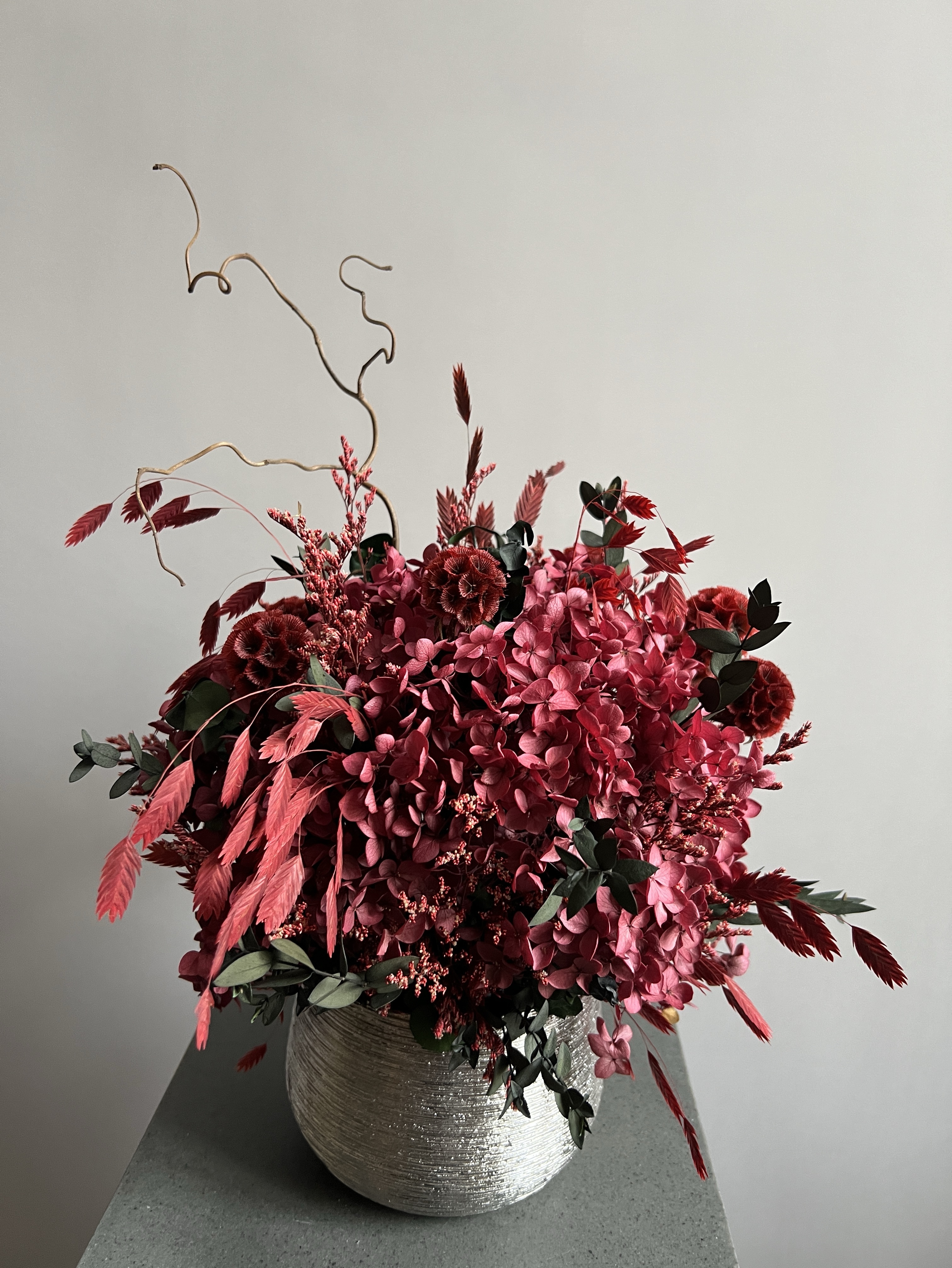 Композиция из сухоцветов и стабилизированных цветов в кашпо