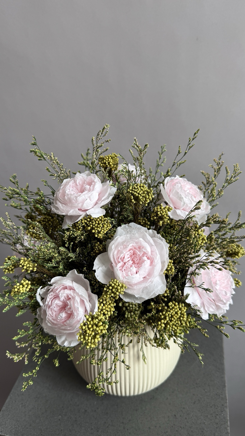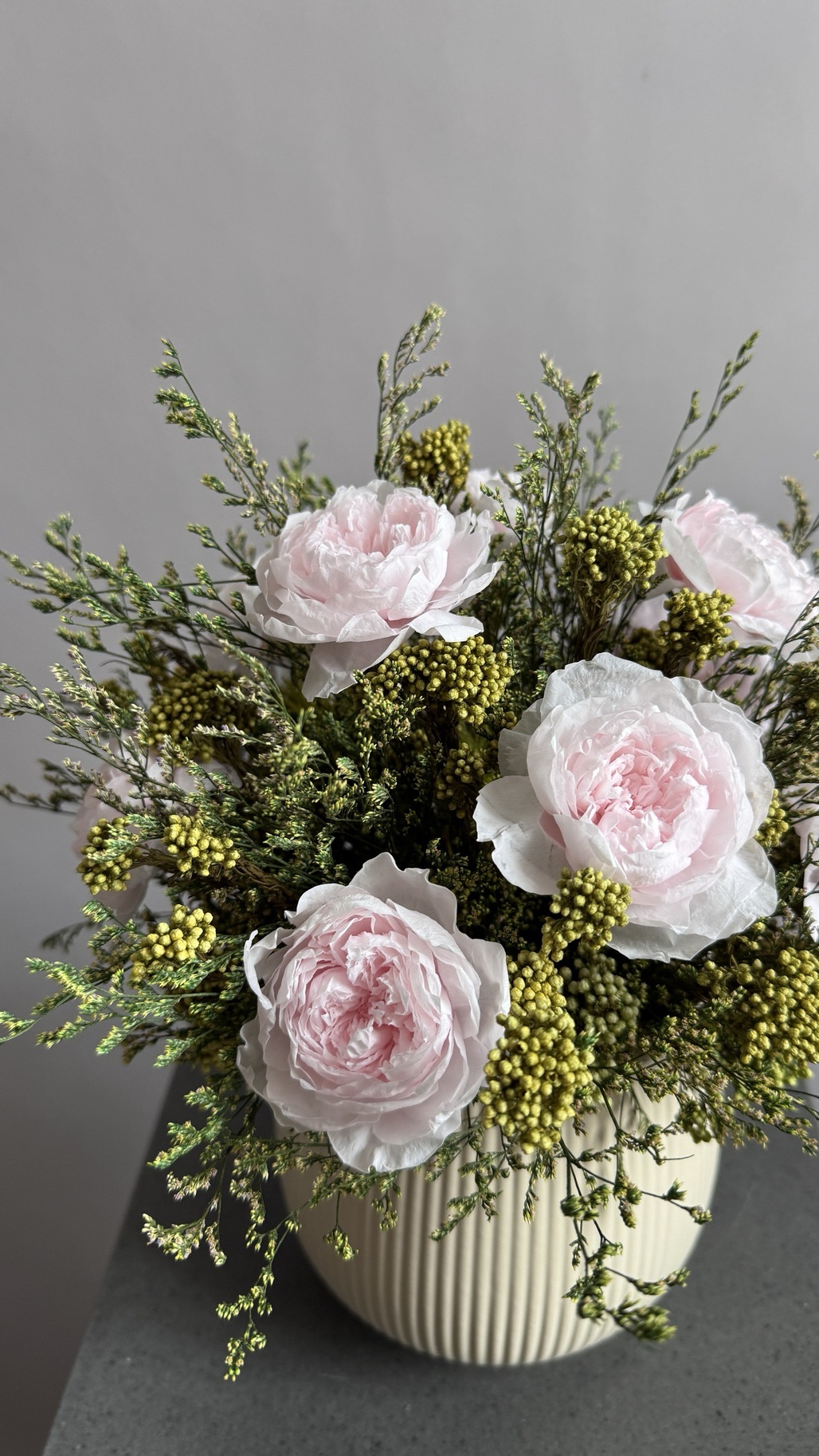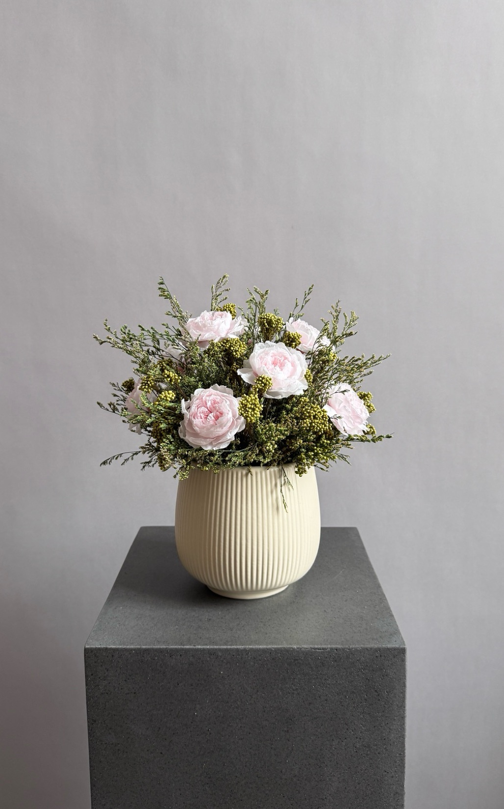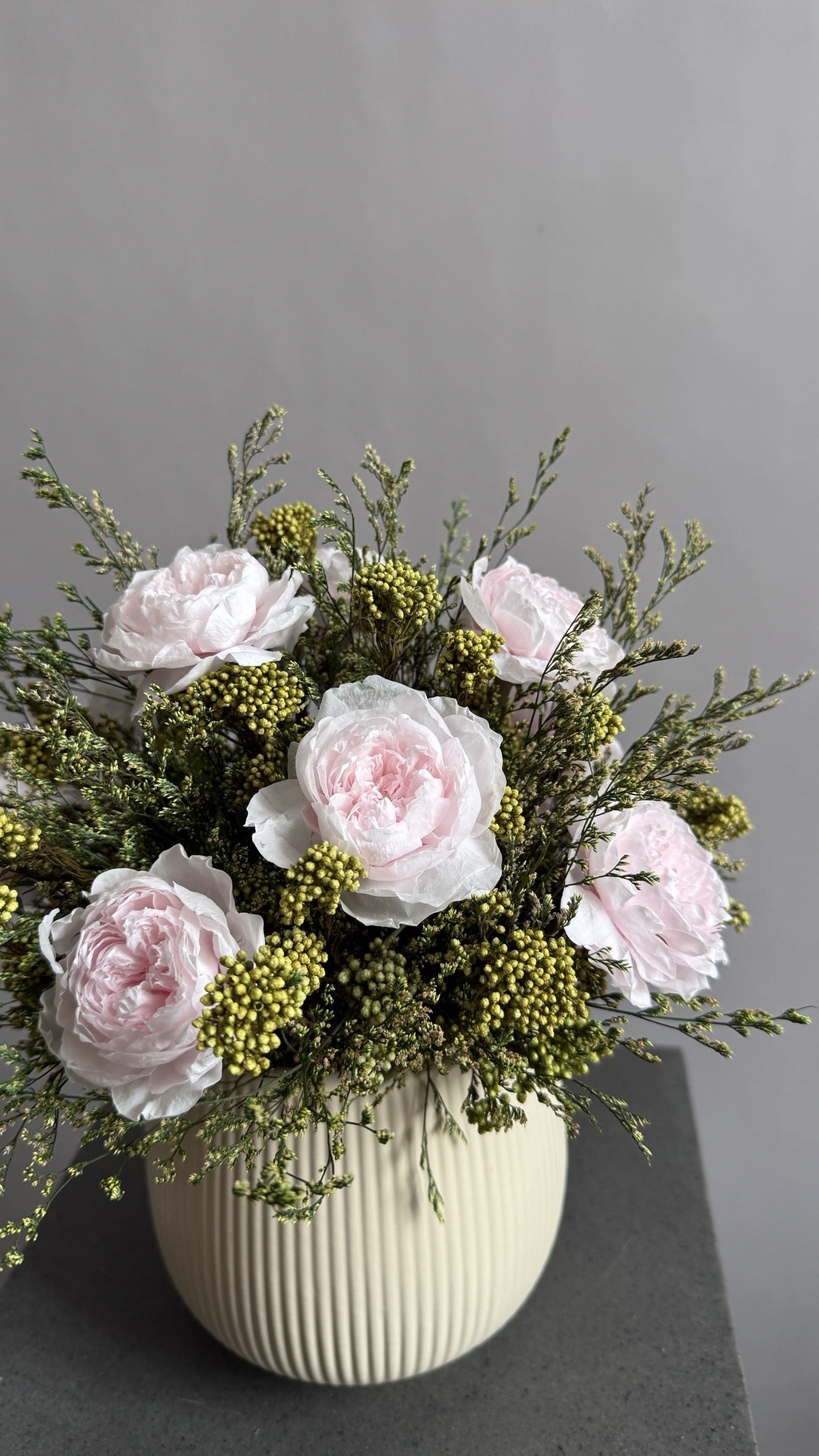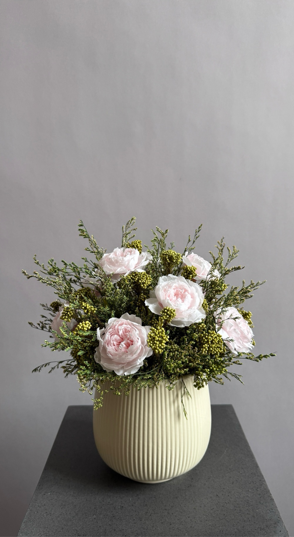 Состав: розы пионовидные стабилизированные розовые - 9 шт, кермек стабилизированный салатовый, озотамнус стабилизированный салатовый, флористическая губка, кашпо керамическое