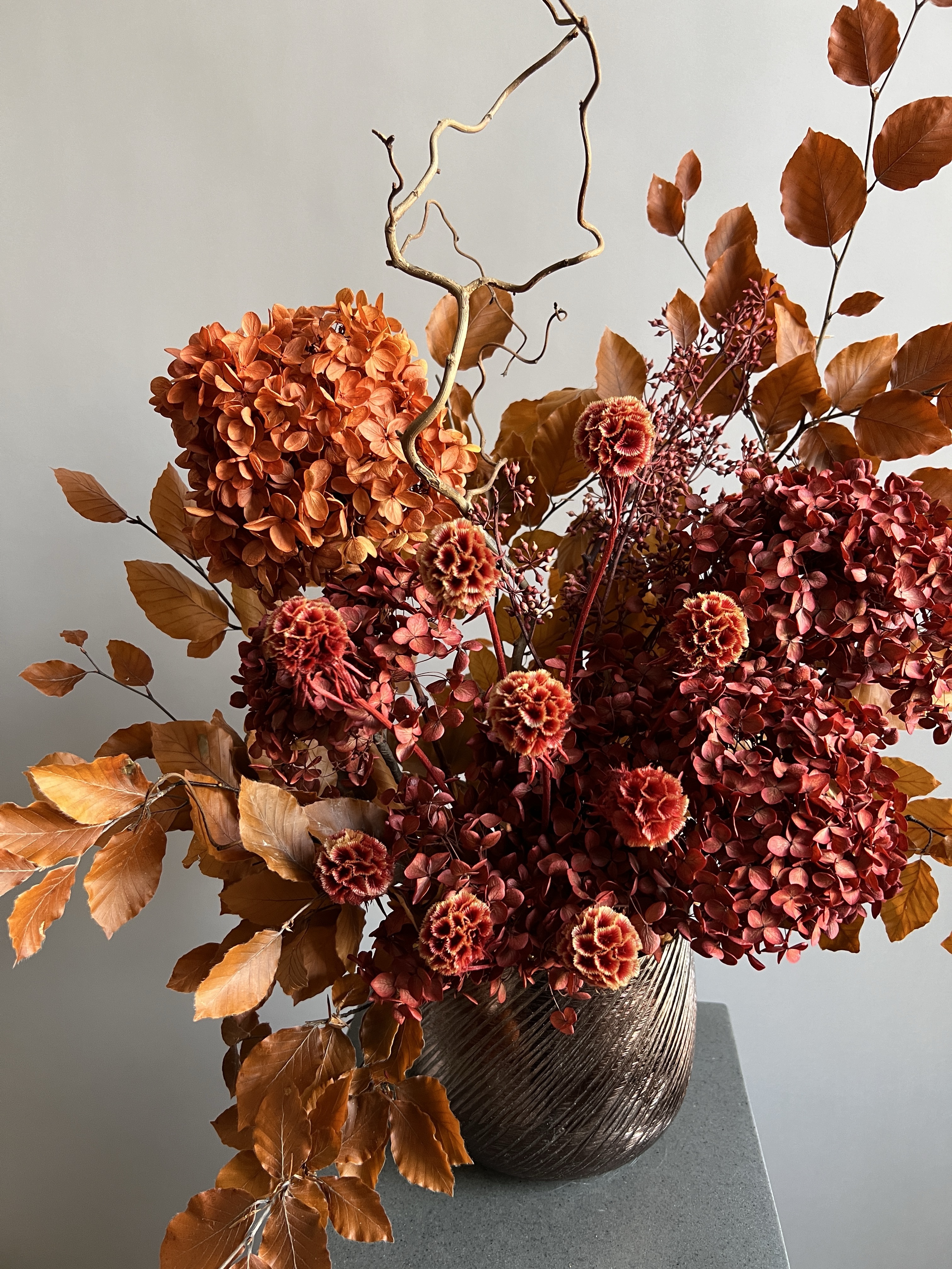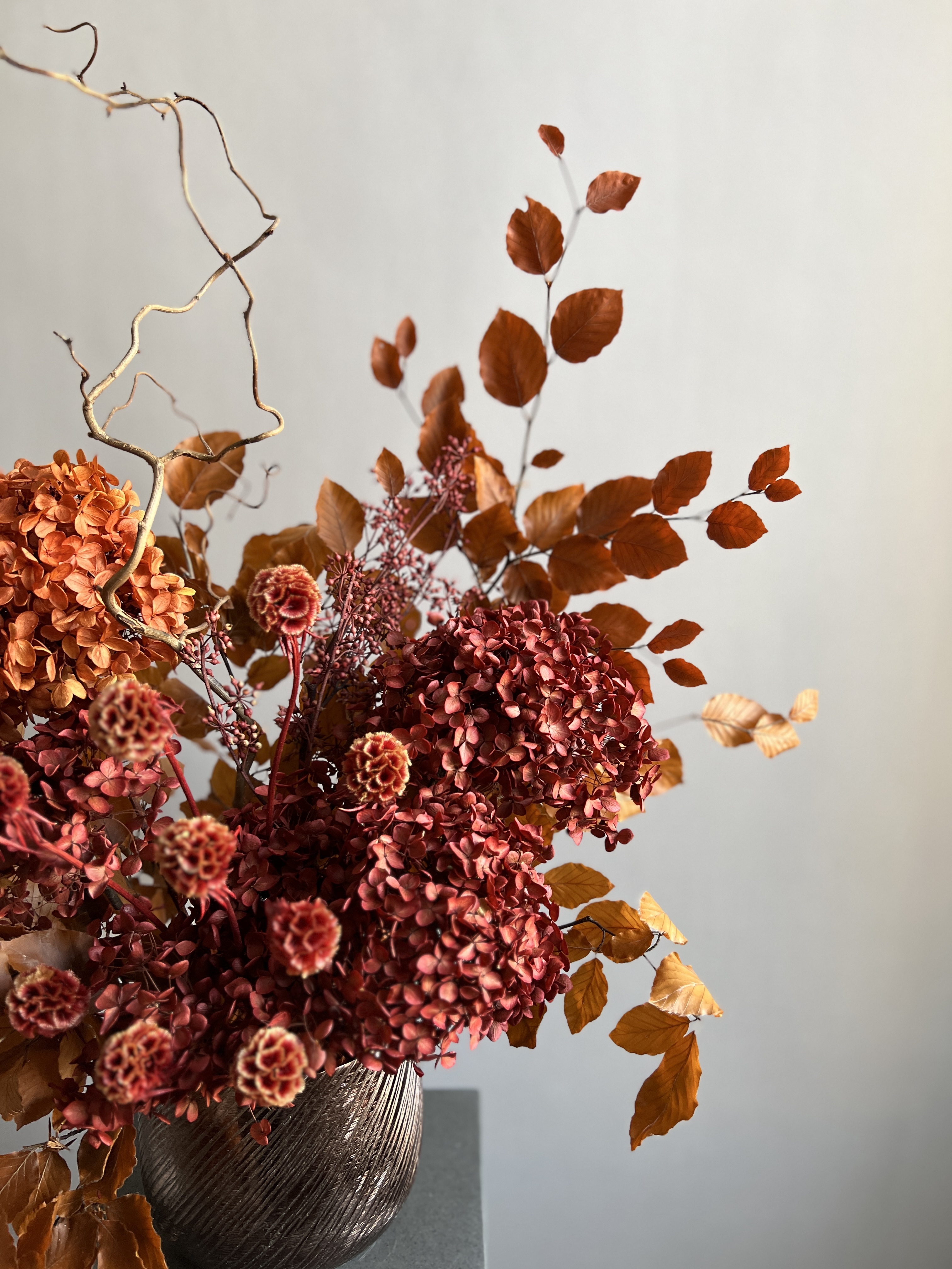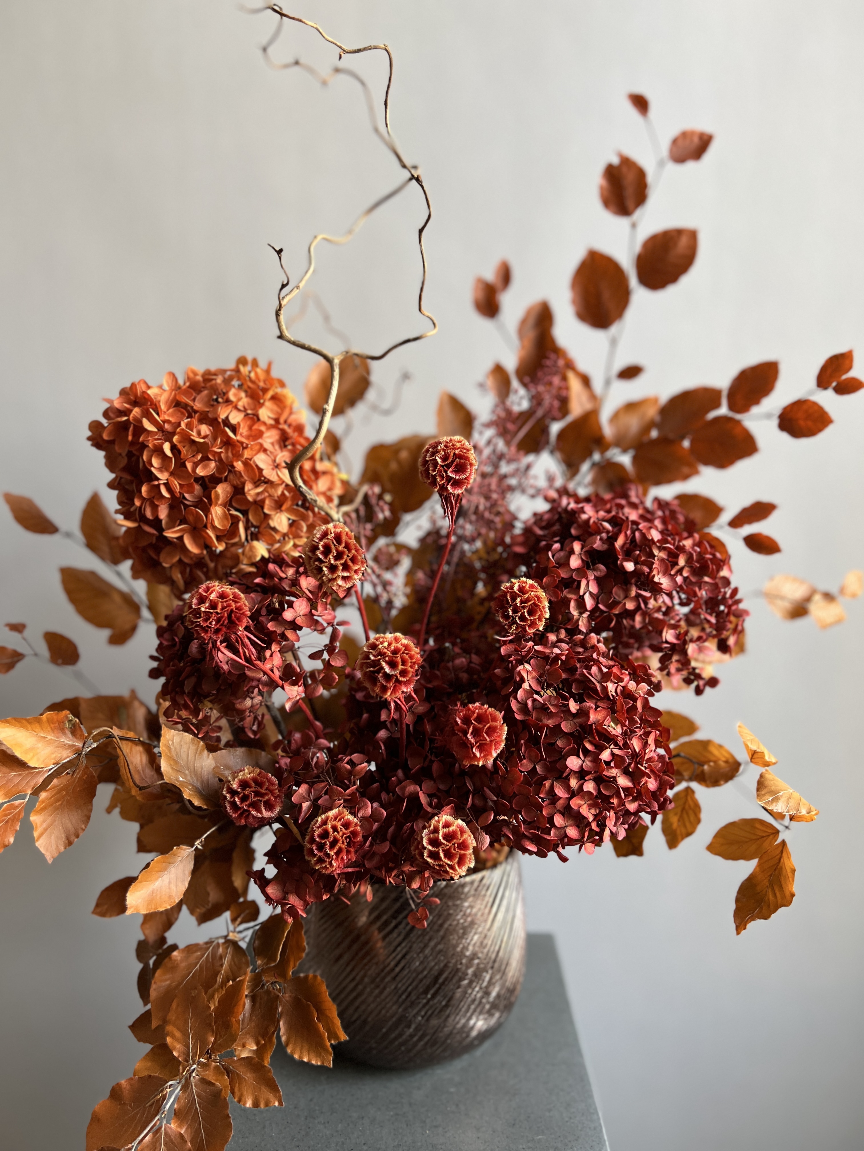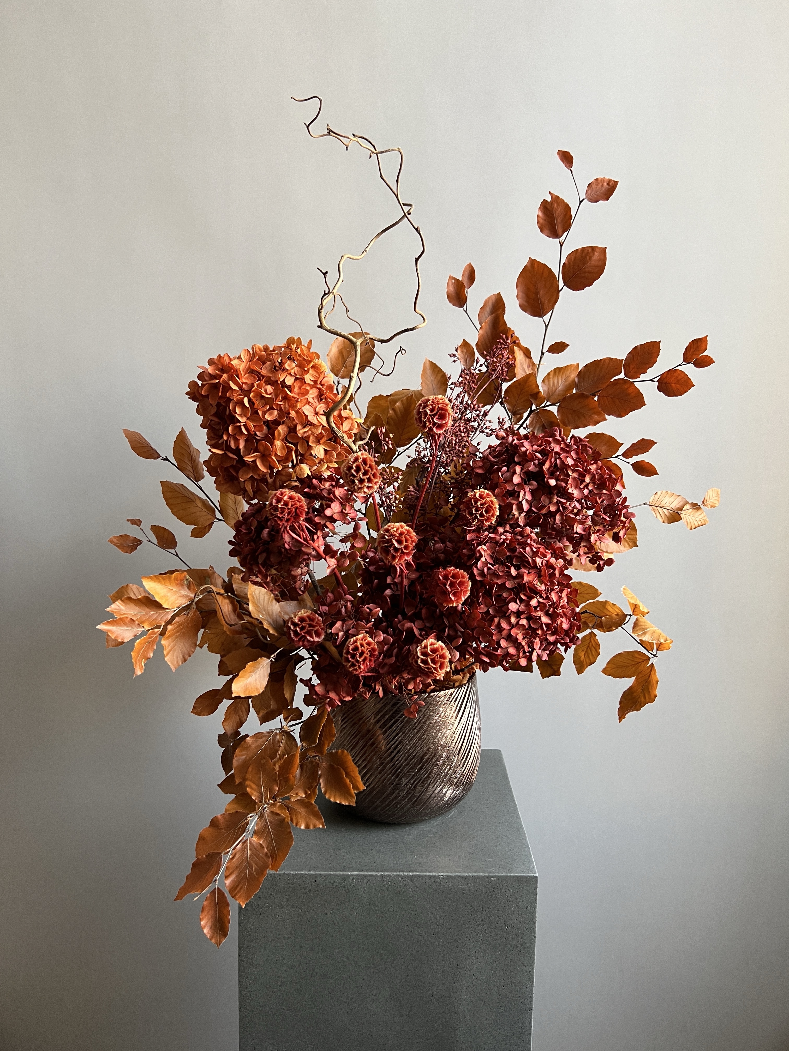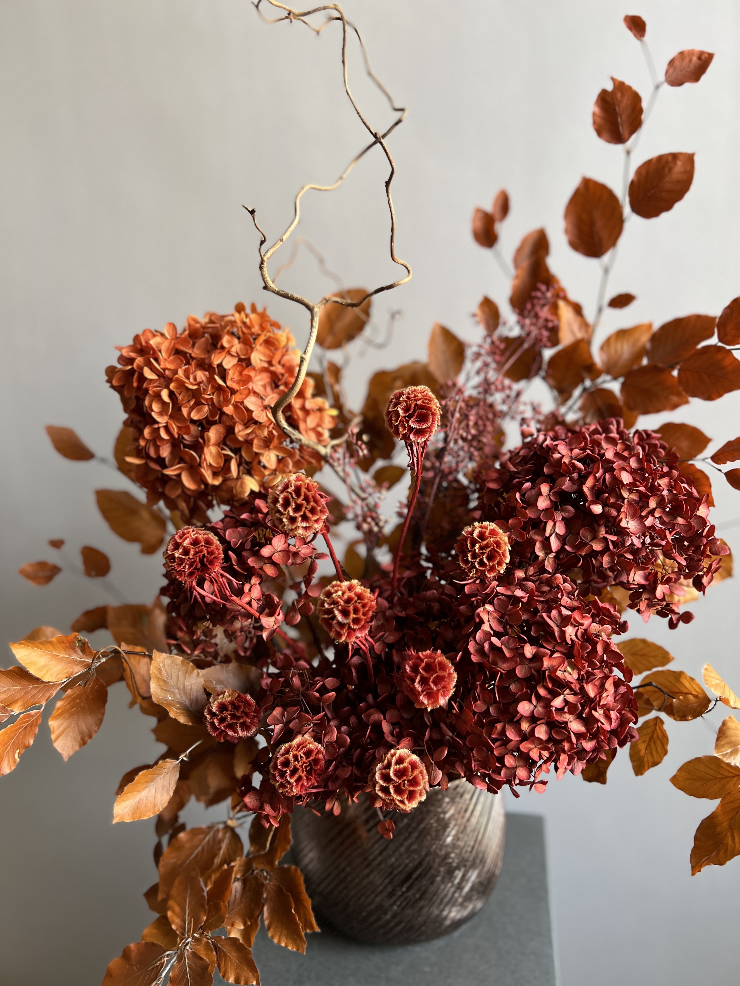 Состав: гортензия стабилизированная, бук стабилизированный, скабиоза, корилус, плоды эвкалипта бордовые, флористическая губка, кашпо