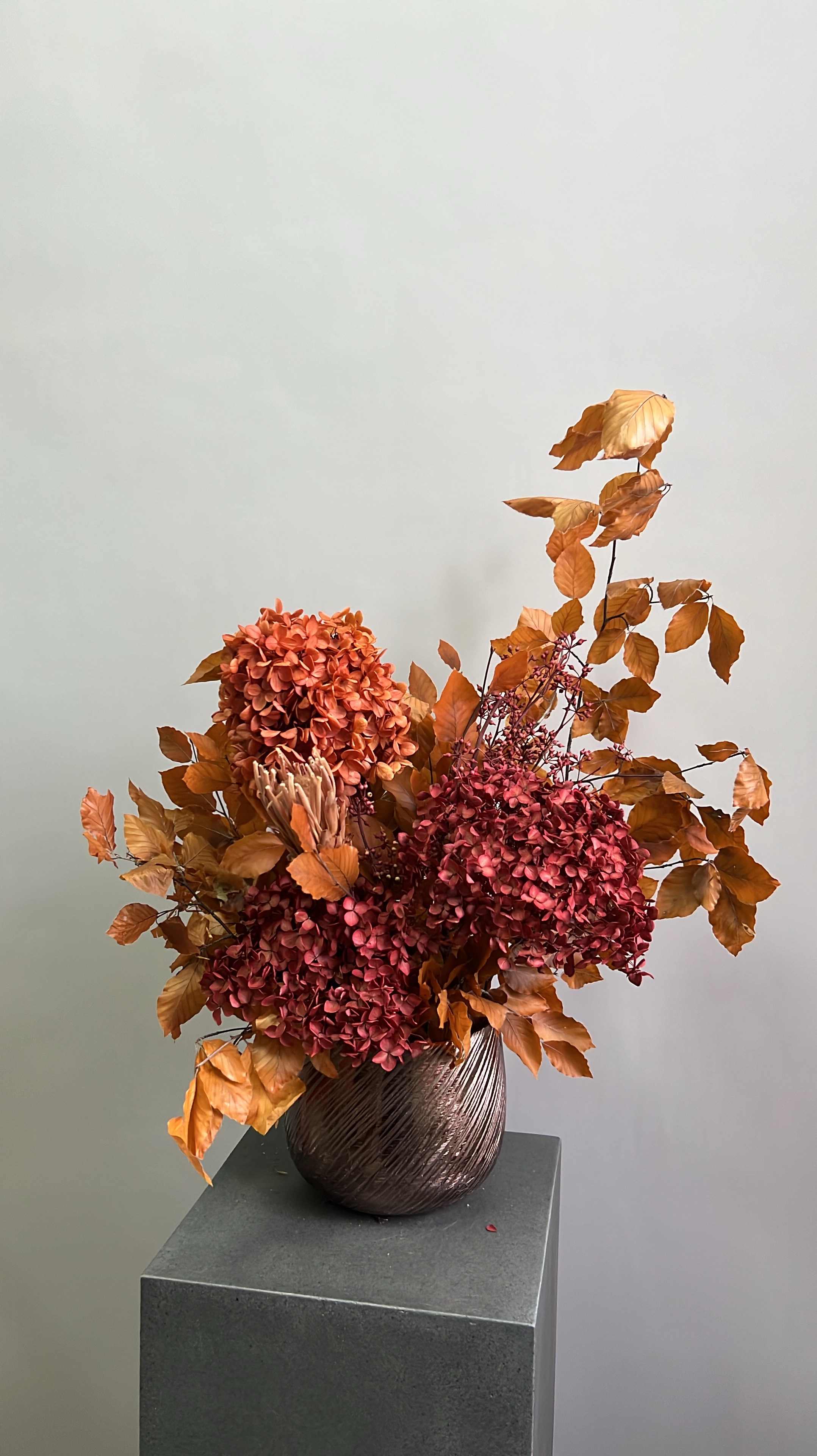 Состав: гортензия стабилизированная, бук стабилизированный, протея карнивал, плоды эвкалипта бордовые, мох, флористическая губка, кашпо