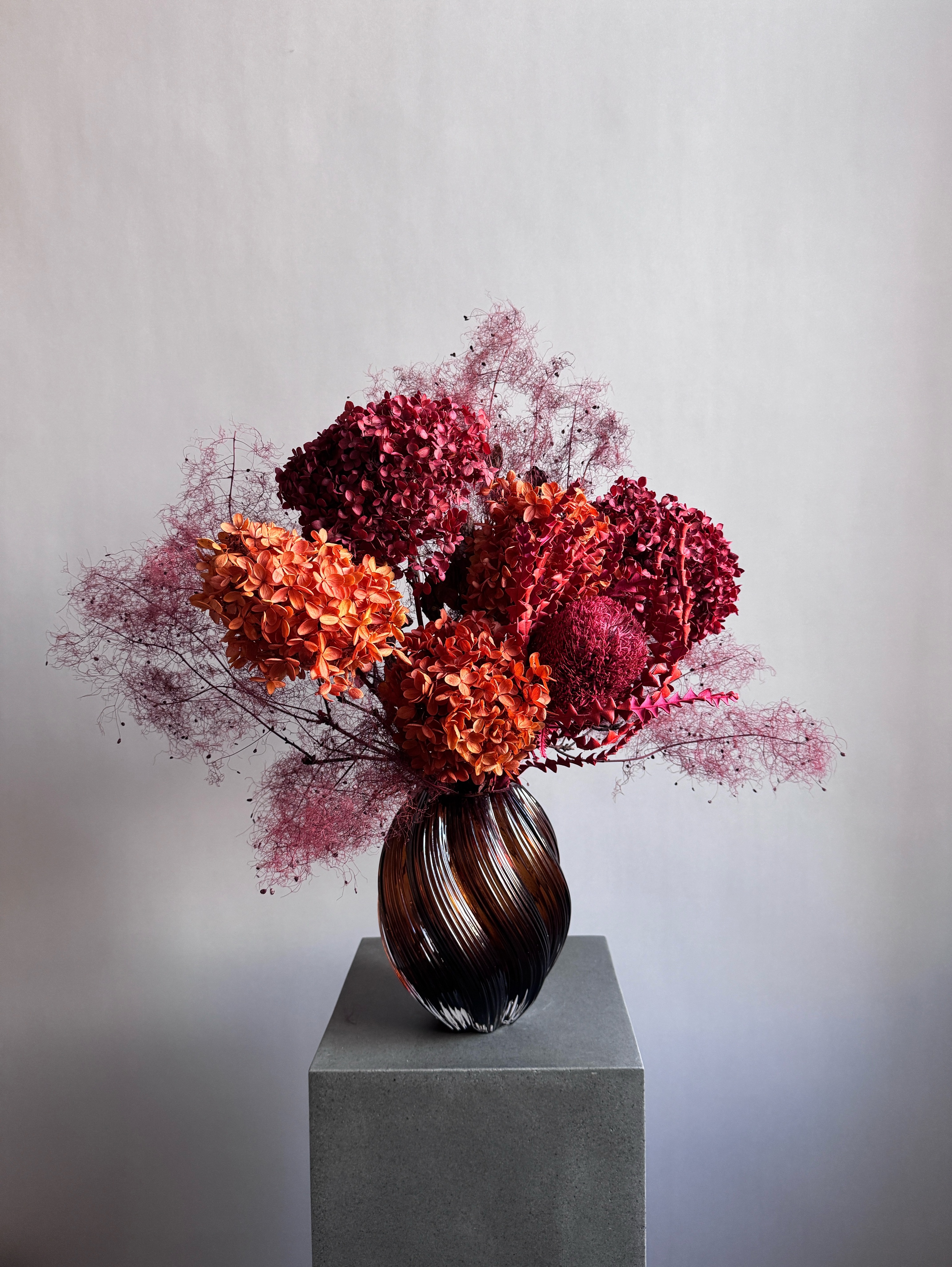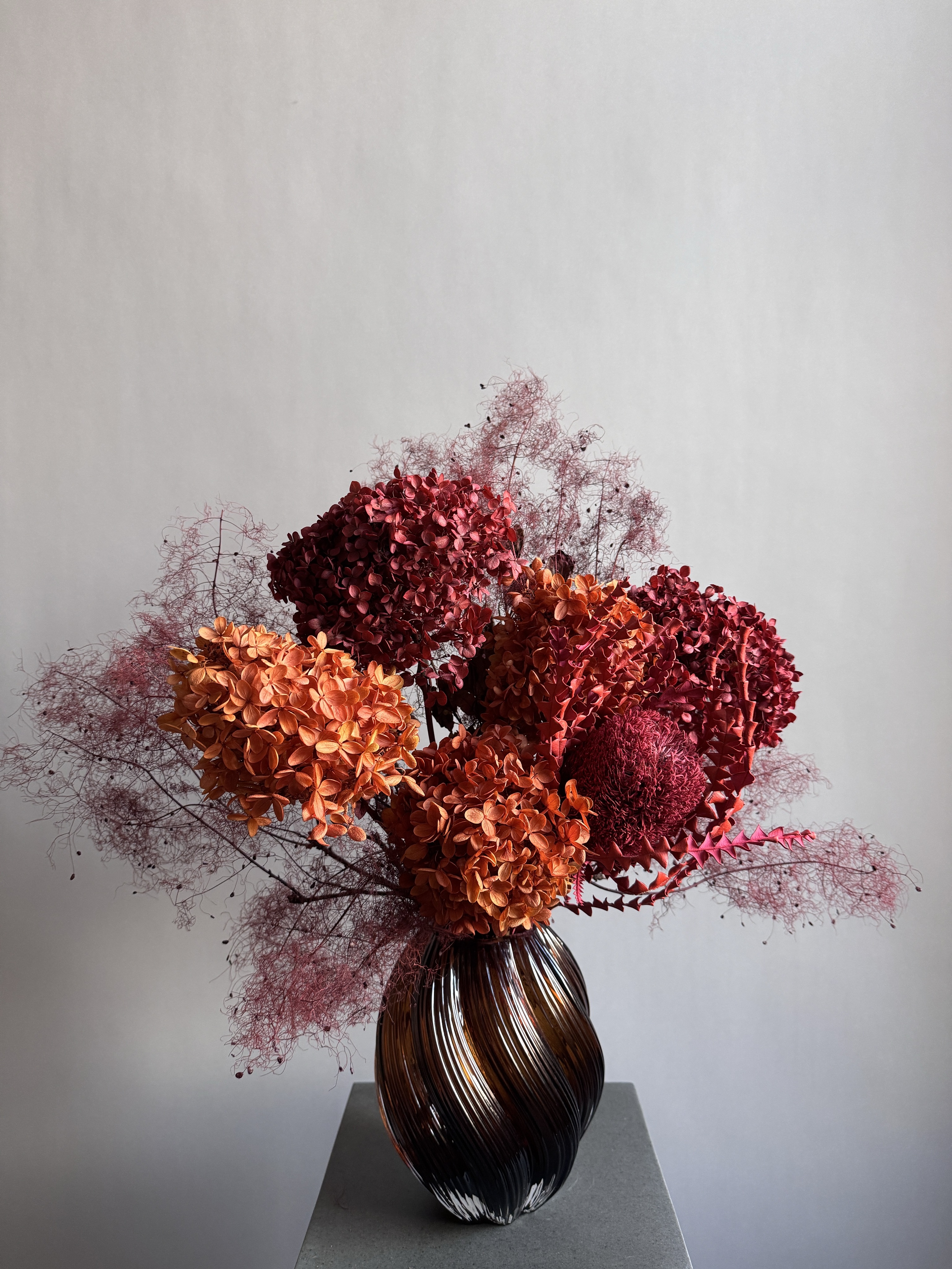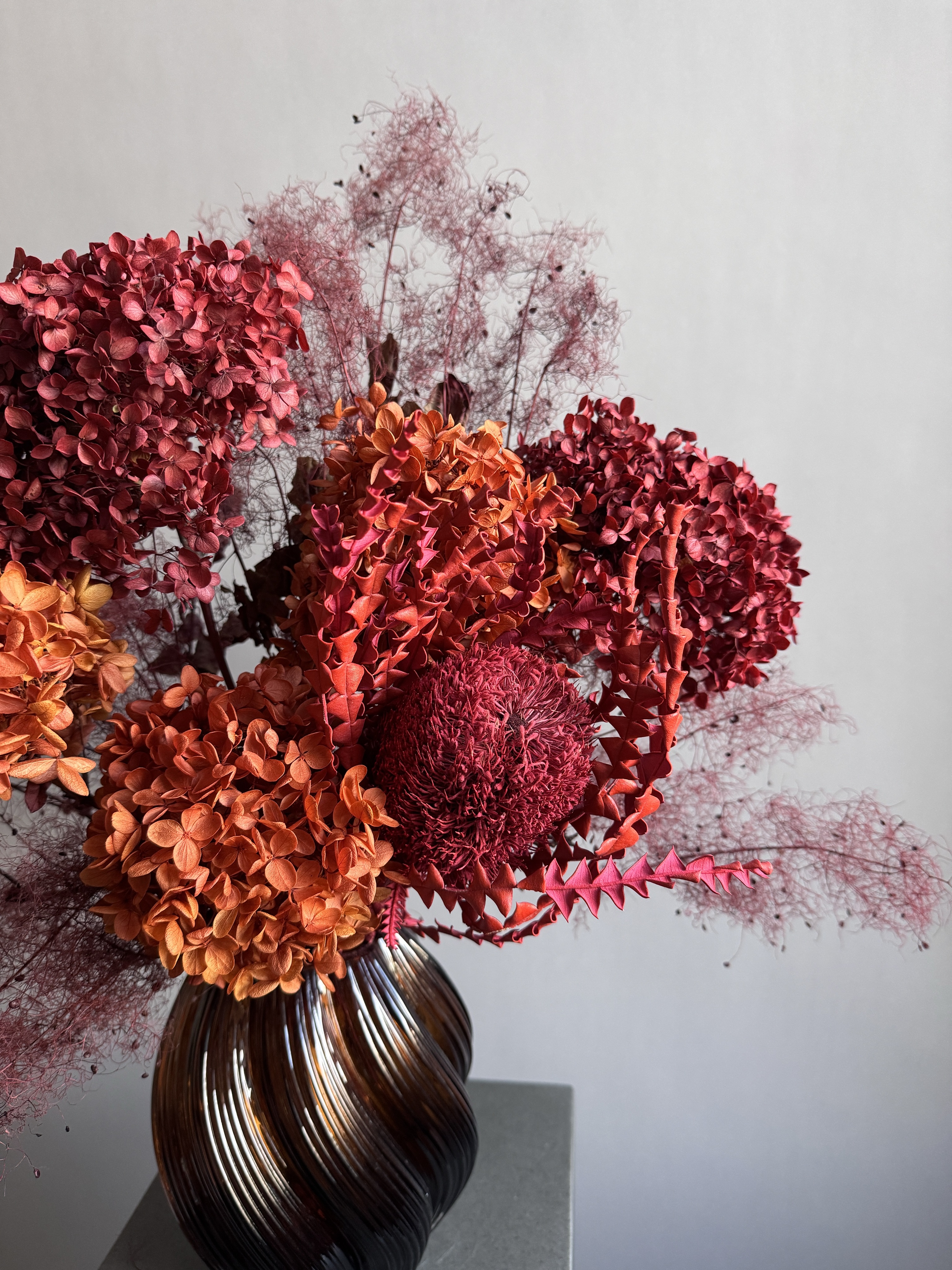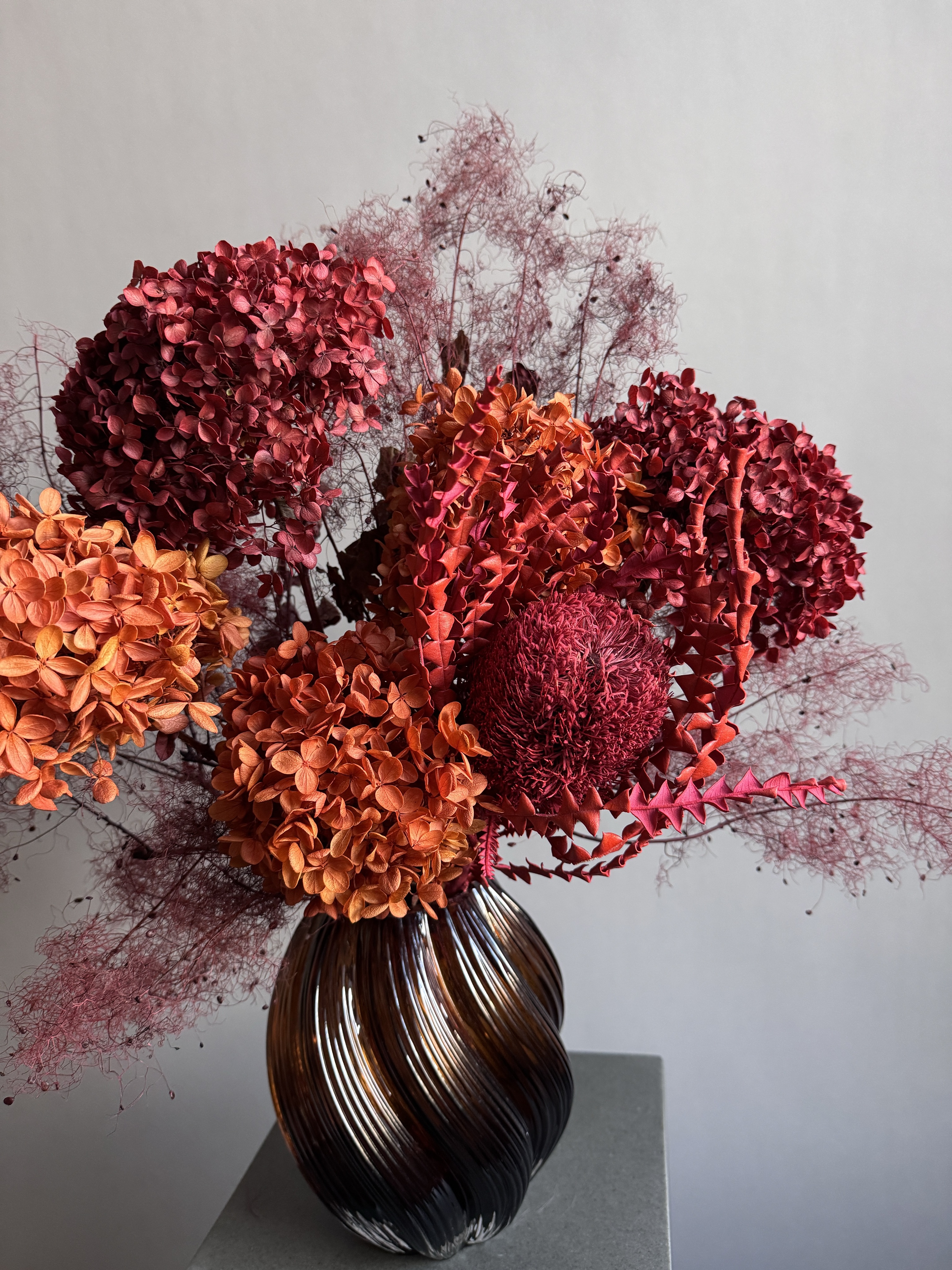 Интерьерная композиция из сухоцветов и стабилизированных цветов в кашпо