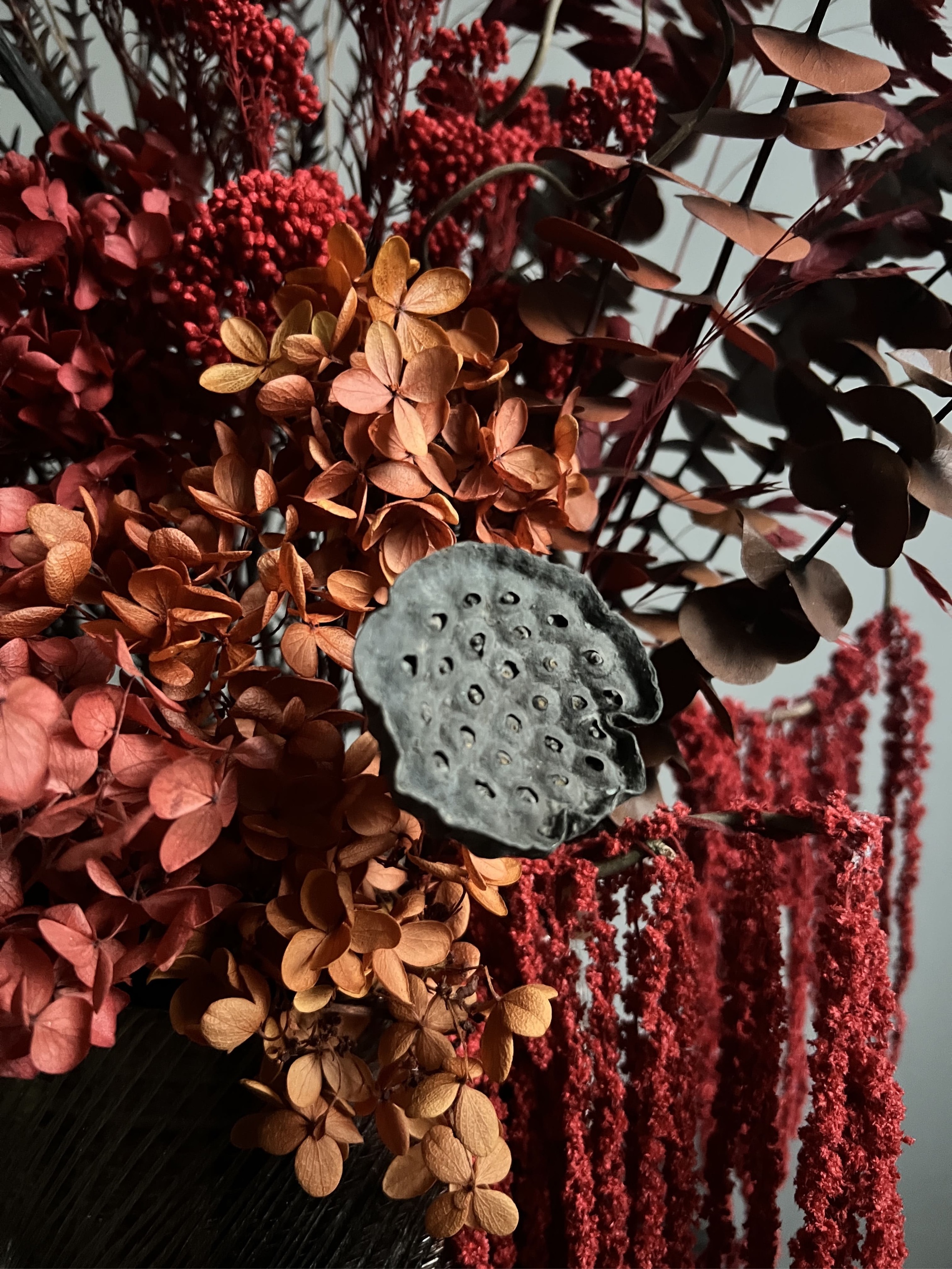 Состав: гортензия стабилизированная, лотосы, озотамнус стабилизированный, иванхое, хасмантиум, корилус, эвкалипт стабилизированный бейби, амарант стабилизированный, мох стабилизированный, губка для сухоцветов, кашпо керамическое
