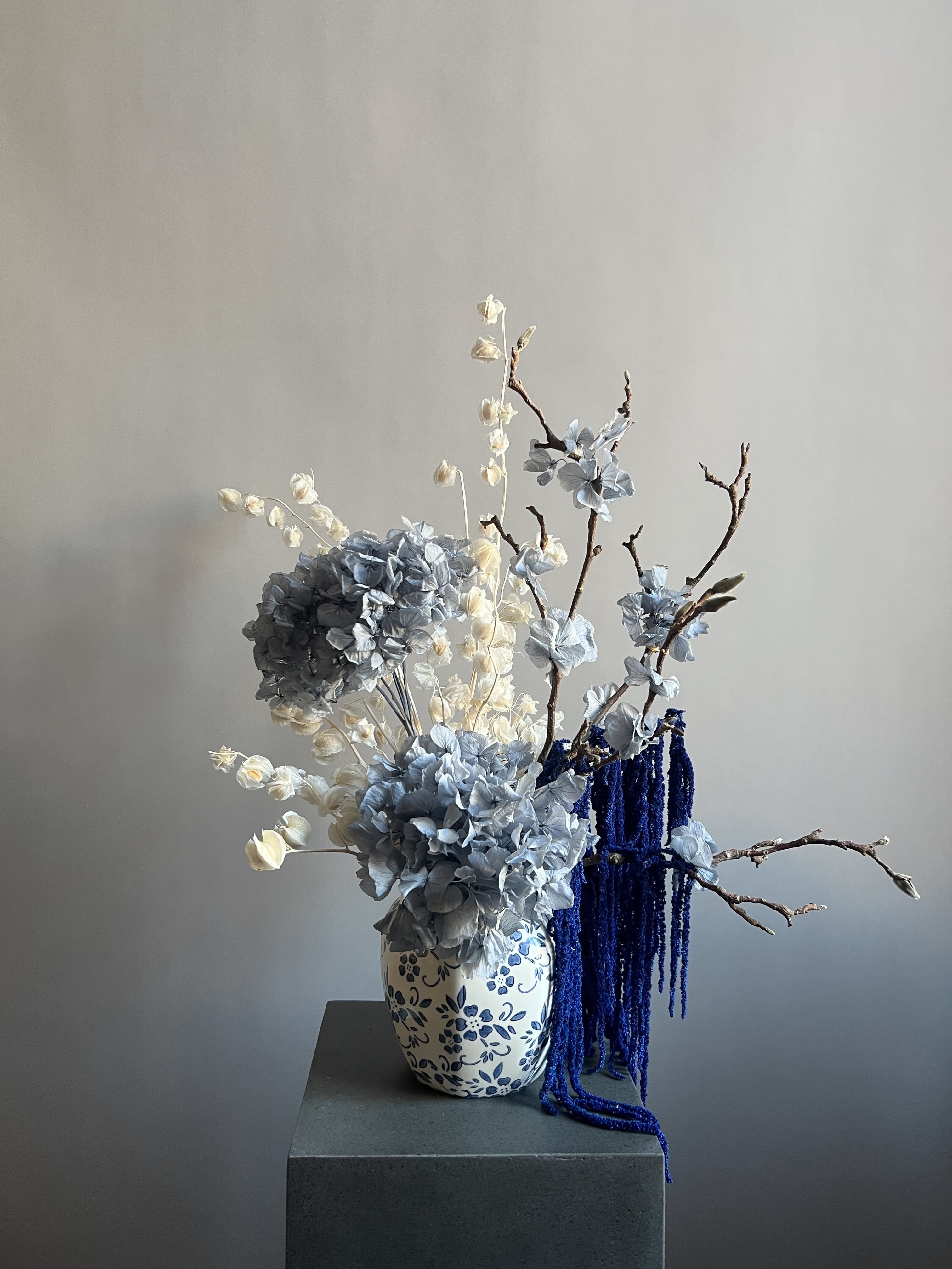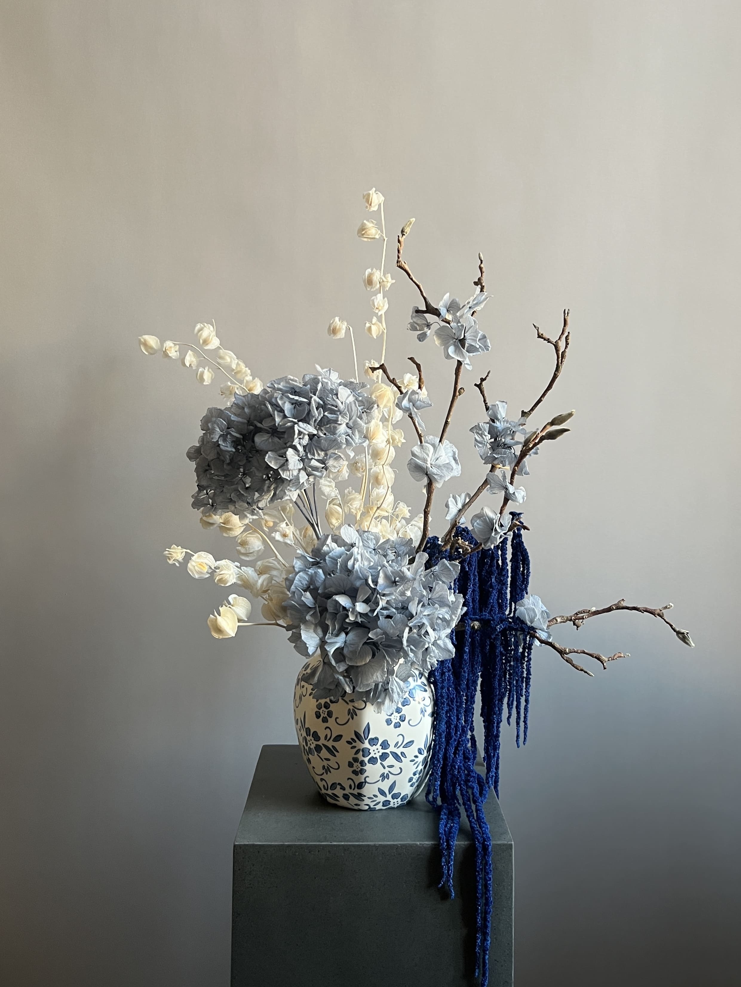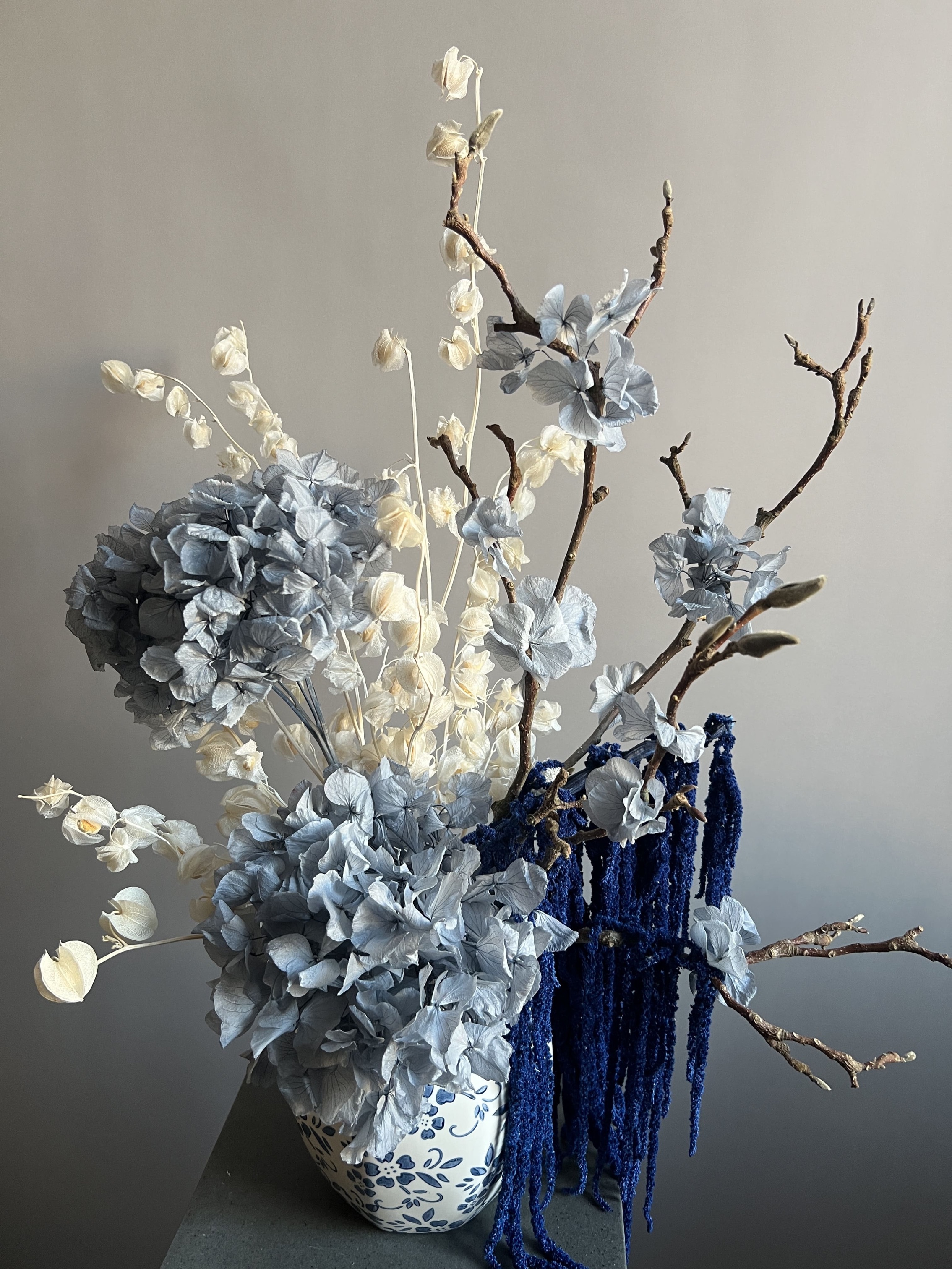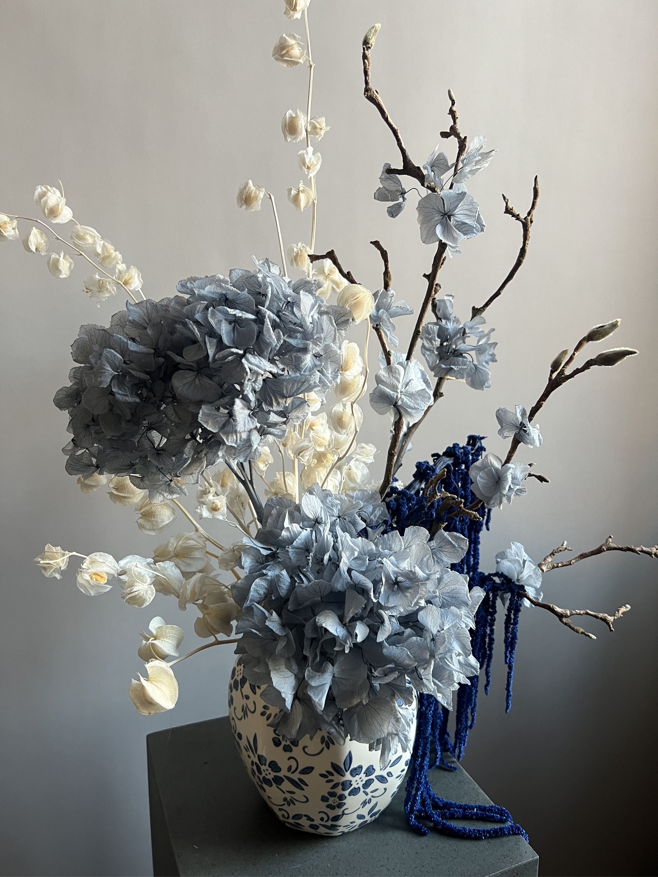 Состав: гортензия стабилизированная макрофила серая, ветки магнолия, физалис, амарант стабилизированный, мох стабилизированный. Кашпо керамическое в комплекте