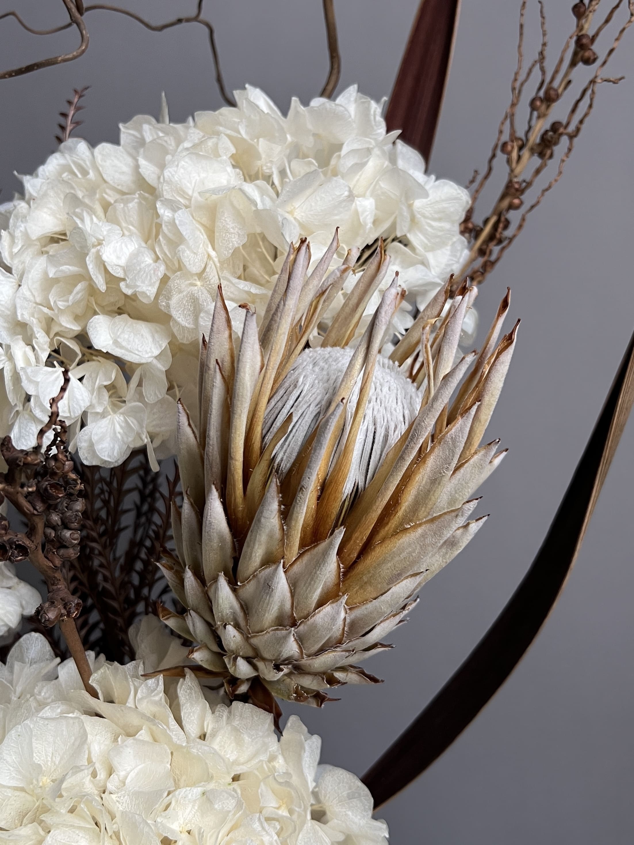 Состав: гортензия стабилизированная макрофила молочная, иванхое, корилус, протея Артик Айс, листья кокоса, мох стабилизированный
