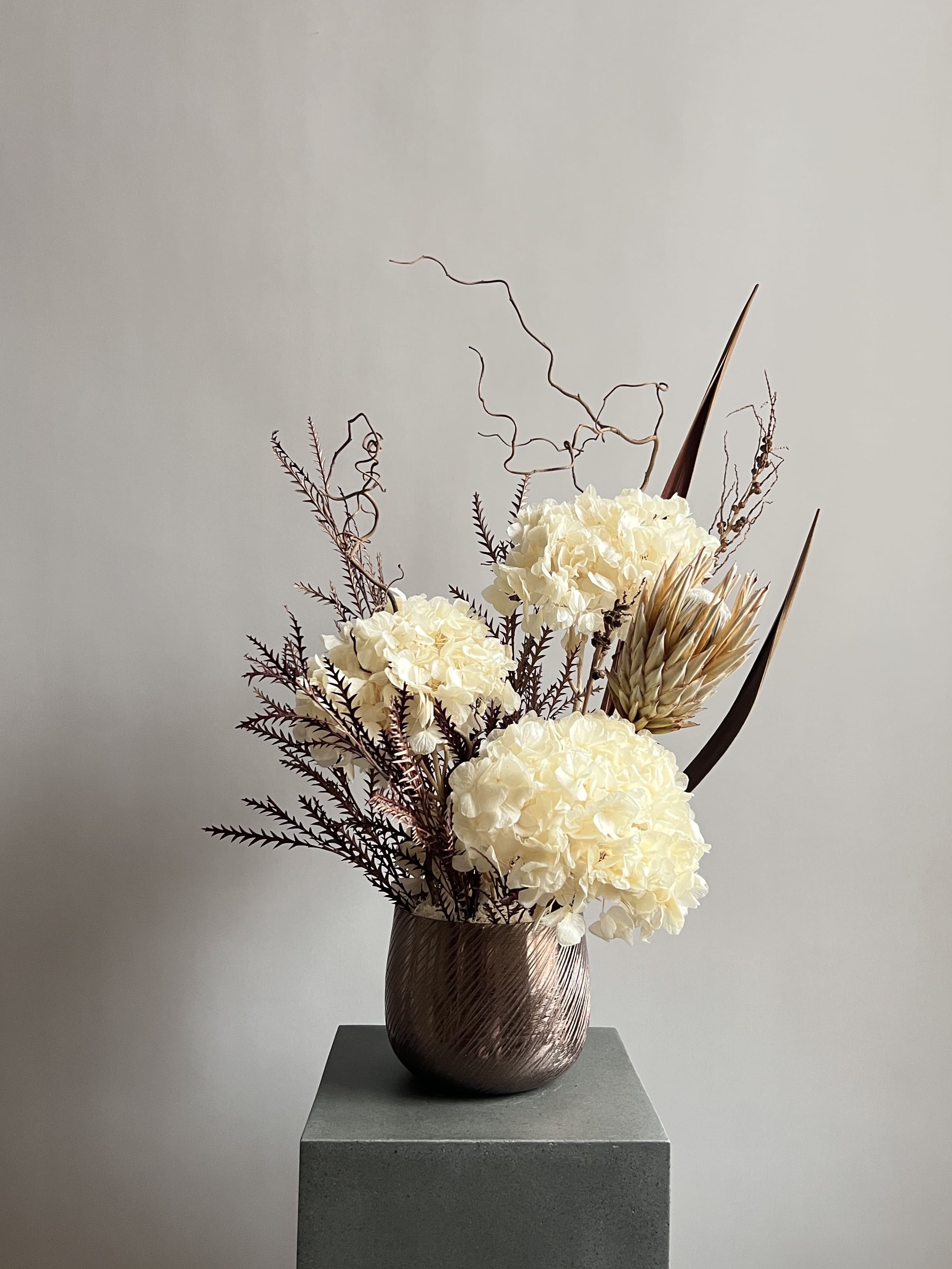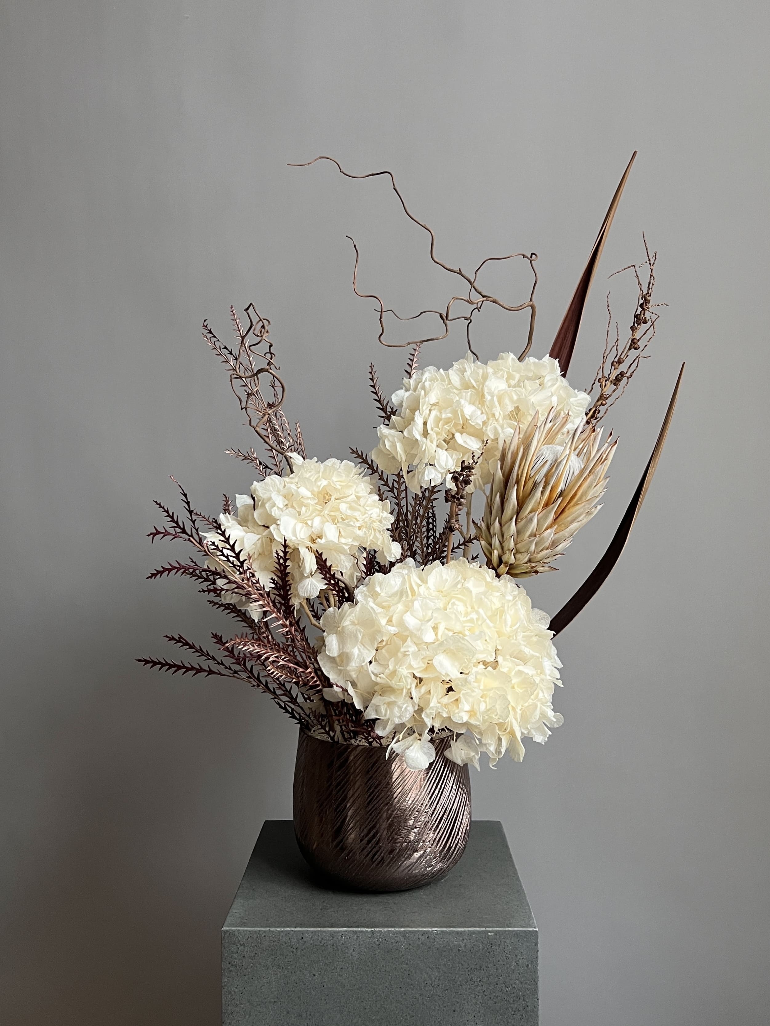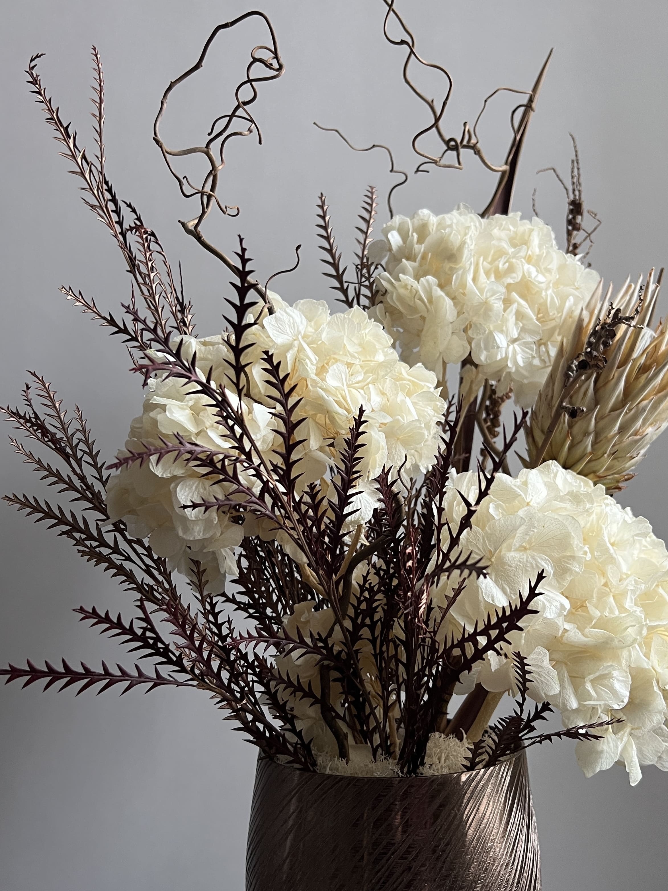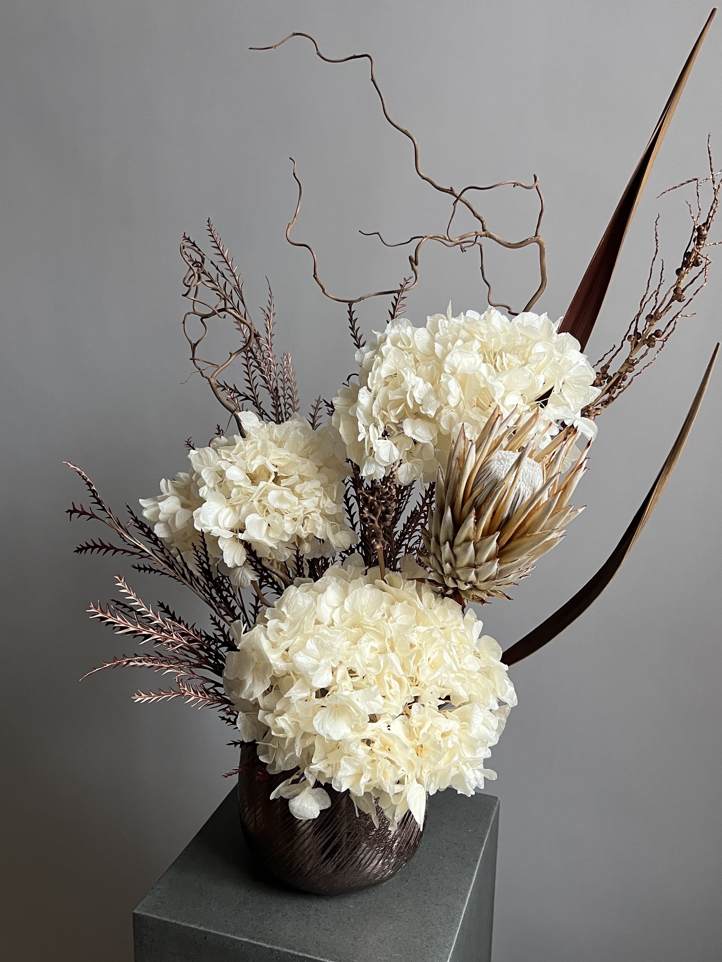 Стильная интерьерная композиция из сухоцветов и стабилизированных цветов в натуральной гамме