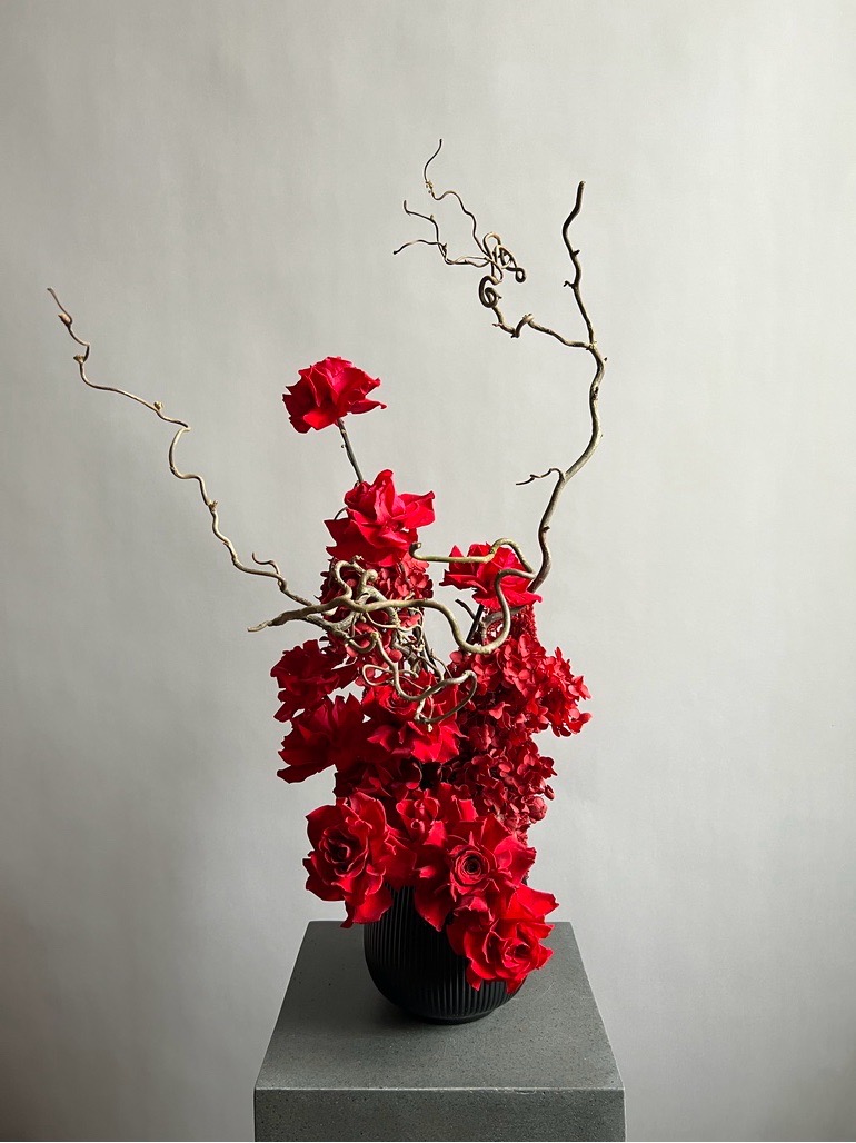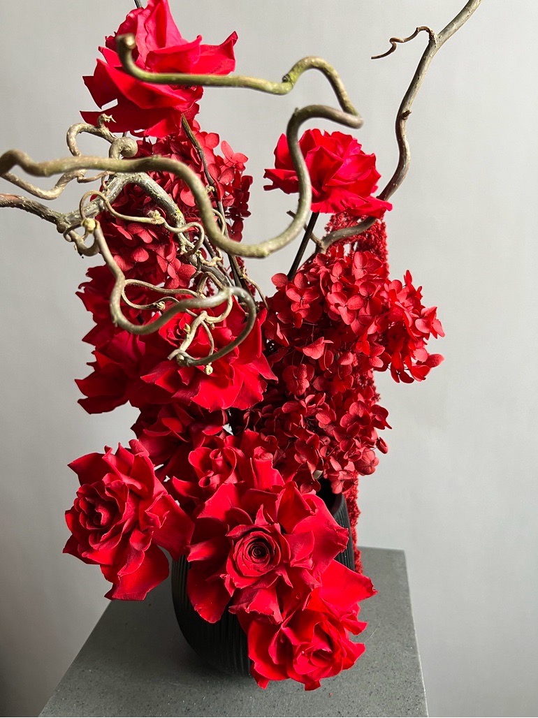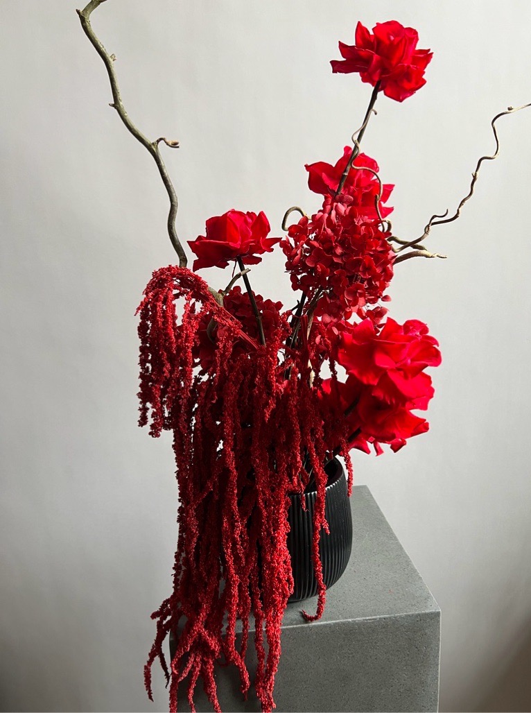 Состав: розы стабилизированные, гортензия стабилизированная, корилус, амарант, губка, кашпо.