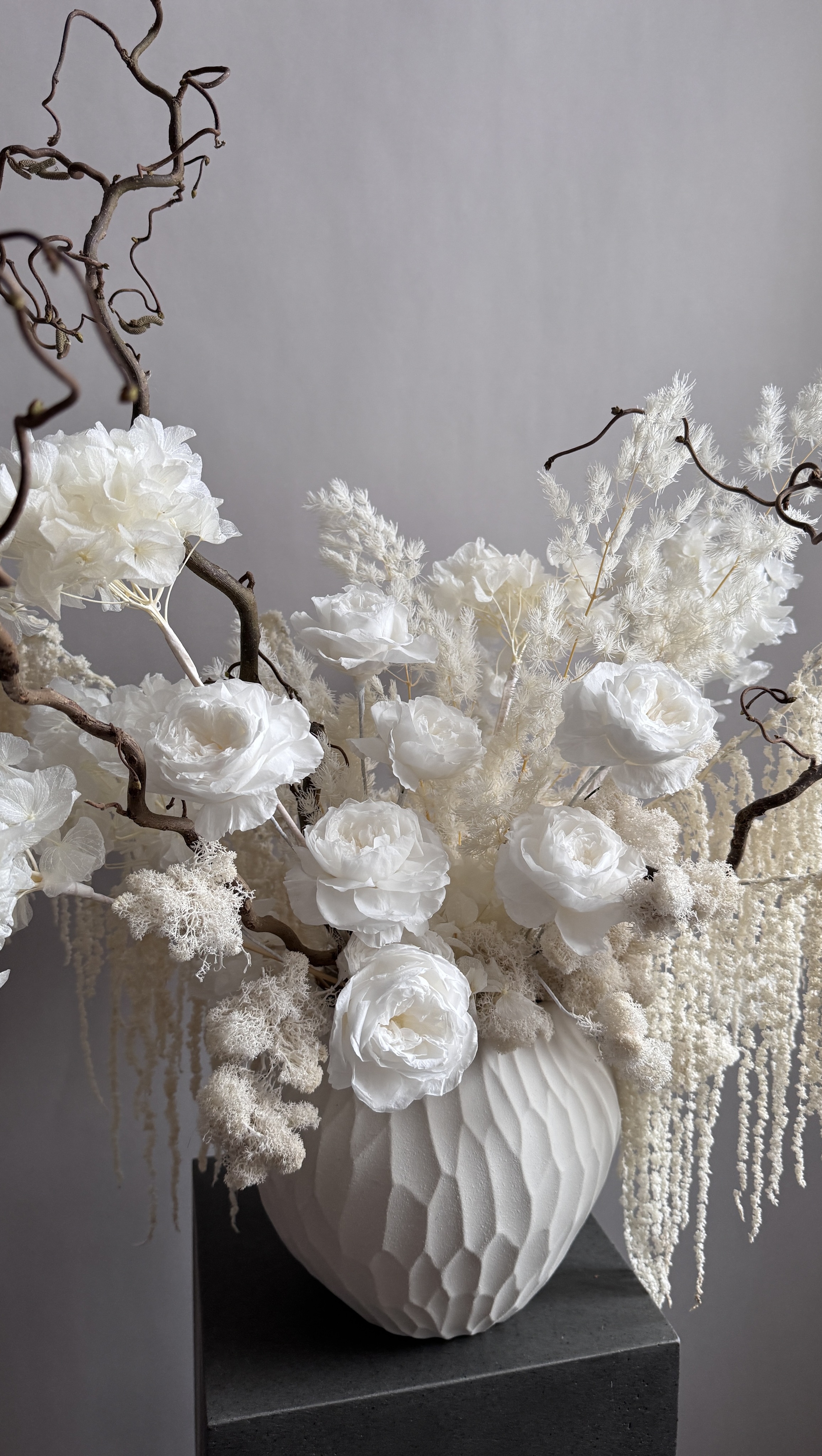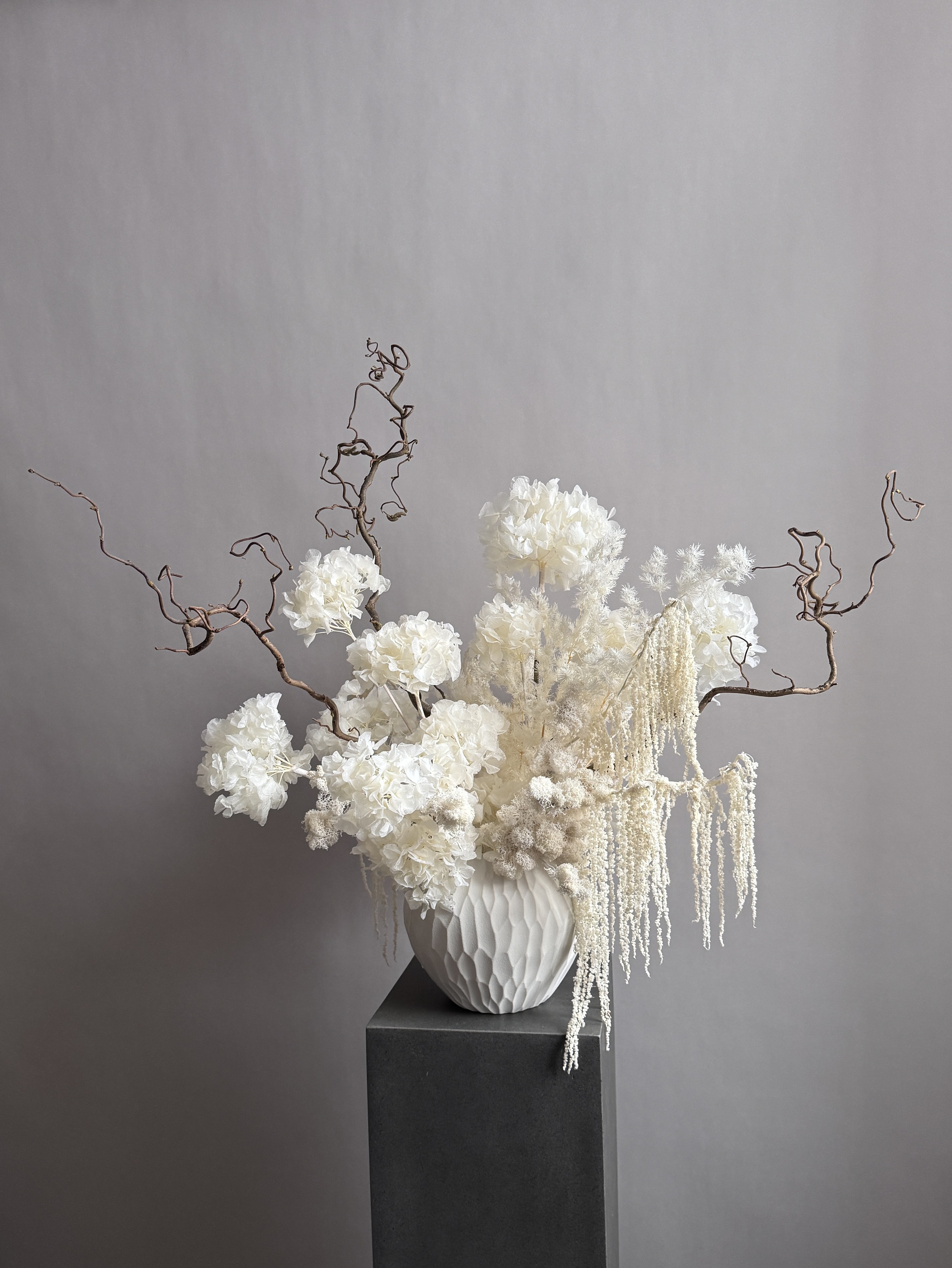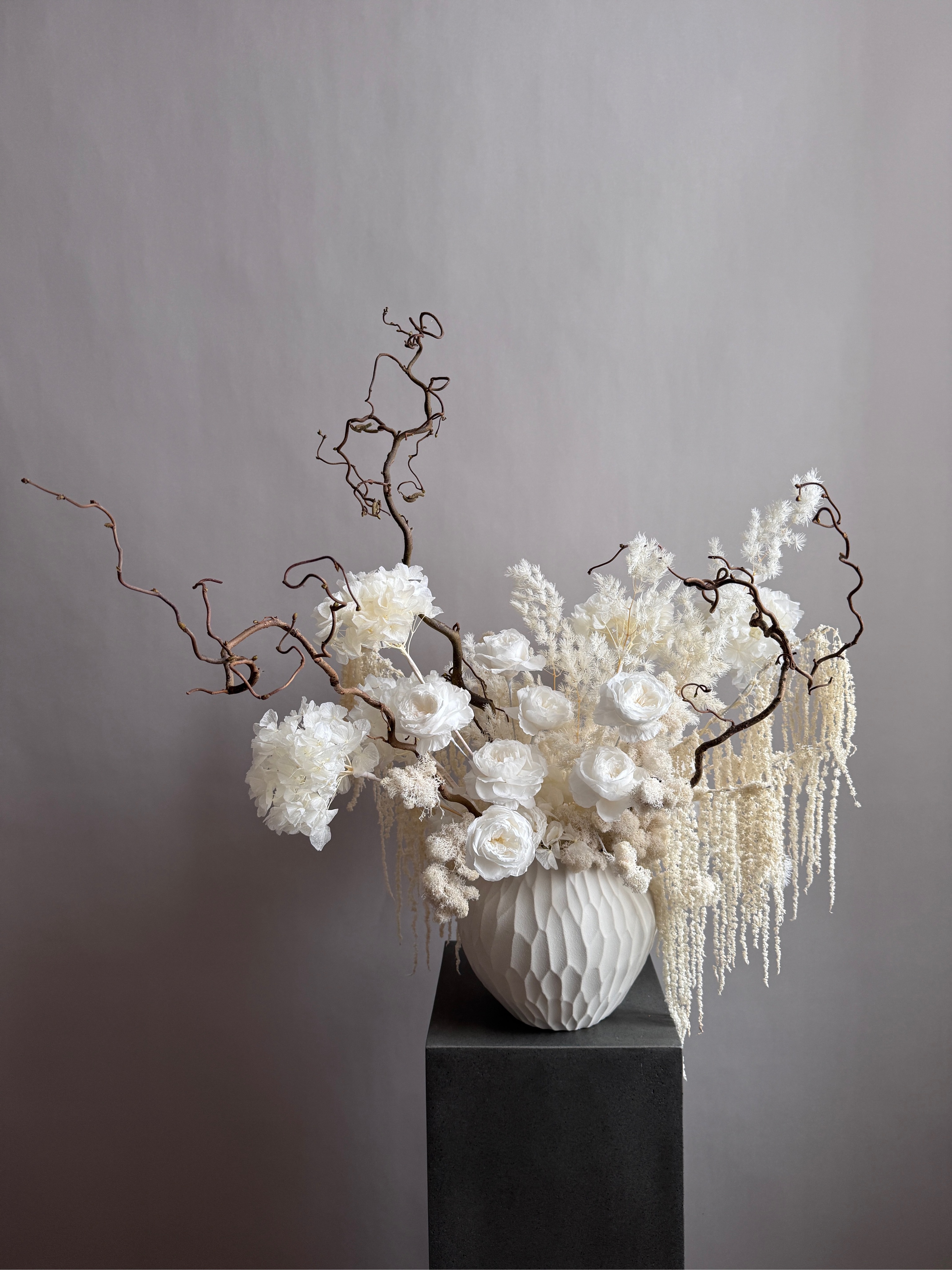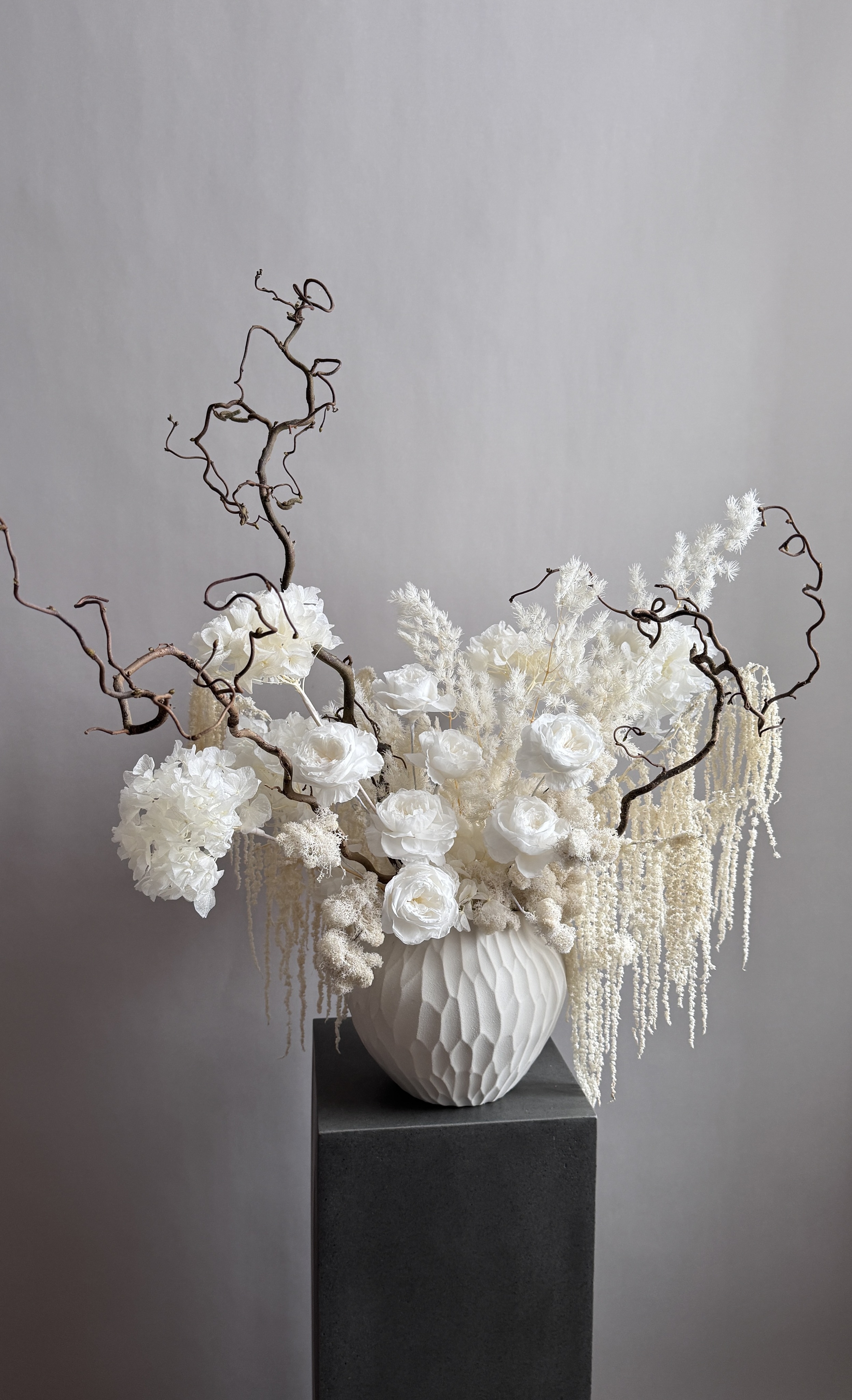 Состав: гортензия стабилизированная, корилус, аспарагус, амарант стабилизированный, розы пионовидные, мох, кашпо