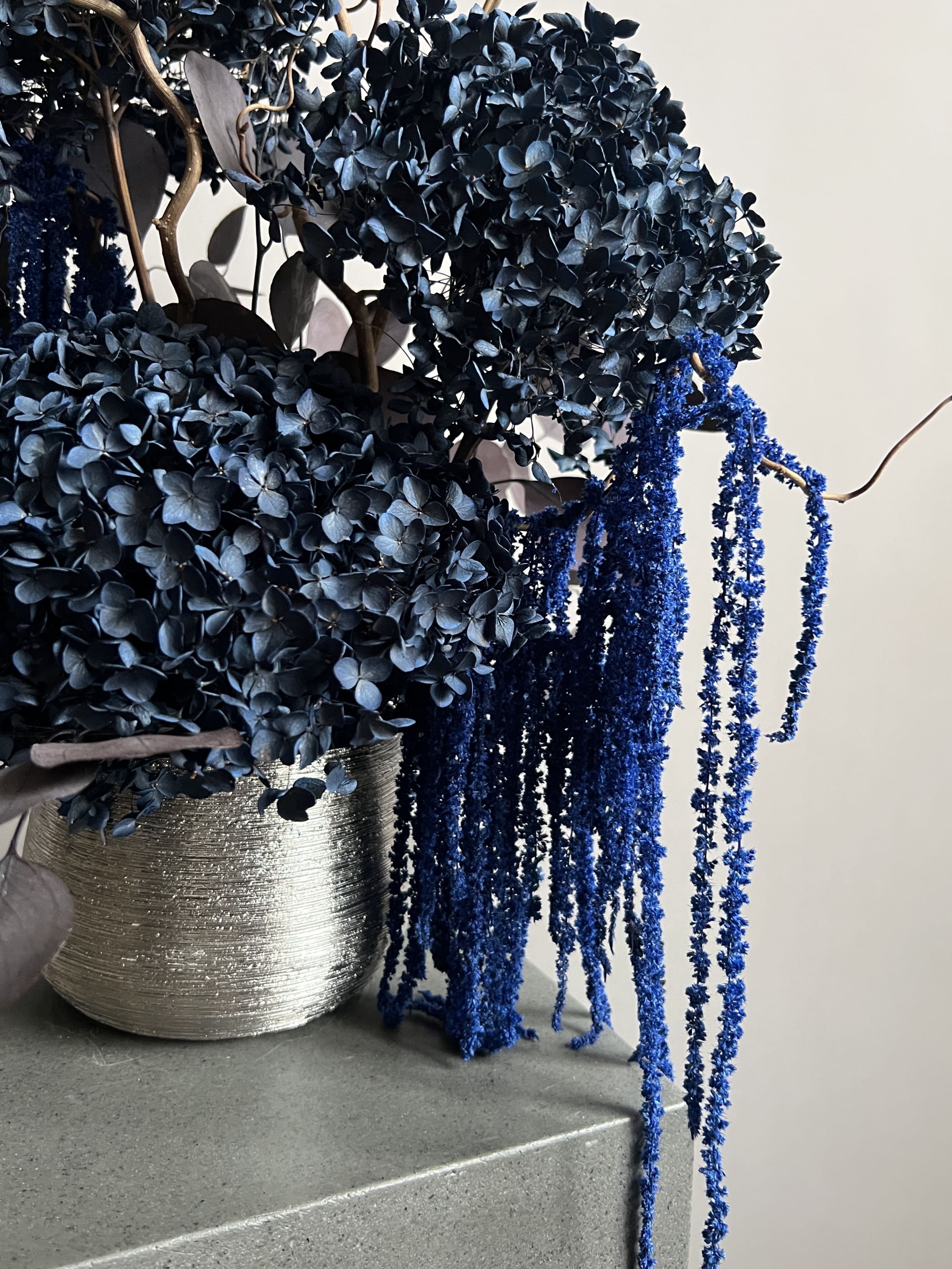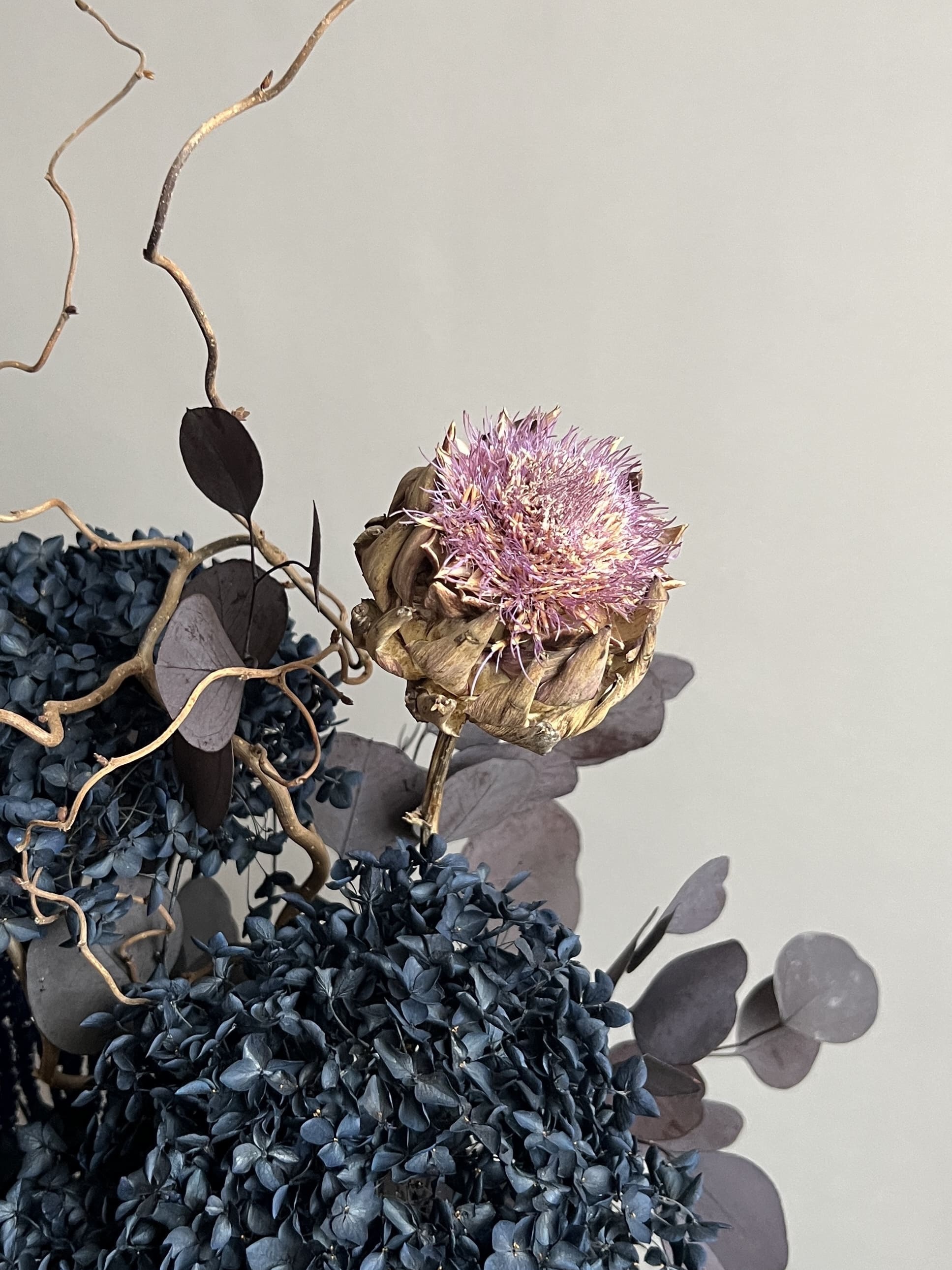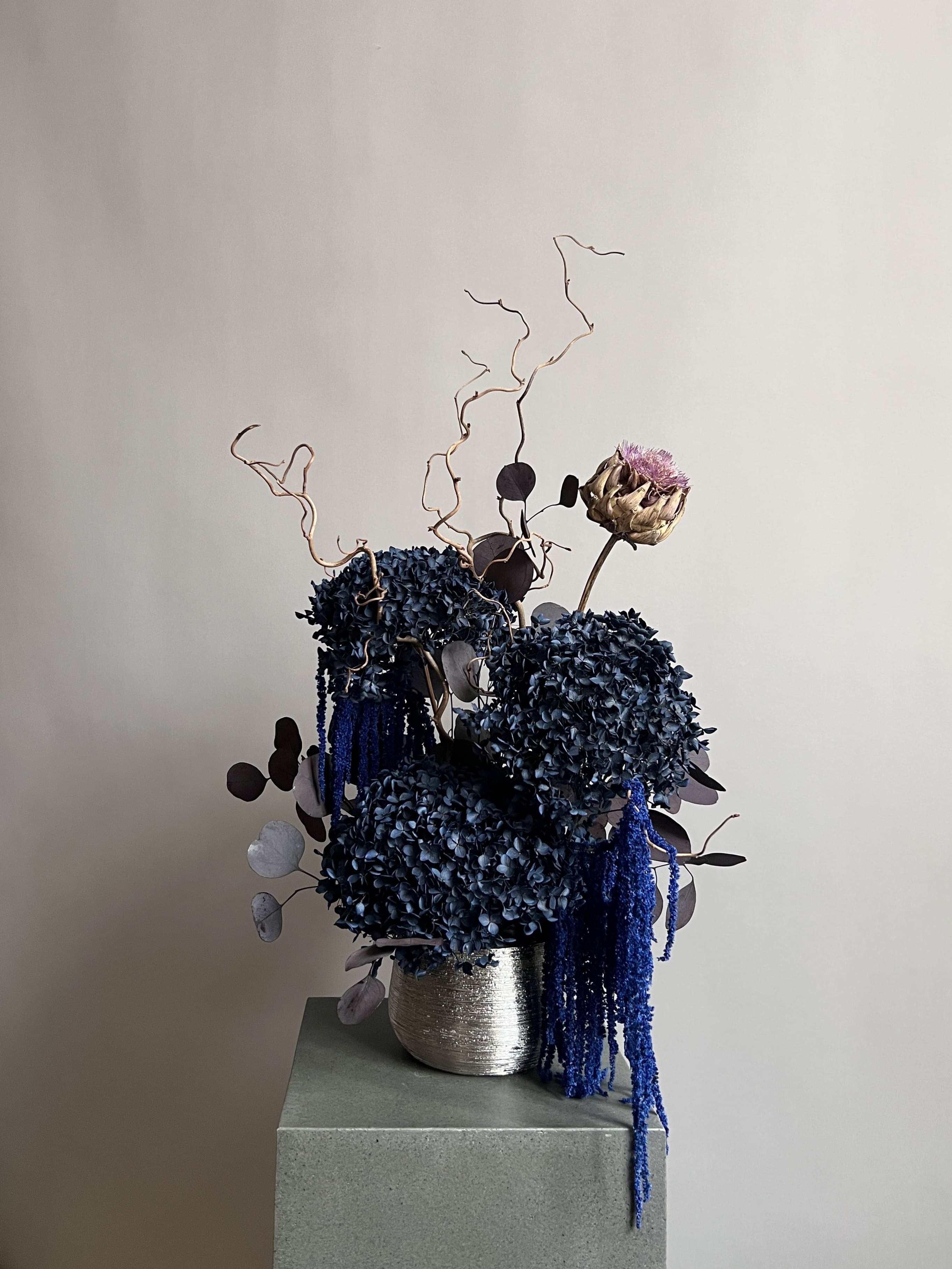 Состав: гортензия стабилизированная синяя, артишок, корилус, амарант стабилизированный синий, эвкалипт стабилизированный Популус, кашпо