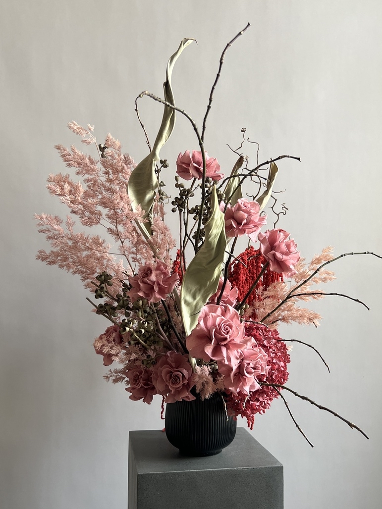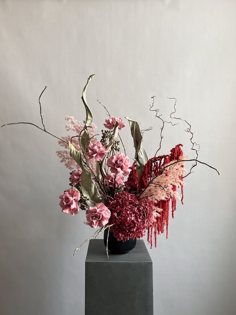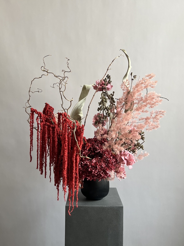 Состав: гортензия стабилизированная, стрелиция, аспарагус стабилизированный, зомби фрукт плоды, корилус, амарант стабилизированный, розы стабилизированные, кашпо керамическое