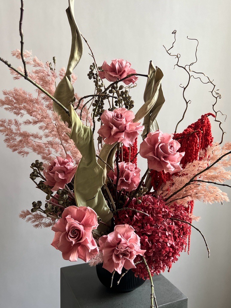 Интерьерная композиция из сухоцветов и стабилизированных цветов в кашпо. Возможно исполнение в другой гамме под индивидуальный запрос