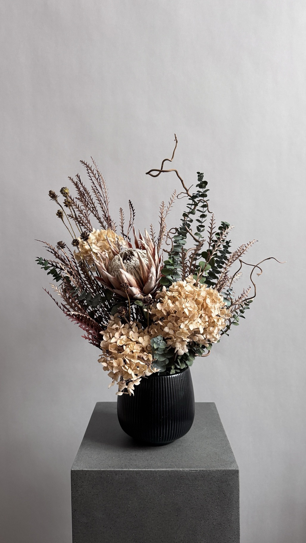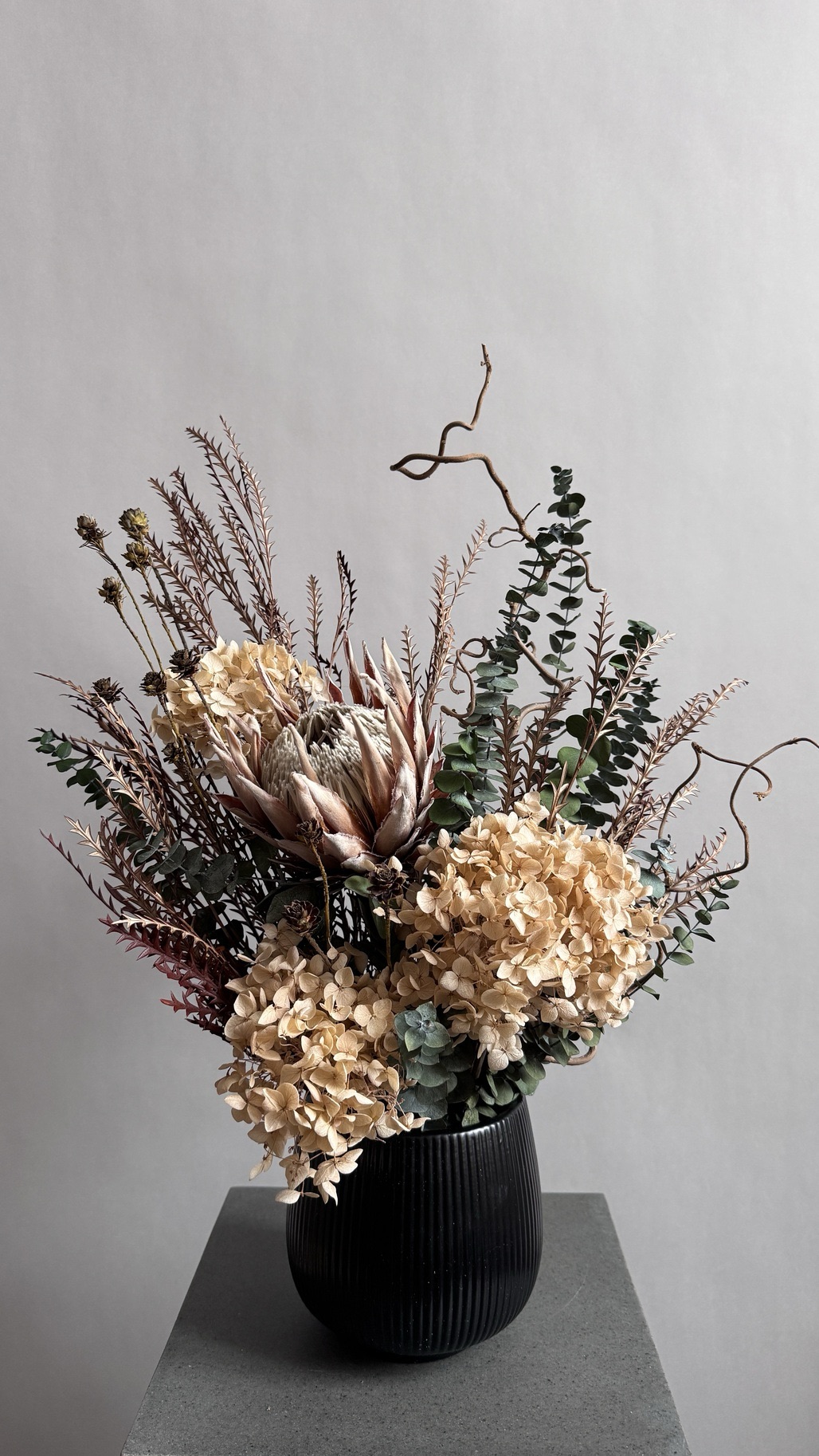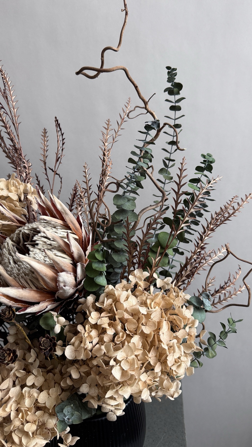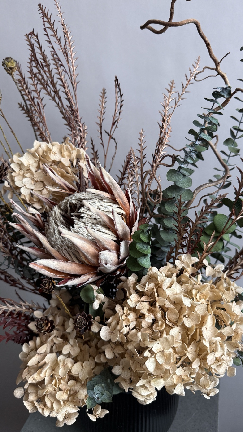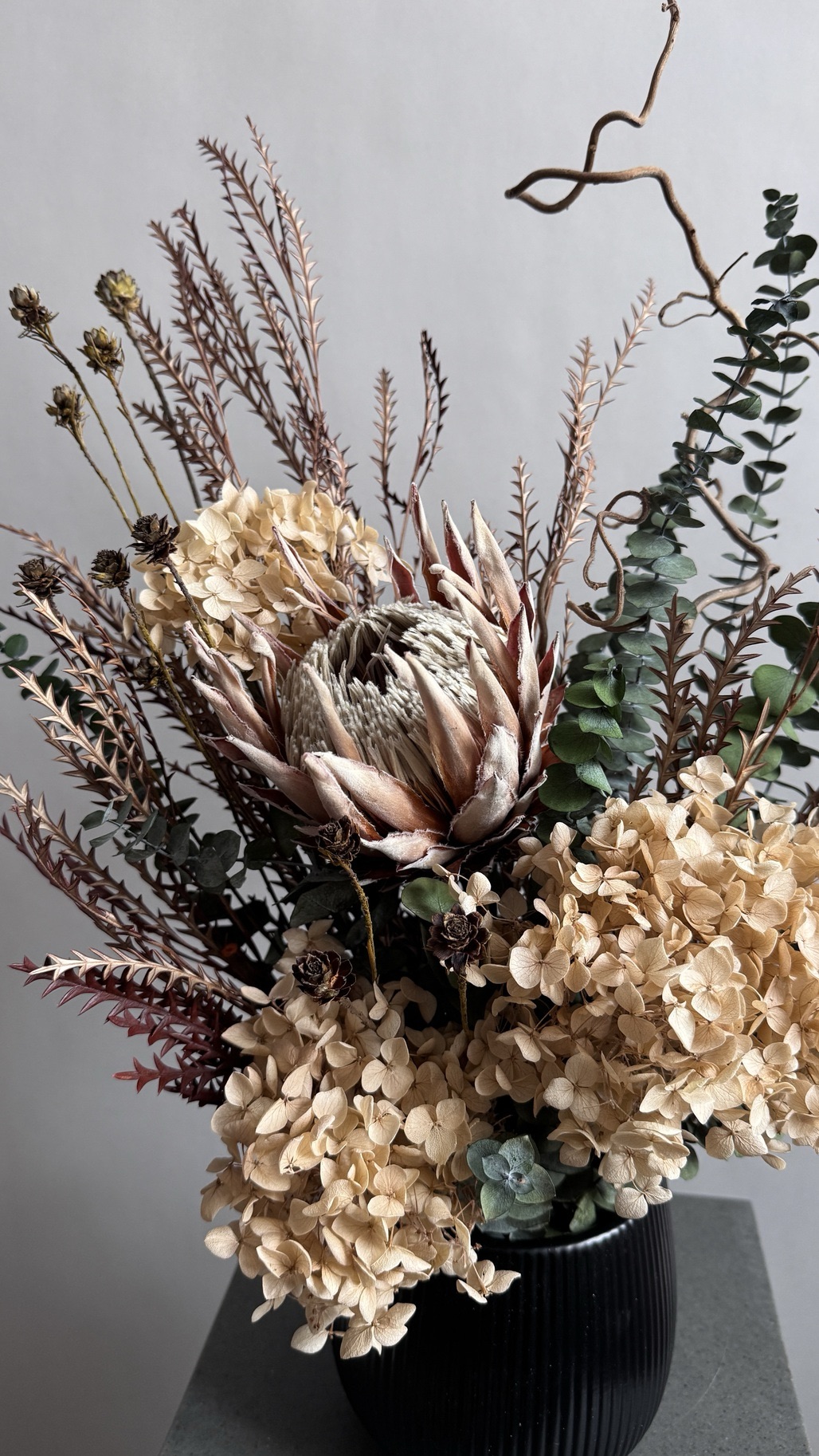 Стильная интерьерная композиция из сухоцветов и стабилизированных цветов в натуральной гамме